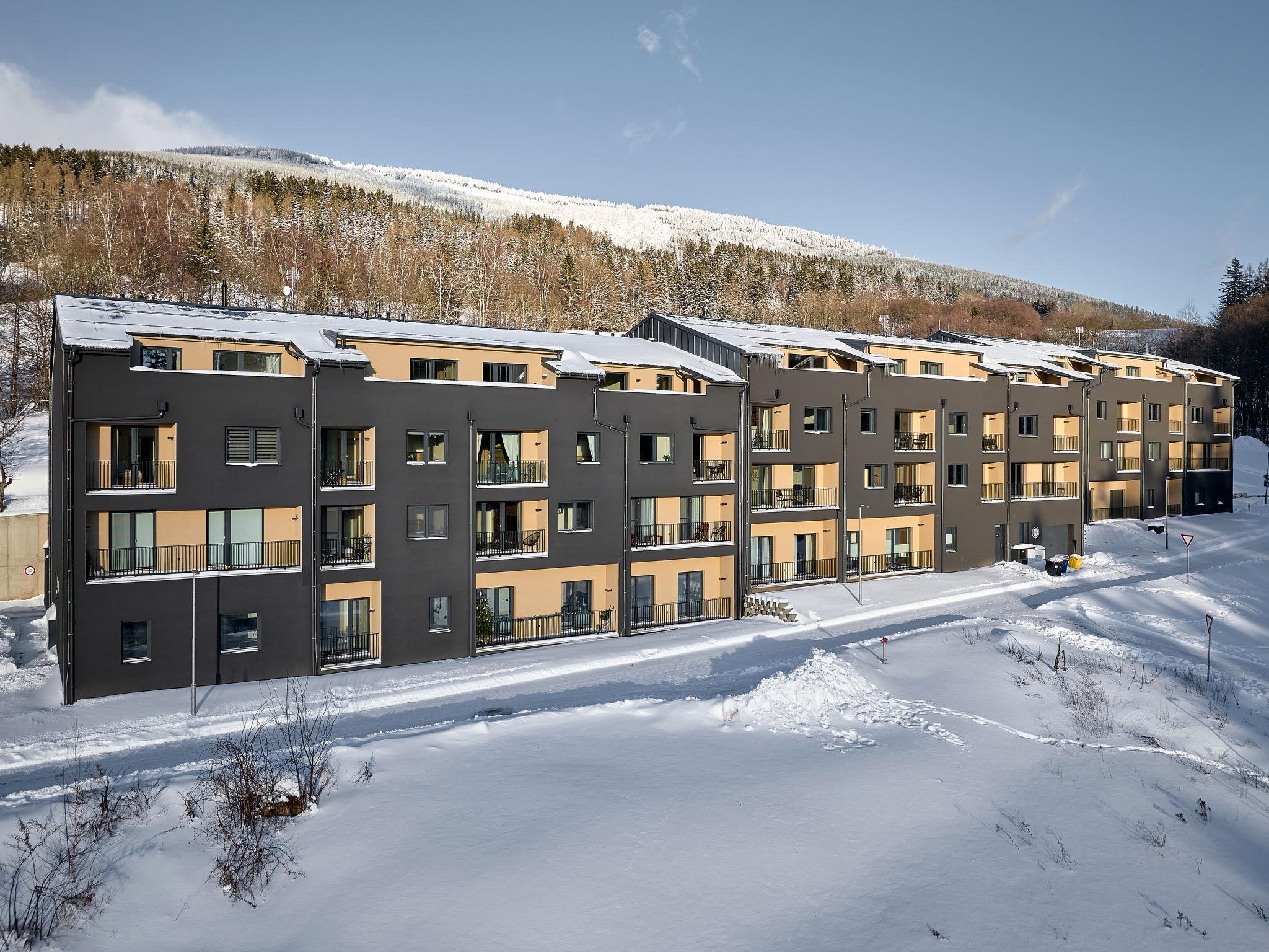 Modern, comfortable apartment block "Cerný Dul", detached. In the centre of Cerný Dul, 900 m from the skiing area. In the house: lift, storage room for skis, central heating system. Parking at the house. Grocery 600 m, bus stop "Cerný dul, námestí" 640 m, indoor swimming pool 25 km. Golf course (18 hole) 12 km, tennis 5 km, walking paths from the house 10 m, cycle lane, ski lift 900 m, chair lift, slopes, ski rental 900 m, ski school, children's ski school, ski-kindergarten. Nearby attractions: Janské Lázne Spa 6 km, Vrchlabí 13 km, Aquapark Trutnov 28 km, Zoo Safari Dvur Králové 32 km, Bozkovské jeskyne 40 km, Adršpašské skály 47 km. Well-known ski regions can easily be reached: Cerný Dul 900 m, Janské Lázne 5 km, Herlíkovice, Pec pod Snežkou. Well-known lakes can easily be reached: Cistá 3.5 km, Vrchlabí 12 km. Hiking paths: Snežka 28 km.