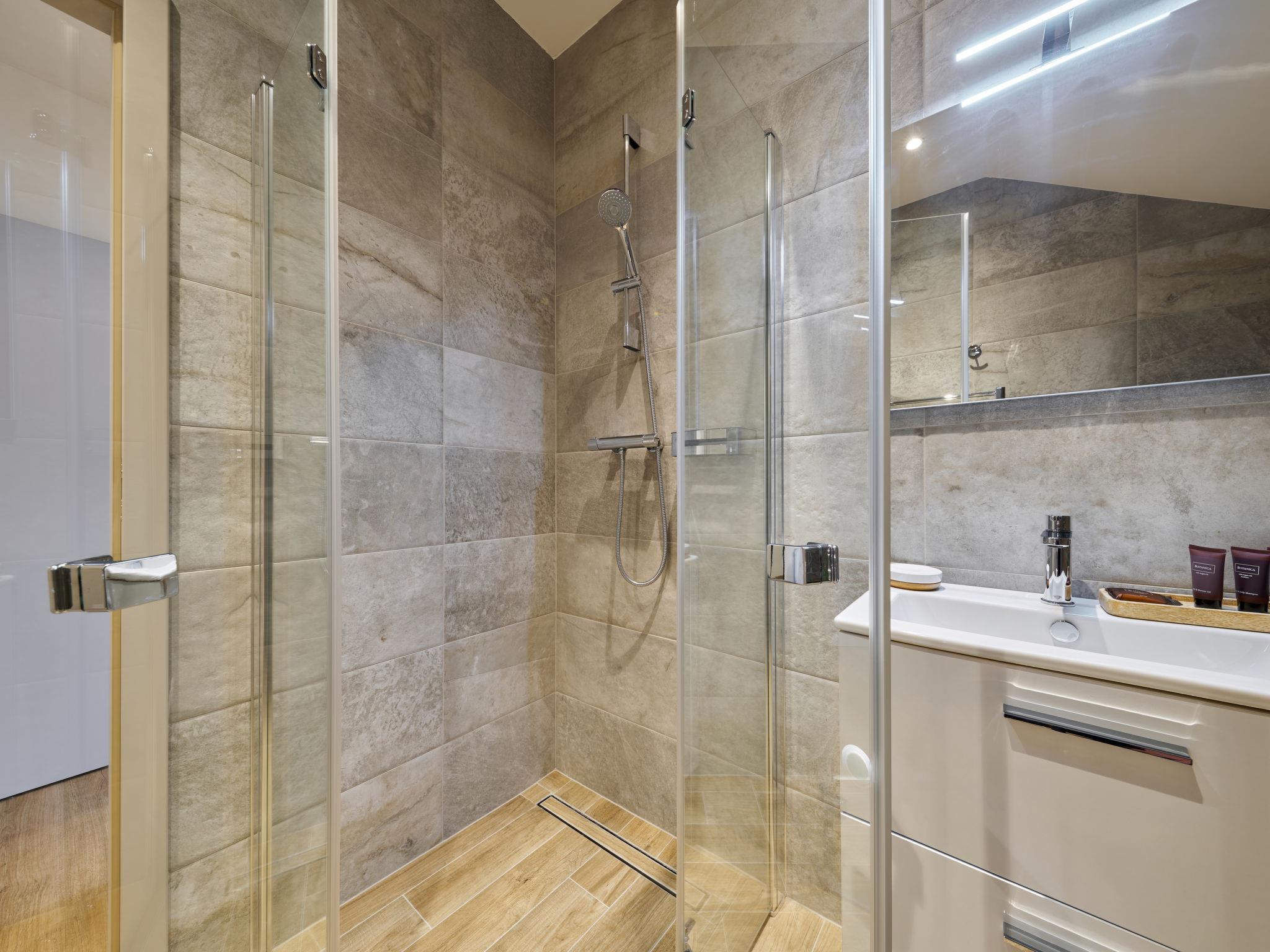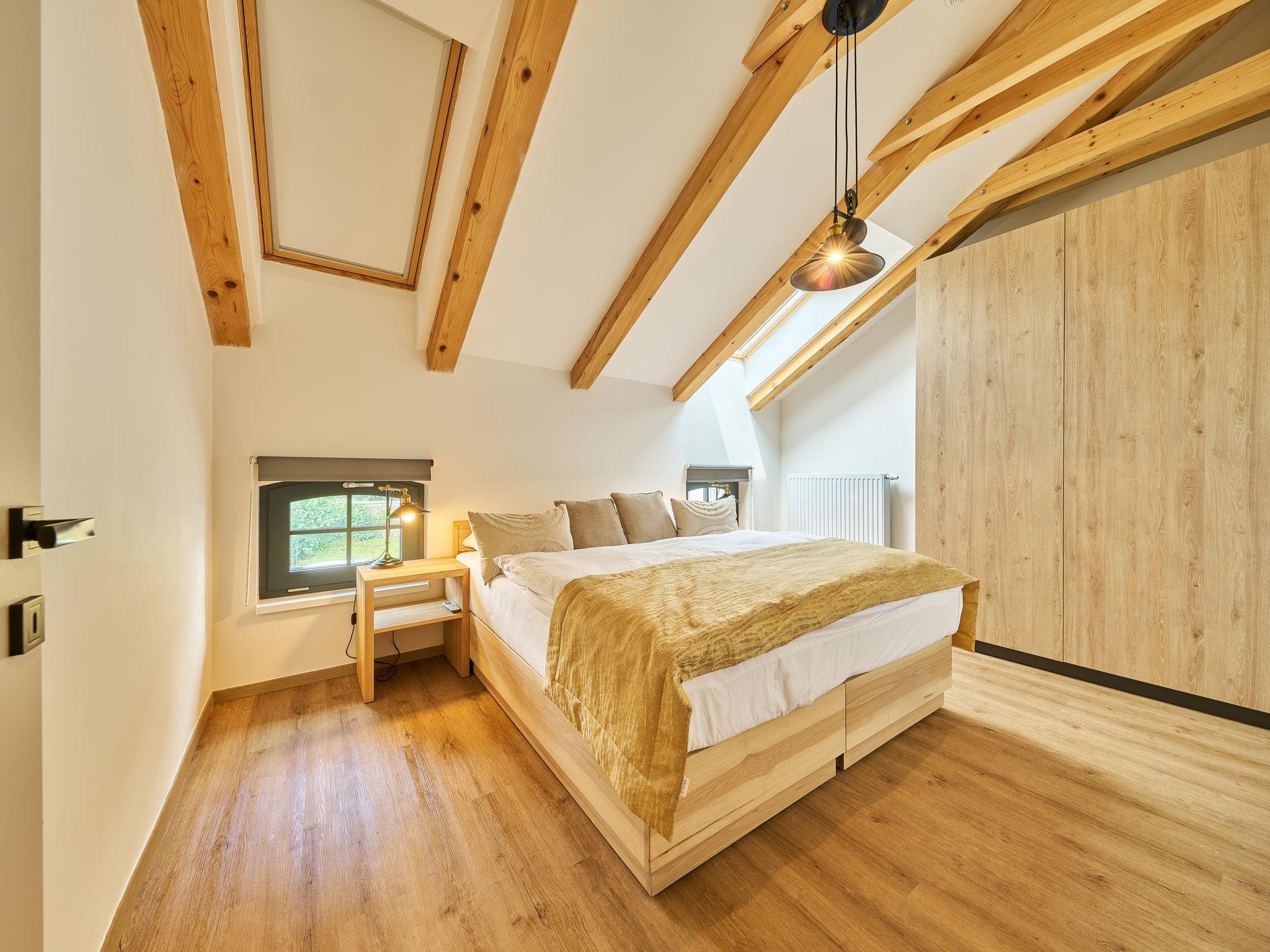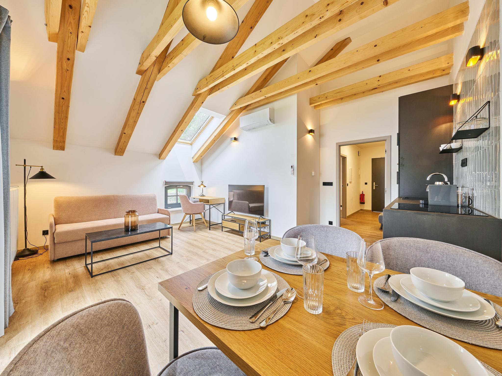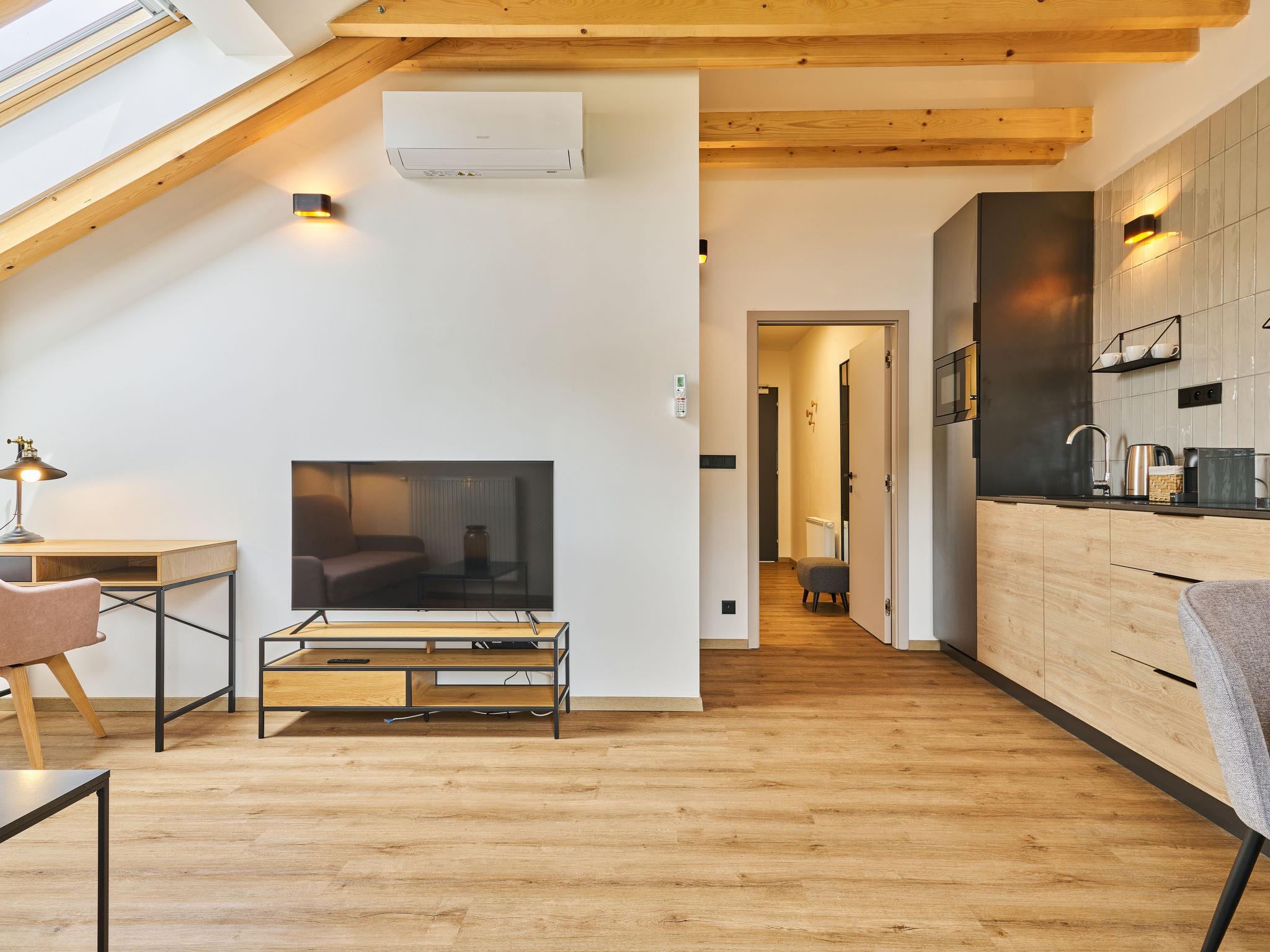 "Luxury Mountain Attic with AC & Netflix", 2-room apartment on the top floor. Very beautiful and stylish furnishings: living/dining room with 1 double sofabed, dining table and TV. 1 room with 1 double bed. Kitchenette (dishwasher, 4 ceramic glass hob hotplates, toaster, kettle, microwave, freezer, electric coffee machine). Shower/WC. Air-conditioning. Box-room. Facilities: washing machine, safe, iron, children's high chair, baby cot, hair dryer. Internet (WiFi, free). Parking at the house. Suitable for families.