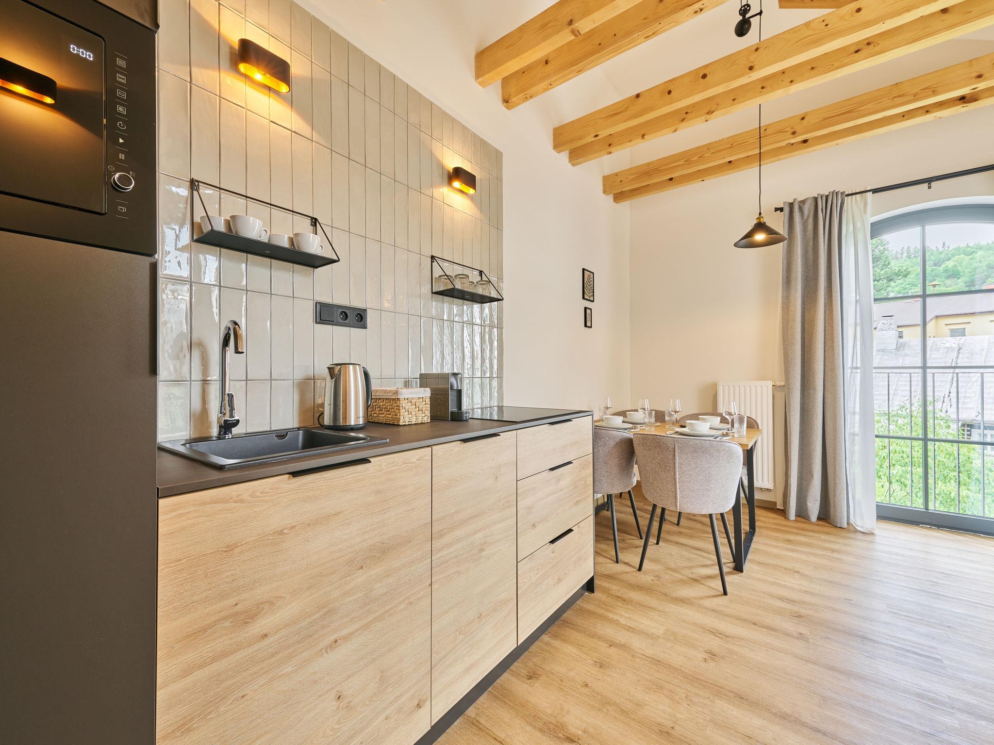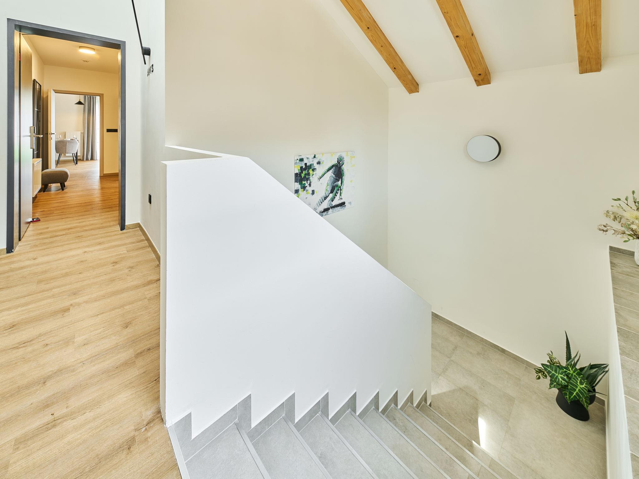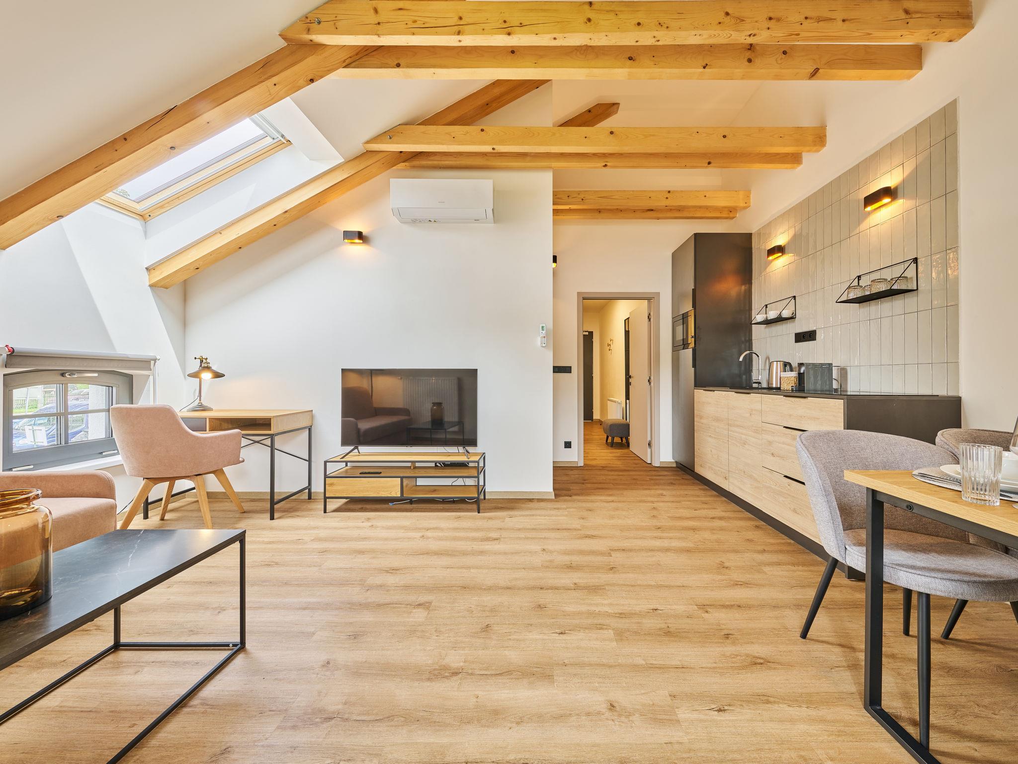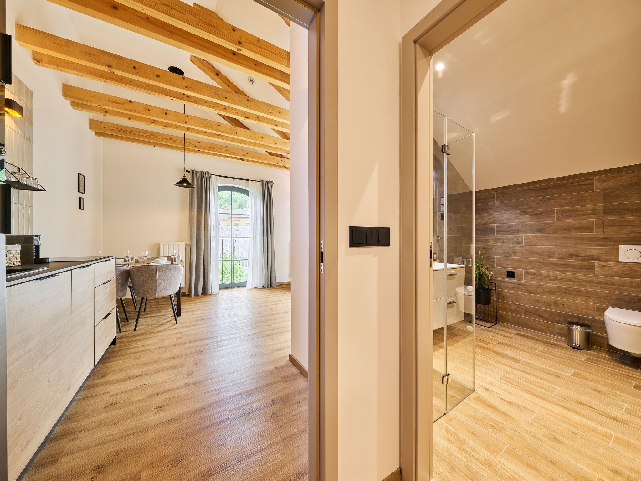 "Luxury Mountain Attic with AC & Netflix", 2-room apartment on the top floor. Very beautiful and stylish furnishings: living/dining room with 1 double sofabed, dining table and TV. 1 room with 1 double bed. Kitchenette (dishwasher, 4 ceramic glass hob hotplates, toaster, kettle, microwave, freezer, electric coffee machine). Shower/WC. Air-conditioning. Box-room. Facilities: washing machine, safe, iron, children's high chair, baby cot, hair dryer. Internet (WiFi, free). Parking at the house. Suitable for families.