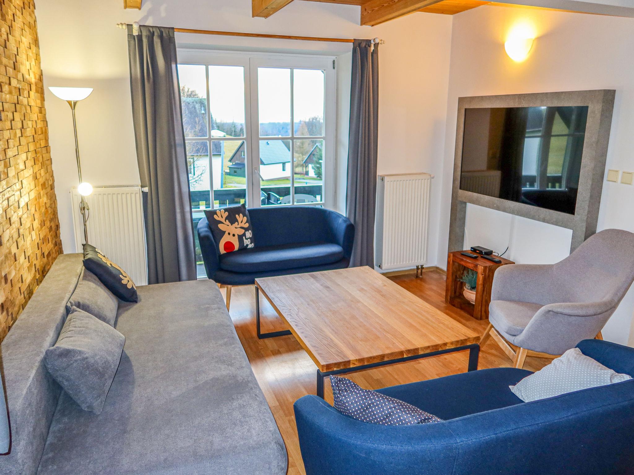 Cistá v Krkonoších 2 km from Cerný Dul: Child friendly, beautiful, comfortable holiday village "Holiday Hill 59", 500 m a.s.l., surrounded by trees and meadows. 43 houses in the resort. On the outskirts, in a secluded, quiet, sunny position, 1.5 km from the lake, 3 km from the skiing area, in the countryside. For shared use: property 6 ha, meadow, swimming pool heated (9 x 4 m, depth 120 cm, seasonal availability: 15.May. - 30.Sep. pool opening hours: 09:00-20:00). Shower/WC in the pool area, table tennis, children's playground (swing, sandbox). In the complex: reception, central heating system. Parking (for 2 cars) at the house. Shop 2.5 km, grocery 2.5 km, supermarket 7.5 km, restaurant 1.6 km, pub garden 400 m, bus stop "Cerný Dul, Cistá-pošta" 400 m, grass beach 1.5 km (small), indoor swimming pool 19 km. Golf course (18 hole) 14 km, tennis 2.5 km, sports centre 2.5 km, walking paths from the house, cycle lane 100 m, ski lift 3 km, chair lift 3 km, slopes 3 km, ski school 3 km, children's ski school 3 km, sled run 7 km, cross country ski track 100 m. Nearby attractions: Janské Lázne Spa 9 km, Vrchlabí 10 km, Aquapark Trutnov 25 km, Zoo Safari Dvur Králové 29 km, Bozkovské jeskyne 37 km, Adršpašské skály 44 km. Well-known ski regions can easily be reached: Cerný Dul 3 km, Herlíkovice 15 km, Pec pod Snežkou 22 km. Well-known lakes can easily be reached: Cistá 1.5 km, Vrchlabí 9 km. Hiking paths: Snežka 25 km.