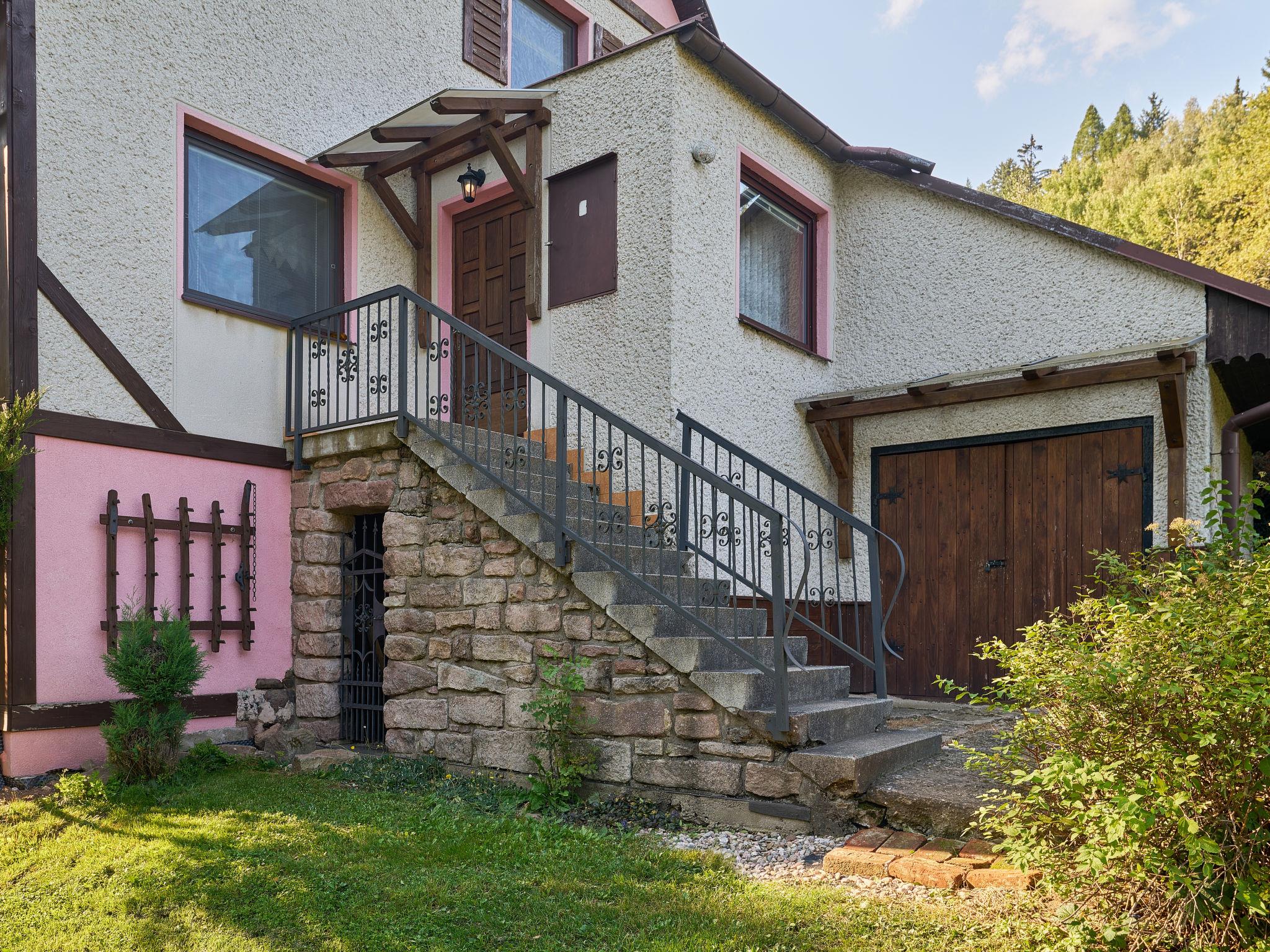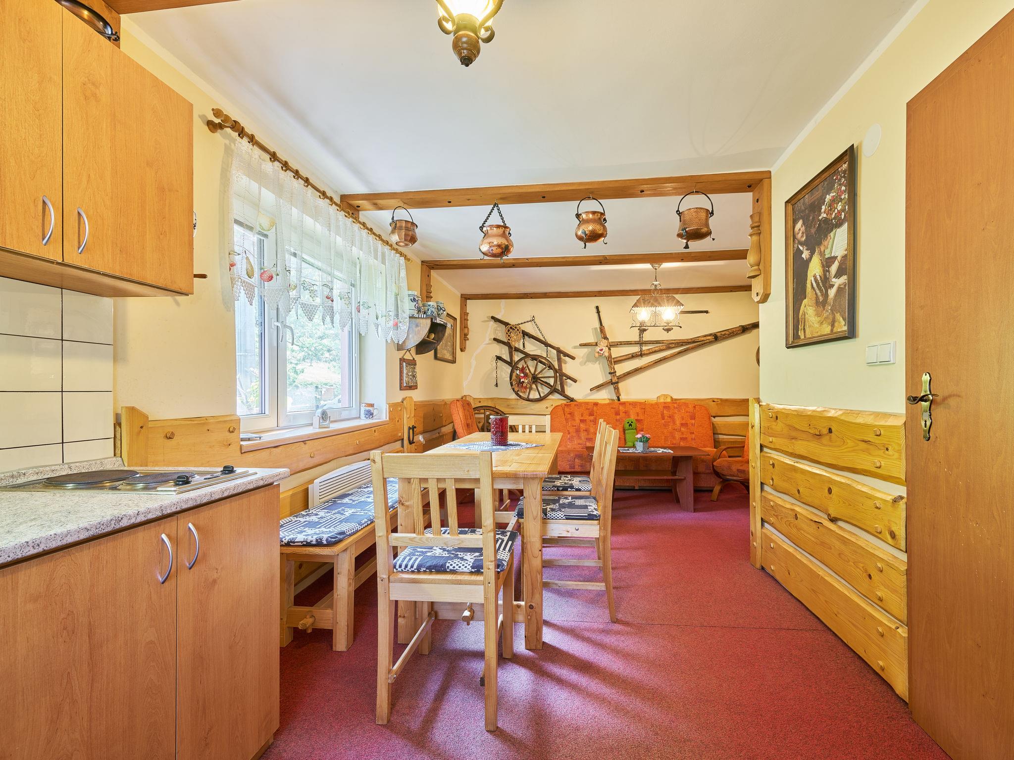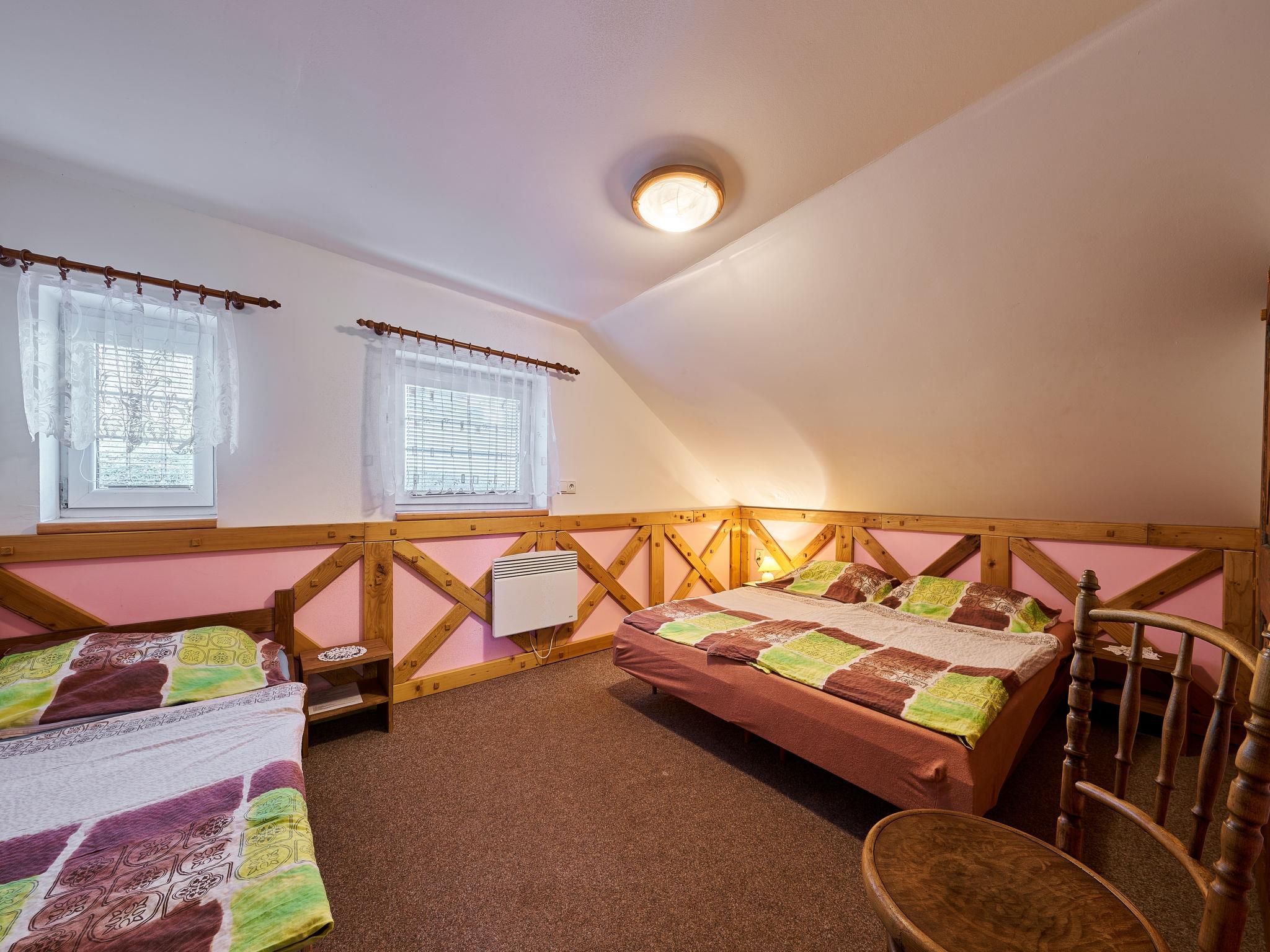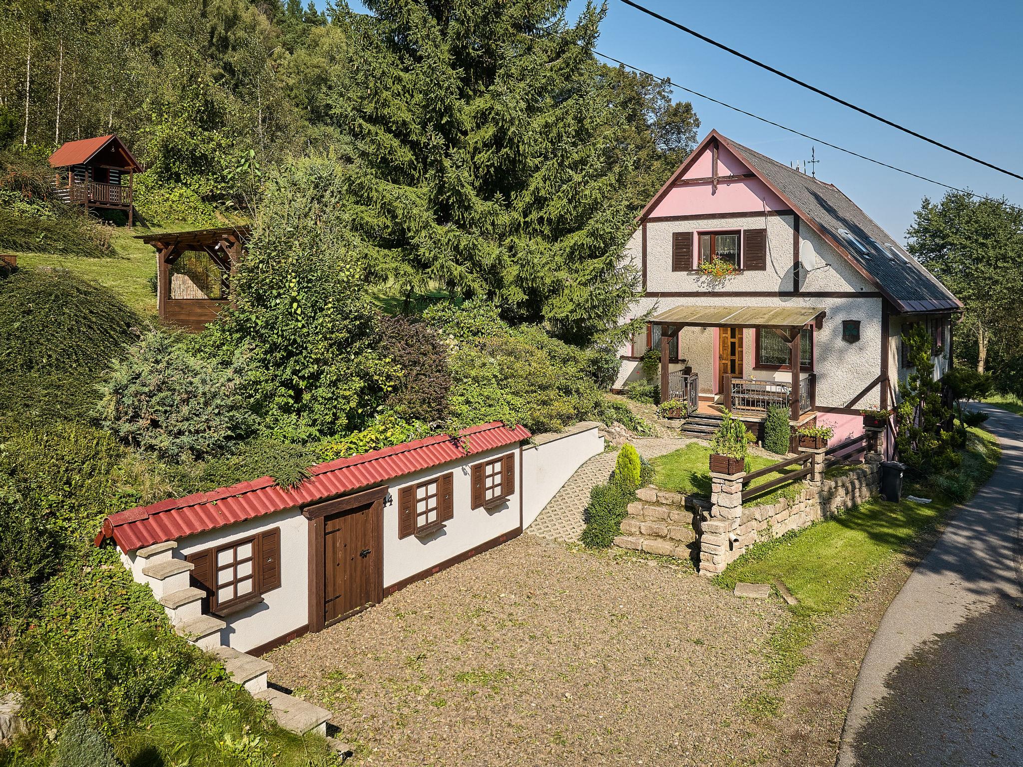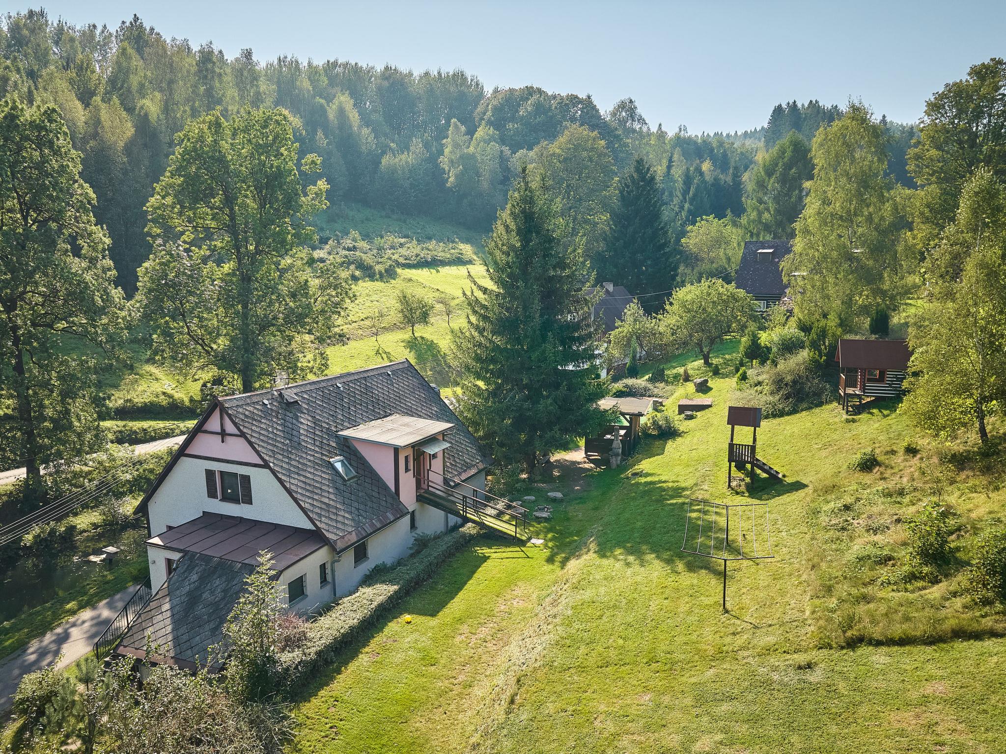 Chlívce 8 km from Hronov: Cosy country house "Chlívce u Hronova", 2 storeys, detached. Outside the resort, in a quiet, elevated position. For shared use: property 1'000 m2, swimming pool round (4,60 m diameter, seasonal availability: 01.Jul. - 31.Aug.). Arbour, garden furniture, barbecue, fireplace, barbecue house, children's playground, parking at the house. Shop 3.5 km, shopping centre 8 km, restaurant 250 m, bus stop "Chlívce" 500 m, railway station "Hronov, Cervený Kostelec" 8 km, outdoor swimming pool 9 km, indoor swimming pool 35 km, natural swimming pond 4 km. Ski lift, slopes 200 m, cross country ski track 10 m. Nearby attractions: Muzeum Aloise Jiráska/Hronov 8 km, Adršpašsko-teplické skály 17 km, Broumovské steny, Náchod 17 km, Ratiborice a Babiccino údolí 20 km, Broumov 28 km, Relaxpark Pec pod Snežkou 50 km. Well-known ski regions can easily be reached: Radvanice 10 km, Petrikovice 16 km, Mladé Buky 34 km, Janské Lázne 40 km. Well-known lakes can easily be reached: vodní nádrž Rozkoš 25 m. Children's house in the garden. It is possible to arrange meals in a private club, which is at a distance of 250 m (on request). This cottage can be rented as a whole house or separately as 4 fully equipped apartments in the low season.