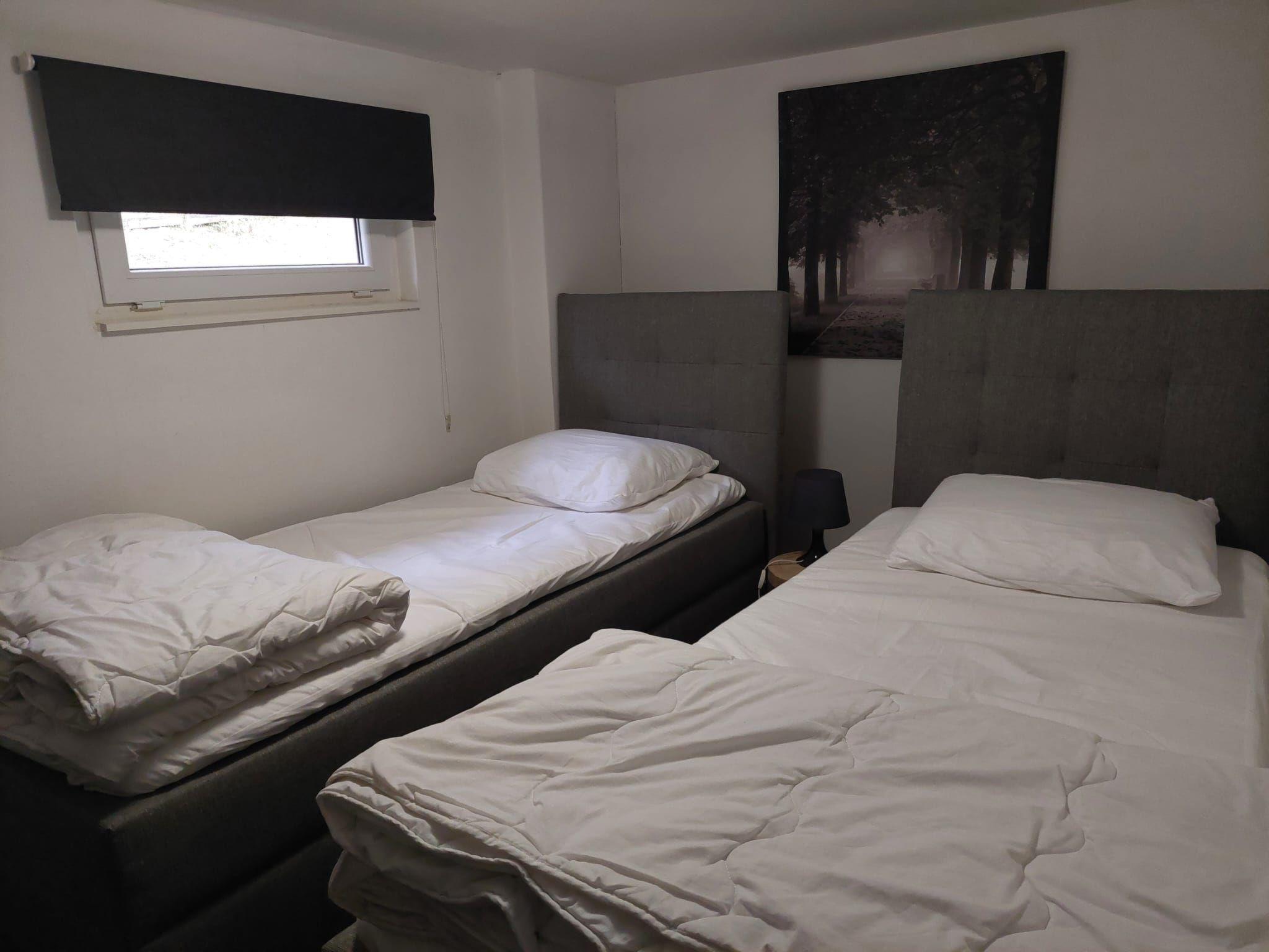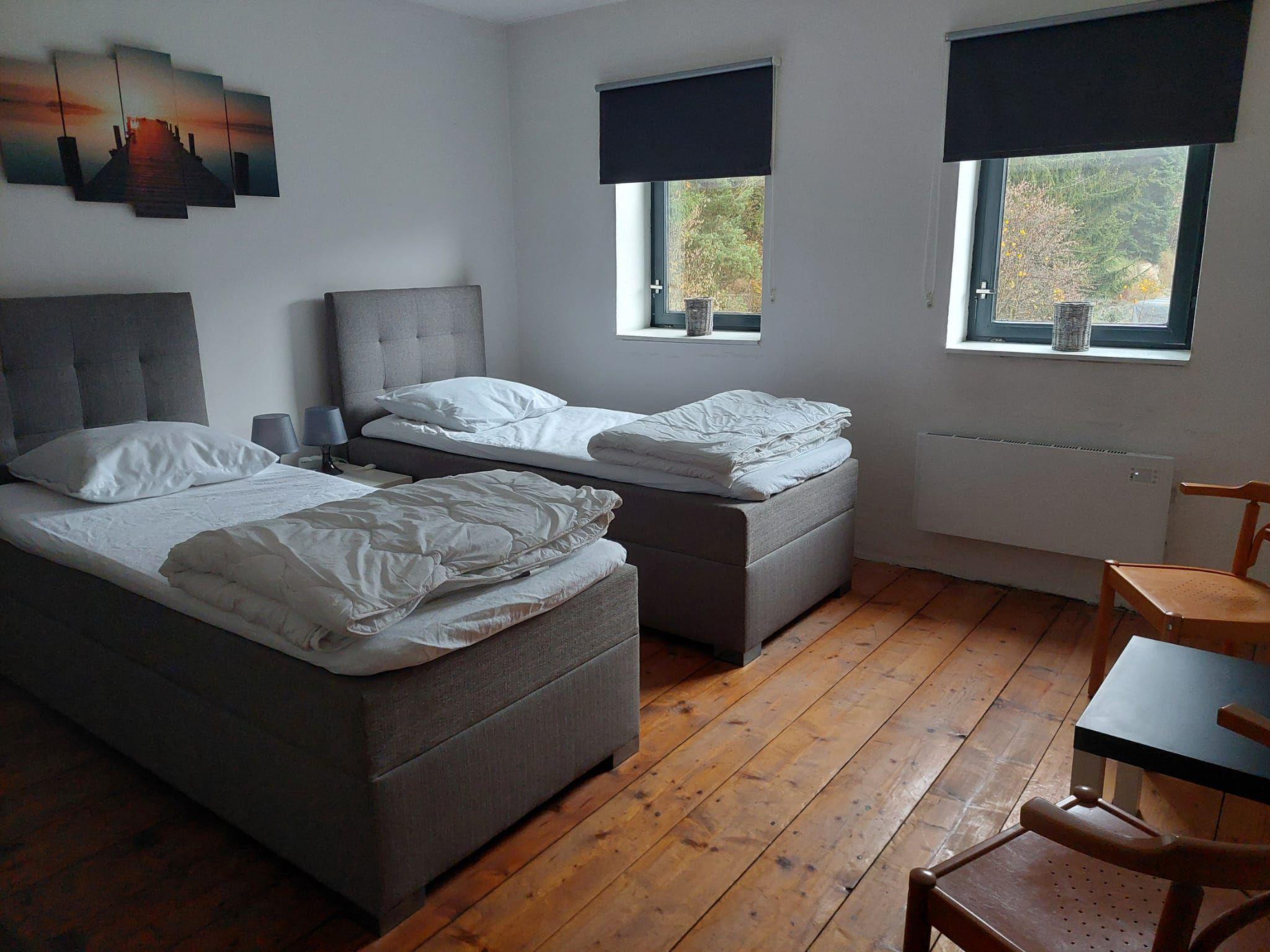 The ground floor of the house has a living room with an open kitchen, a toilet, a shower, a bedroom and a storage room. The living room includes a dining space with a table and chairs, a sofa corner with satellite TV, a DVD player and a wood-burning stove. The kitchen is equipped with a microwave, electric stove with an oven, a fridge, a coffee and tea. The shower with a thermostat is spacious and there is also a washing machine. The toilet is separate. The first bedroom has two single beds (90 x 200cm). There is also a storage space on the ground floor. The upper floor has two further storage rooms and two bedrooms, the first with a double bed (160 x 200cm) and a single bed (90 x 200cm), while the second has three single beds (90 x 200cm). The whole house is heating with electric radiators and the fireplace stove.