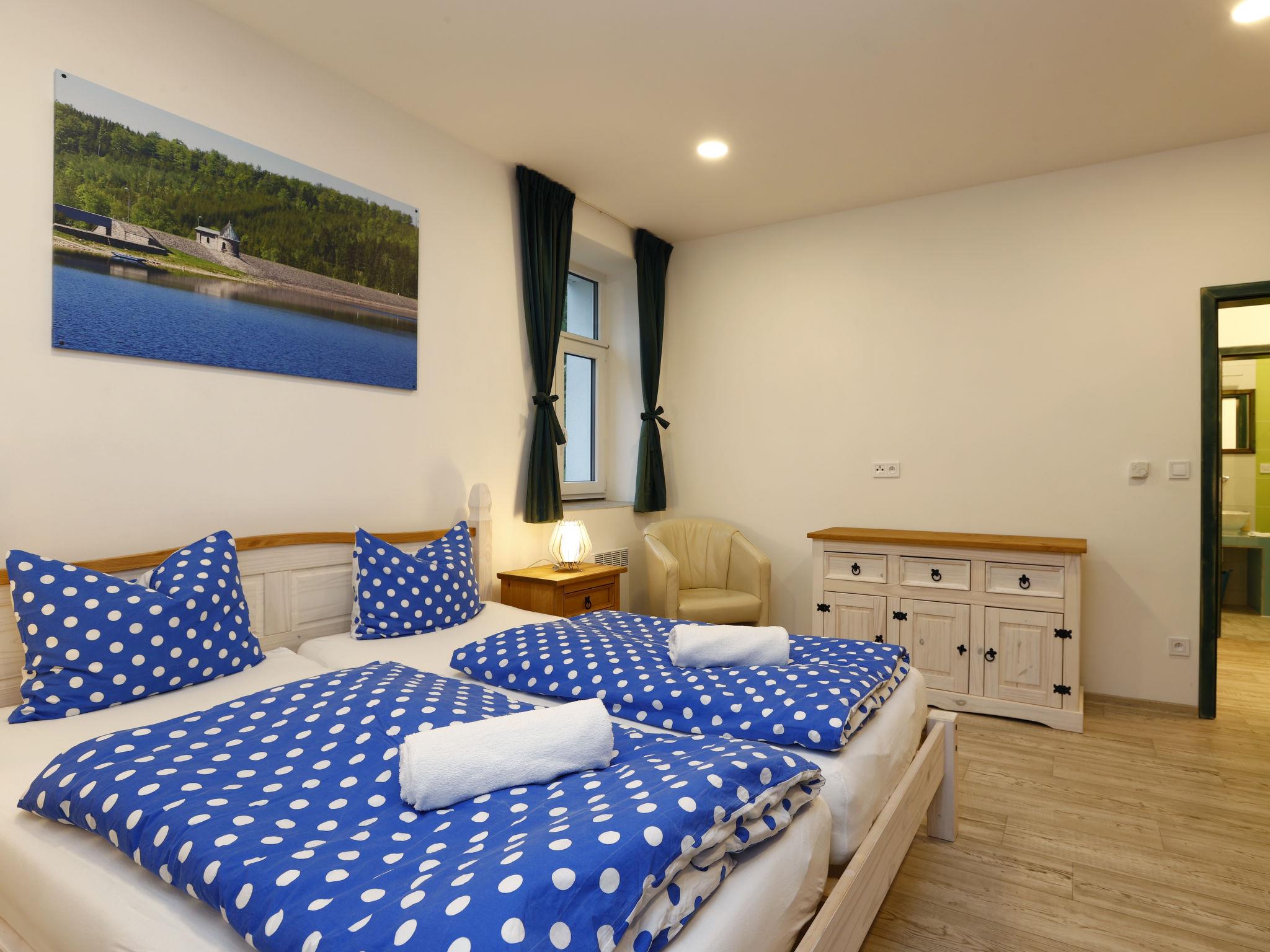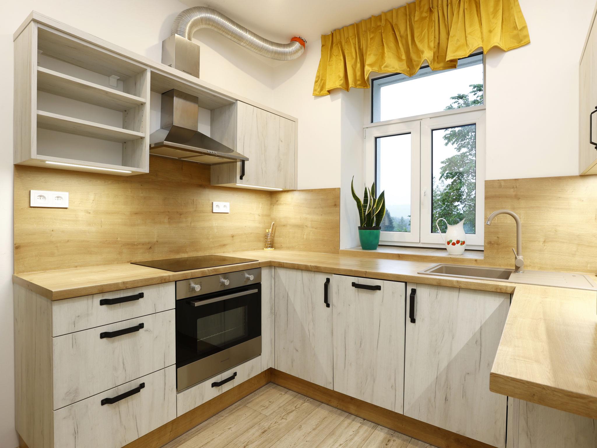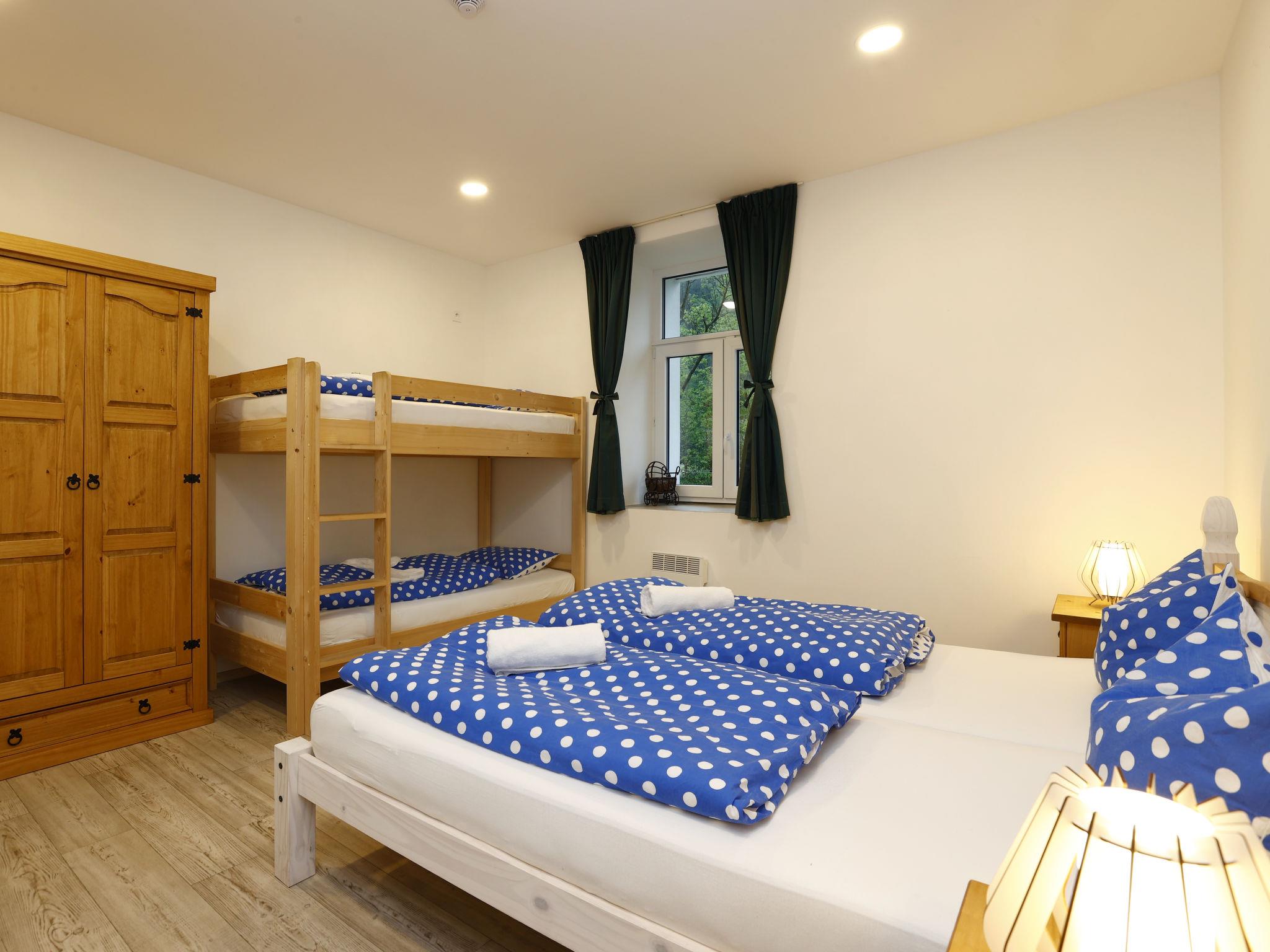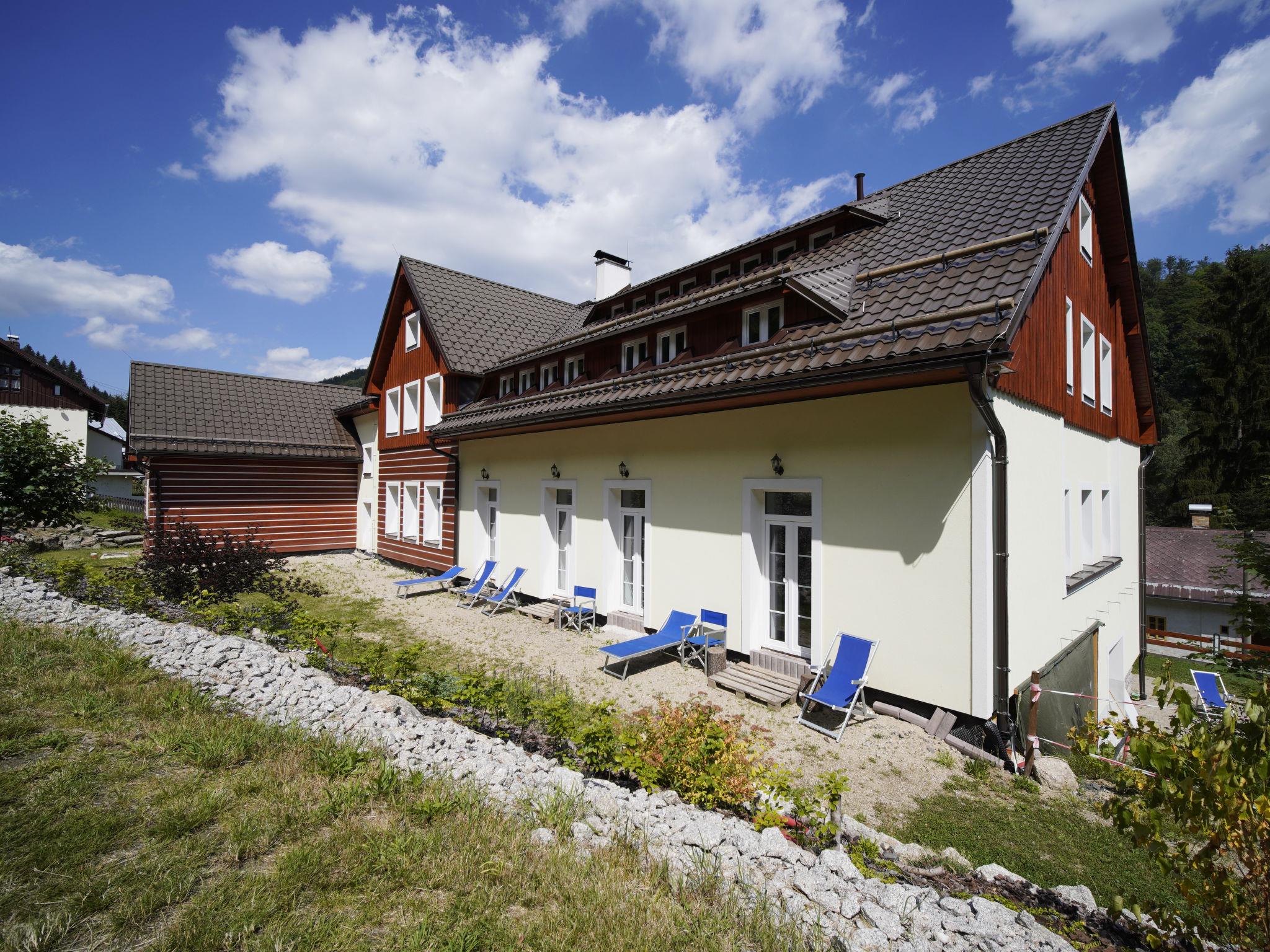 Child friendly, modern apartment block "Pod Mariánskými schody". 10 apartments in the property. 5 km from the skiing area, 100 m from the river. For shared use: property. Garden furniture, barbecue, fireplace, children's playground (slide, sandbox). In the complex: hot tub, table tennis, billiard table, playroom, table football, trampoline, storage room for bicycles, storage room for skis, central heating system, washing machine, ski boot dryer. Parking on the premises, extra. Shop 2 km, supermarket 7 km, restaurant 2.5 km, bar 2.5 km, bakery 2.5 km, bus stop "Desná centrum" 2.5 km, railway station "Desná centrum" 2 km. Walking paths from the house 500 m, ski lift 6 km, ski rental 6 km, ski school 6 km, children's ski school 6 km, cross country ski track. Nearby attractions: Protržená prehrada 6 km, Mariánské schody 400 m, Rozhledna Svetlý vrch 2 km, Skokanské mustky Desná 850 m, Vodopády na Cerné Desné 5 km, Riedlova hrobka Desná 3 km. Well-known ski regions can easily be reached: ski area Albrechtice 6 km, ski area Cerná rícka 6 km, ski area Špicák 7 km. Well-known lakes can easily be reached: prehrada Souš 7.5 km. Hiking paths: Jizerka 16 km, Mariánská hora 2 km. Please note: suitable for families.
