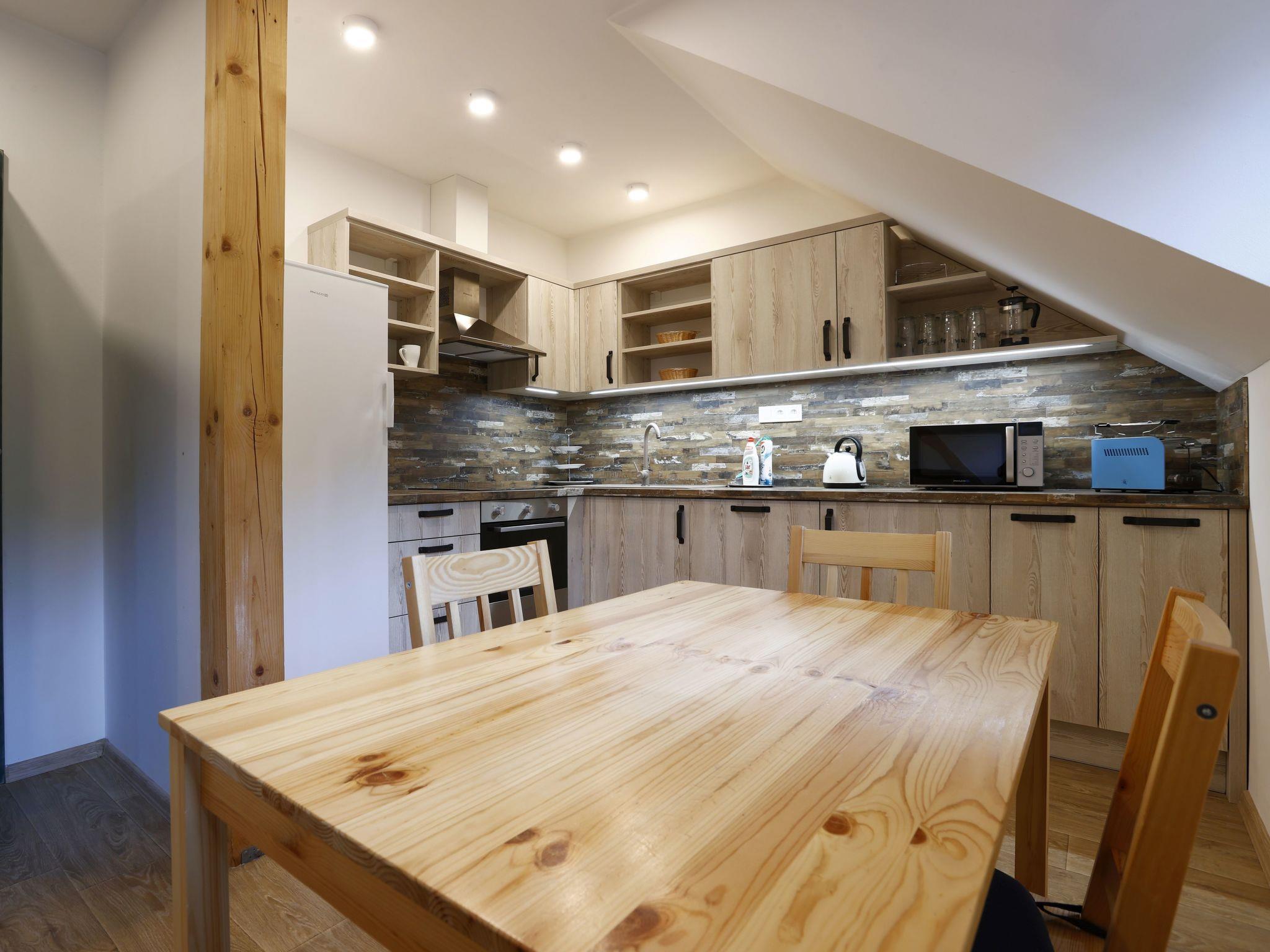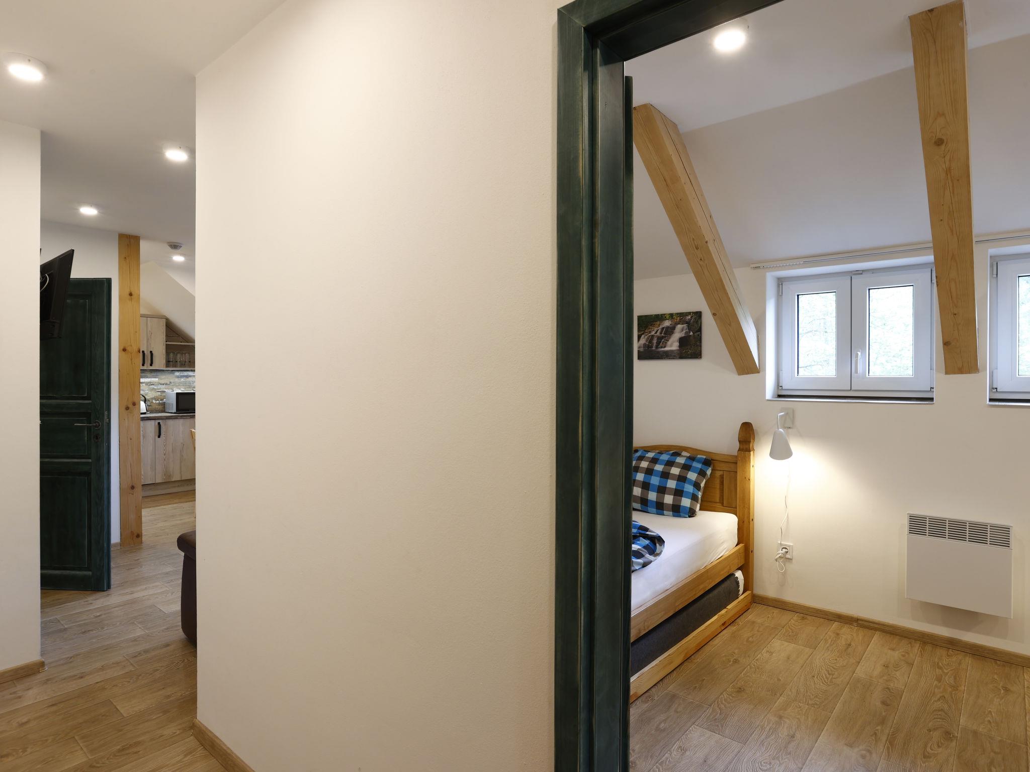 "Mumlavský vodopád", 3-room apartment 63 m2. Modern furnishings: living/dining room with 2 double sofabeds, dining table and TV. 1 room with 1 bed and 1 double bed. 1 room with 2 beds and 2 pull-out beds. Kitchenette (oven, dishwasher, 4 ceramic glass hob hotplates, toaster, kettle, microwave, freezer). Bath/WC. Electric heating, floor heating, boiler. Facilities: washing machine (extra). Dryer (extra), children's high chair, baby cot, hair dryer, baby changing unit. Internet (WiFi). Parking (extra). Suitable for families.