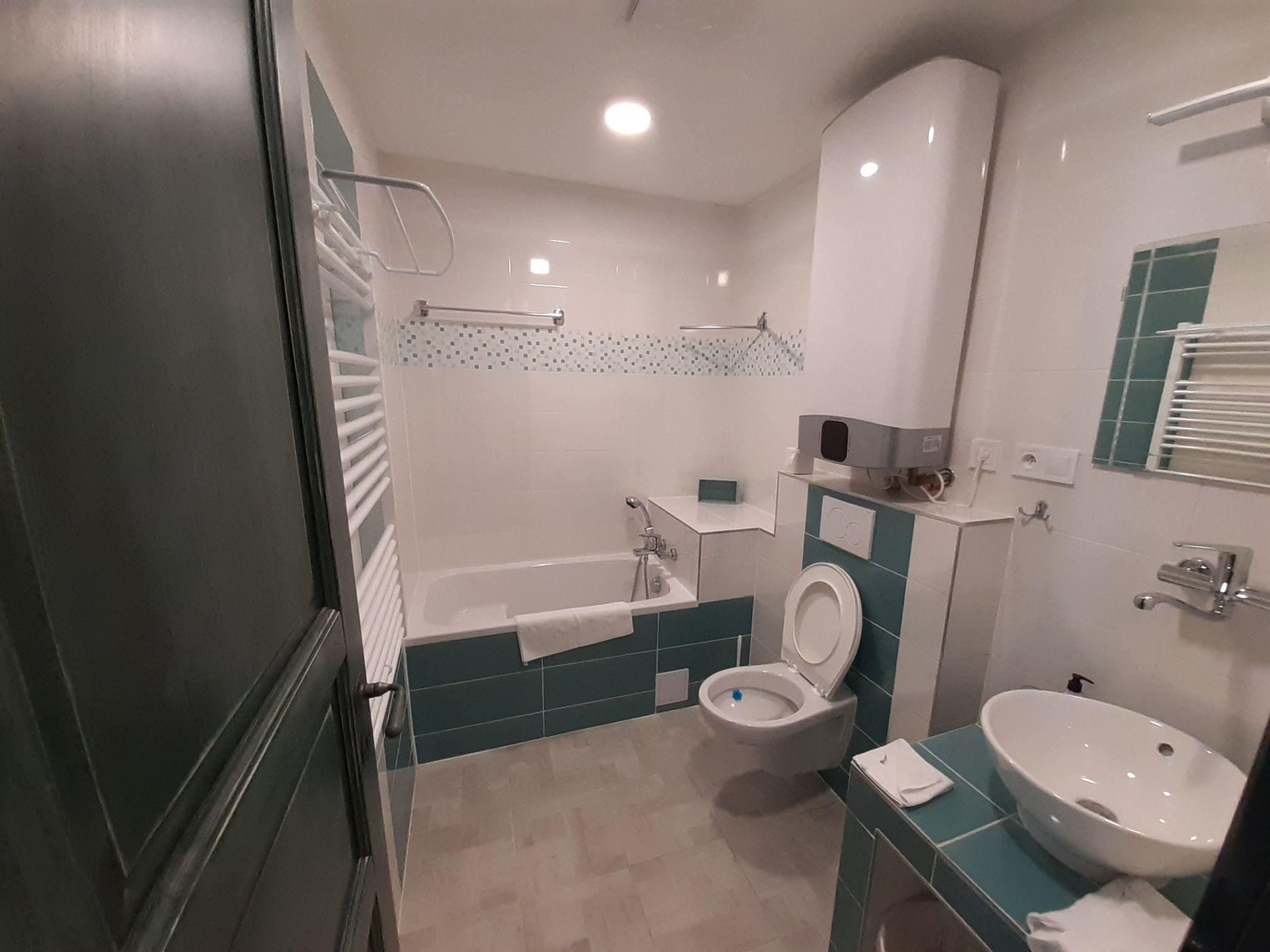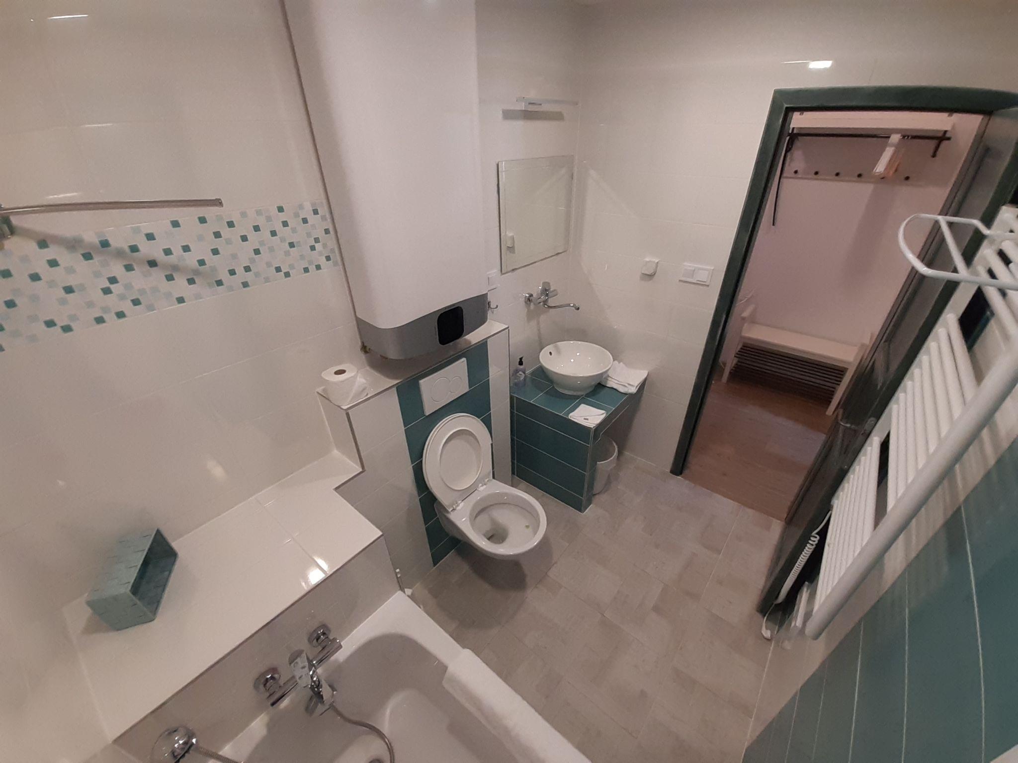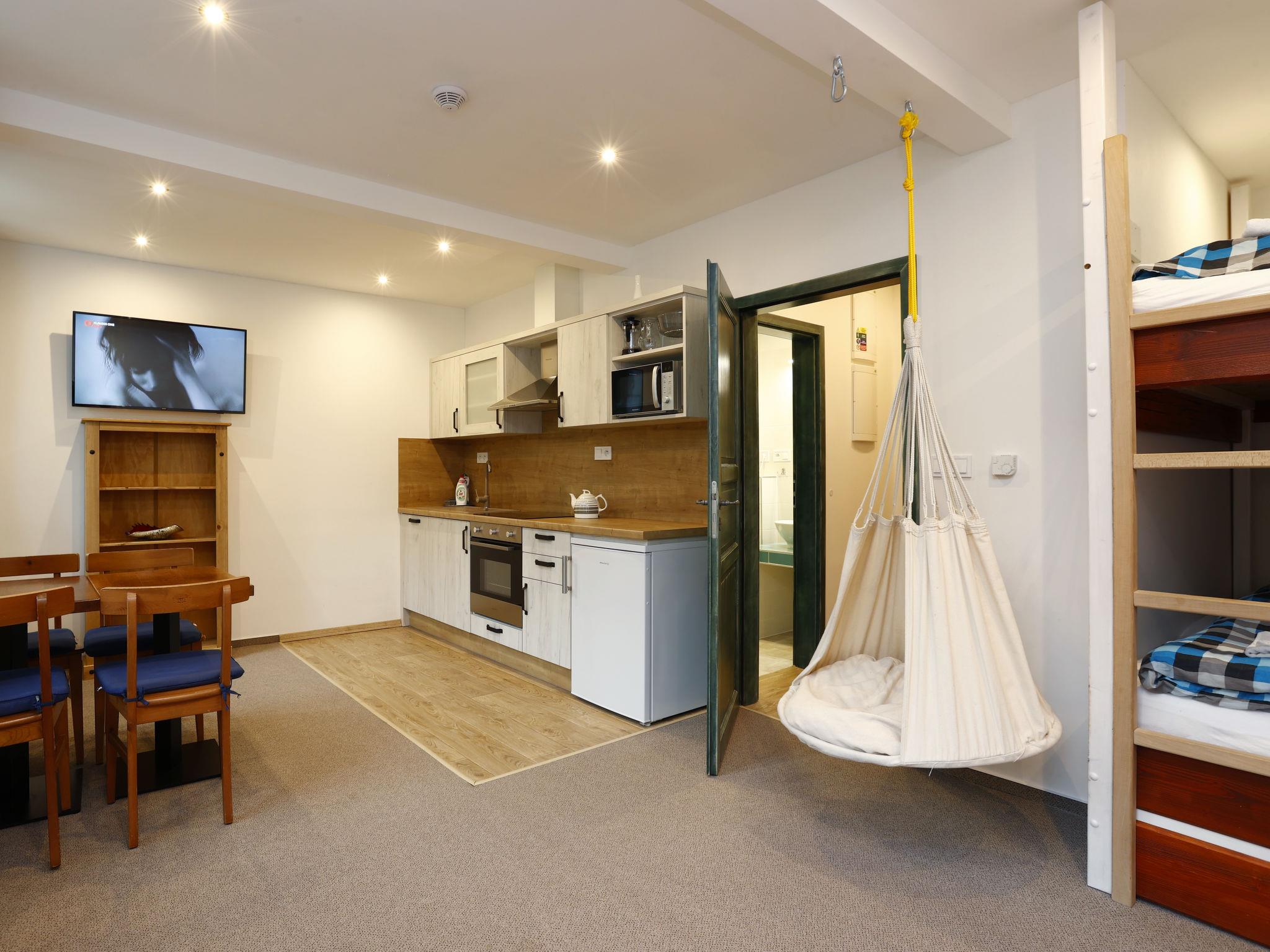 "Safírový potok", 1-room studio 31 m2. Modern furnishings: living/dining room with 1 double sofabed and 1 x 2 bunk beds, 1 double bed, dining table and TV. Kitchenette (oven, dishwasher, 4 ceramic glass hob hotplates, kettle, microwave, freezer). Bath/WC. Electric heating, floor heating, boiler. Facilities: washing machine (extra). Dryer (extra), children's high chair, baby cot, hair dryer, baby changing unit. Internet (WiFi). Parking (extra). Suitable for families.