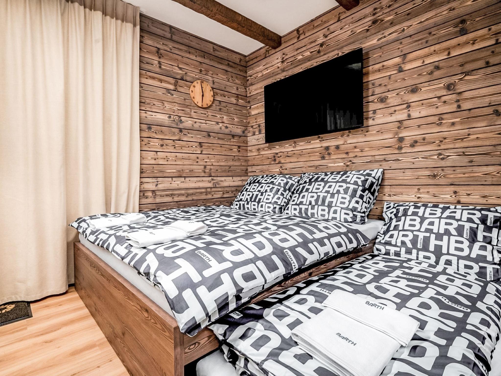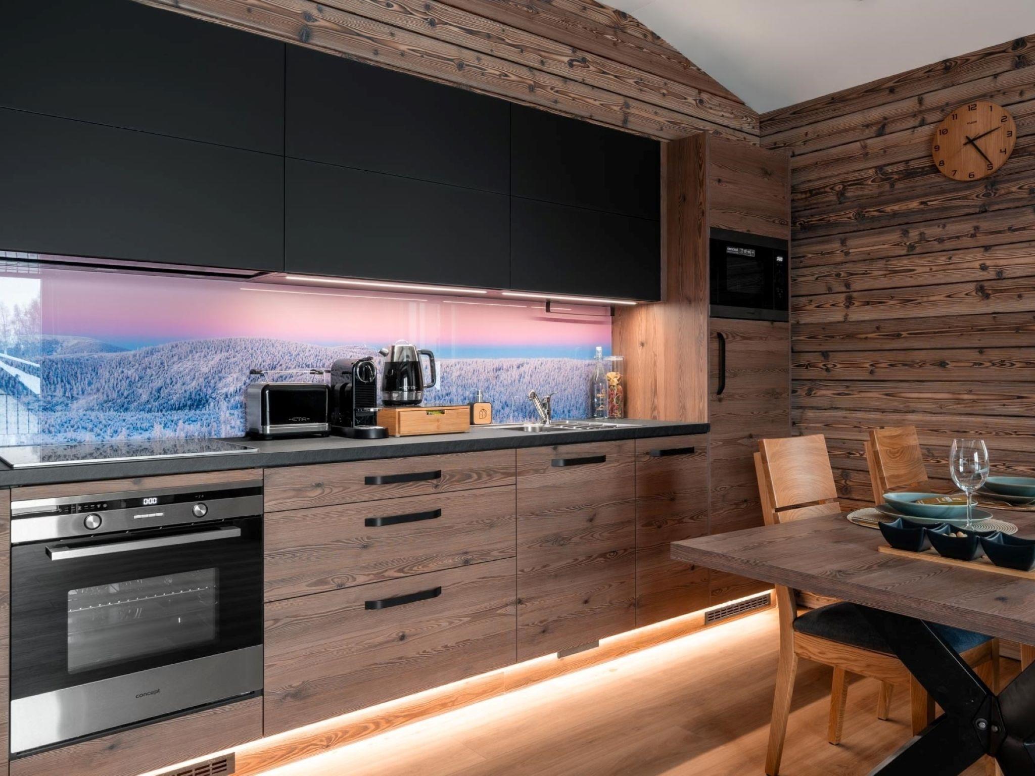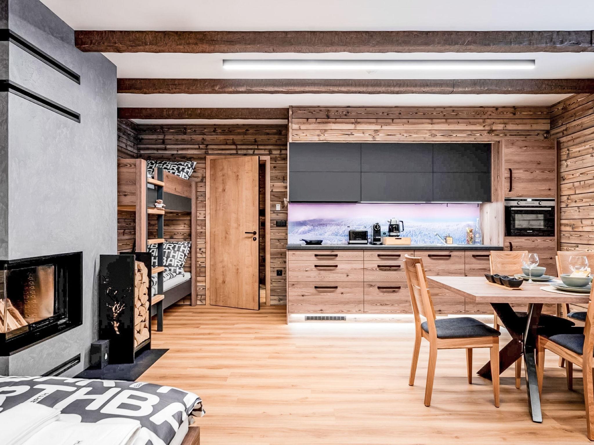 "Dolní Morava", 1-room apartment 45 m2, on the ground floor. Cosy and wooden furniture furnishings: entrance hall. Living/sleeping room with 1 x 2 bunk beds, 1 double bed, 1 pull-out bed and TV. Exit to the balcony. Kitchenette (oven, dishwasher, 4 ceramic glass hob hotplates, kettle, microwave, electric coffee machine) with dining table. Shower/WC. Electric heating. Balcony. Balcony furniture. Facilities: Internet (WiFi, free). Parking. Please note: suitable for families. Non-smokers only.