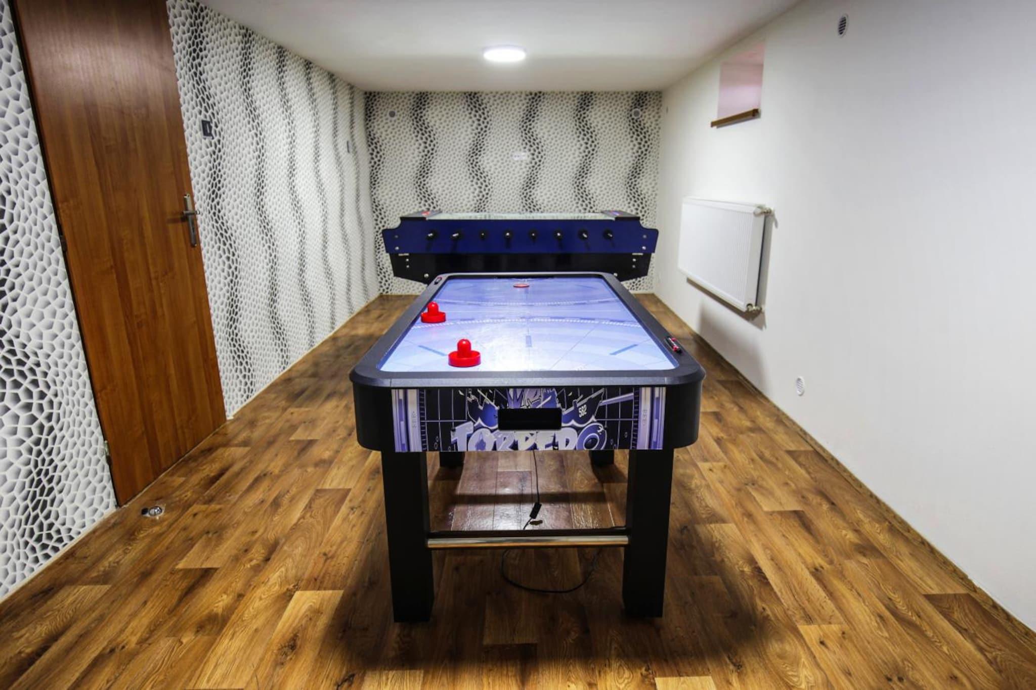 Oplev det perfekte tilflugtssted i denne charmerende villa i Frenštát pod Radhoštem, der tilbyder et fredfyldt tilflugtssted for op til 14 gæster. Med 6 rummelige soveværelser er dette hjem ideelt til familier eller grupper, der leder efter komfort, afslapning og eventyr. Ejendommen byder på store udendørsarealer, hvor både børn og voksne kan nyde den friske luft, samt et børnevenligt kvarter og skovområde, der føles som dit eget private feriested. Beliggende kun 10 km fra maleriske landsbyer som Nový Jicín og Štramberk, er der ingen mangel på aktiviteter at nyde. For lidt sjov kan du besøge Aquapark Frenštát Pod Radhoštem eller udfordre dig selv på Prosper Golf Club, kun 13 km væk. Om vinteren kan du nyde skiløb på nærliggende feriesteder som Malenovice, eller tage en naturskøn vandretur i sommermånederne. Uanset om du søger eventyr eller afslapning, har denne villa det hele! Denne villa kombinerer moderne bekvemmelighed med afslapning, når det er bedst. Efter en dag med udforskning kan du slappe af i jacuzzien eller saunaen, eller blot nyde de rolige omgivelser. Det fuldt udstyrede køkken giver mulighed for ubesværet måltidsforberedelse, og de rummelige opholdsområder giver et perfekt sted at slappe af med Wi-Fi, tv-kanaler og masser af hyggelige hjørner at nyde. Den udendørs terrasse og haven er perfekte til familie-grill eller blot at slikke solen, mens børnene leger trygt i nærheden.