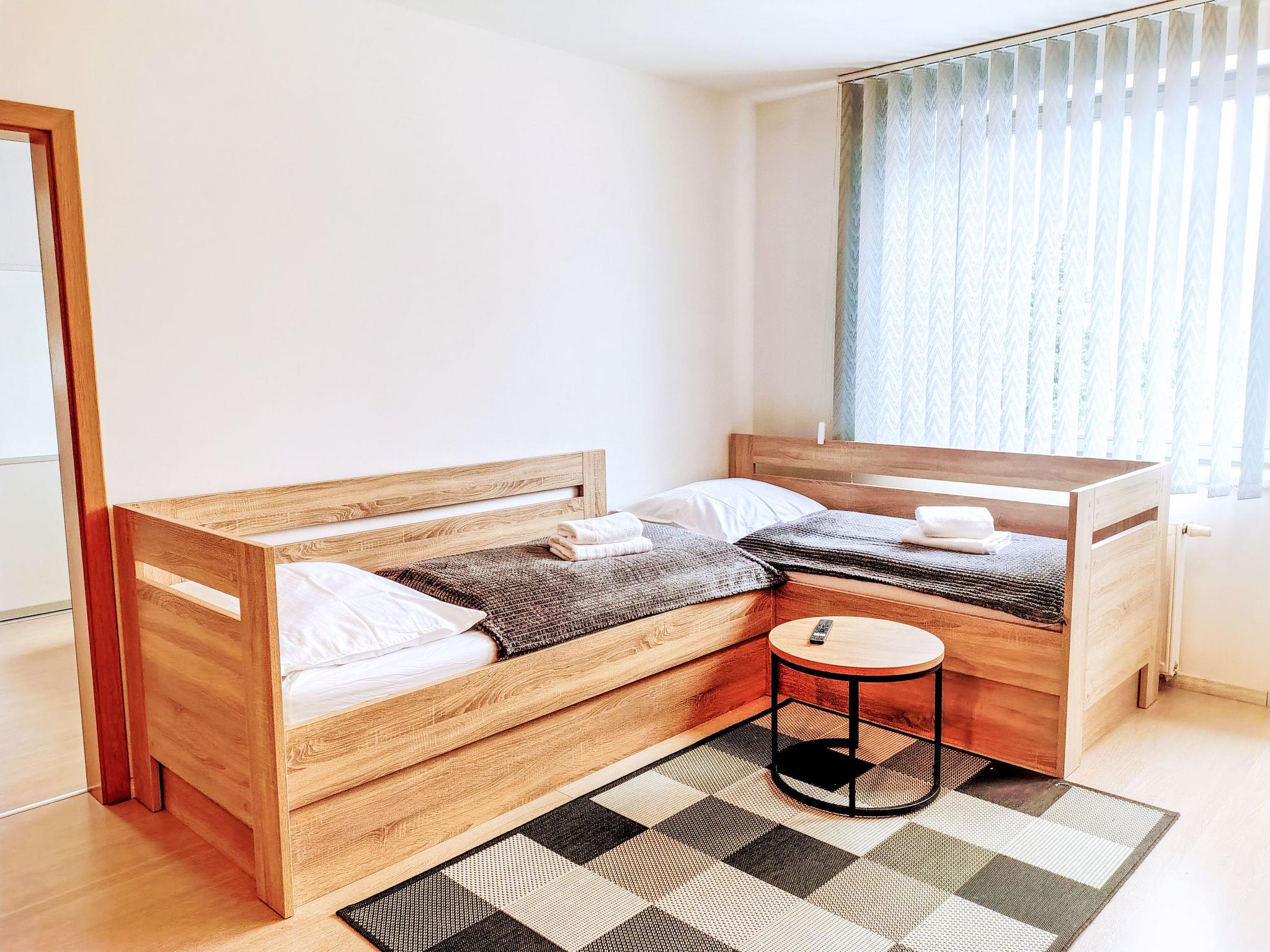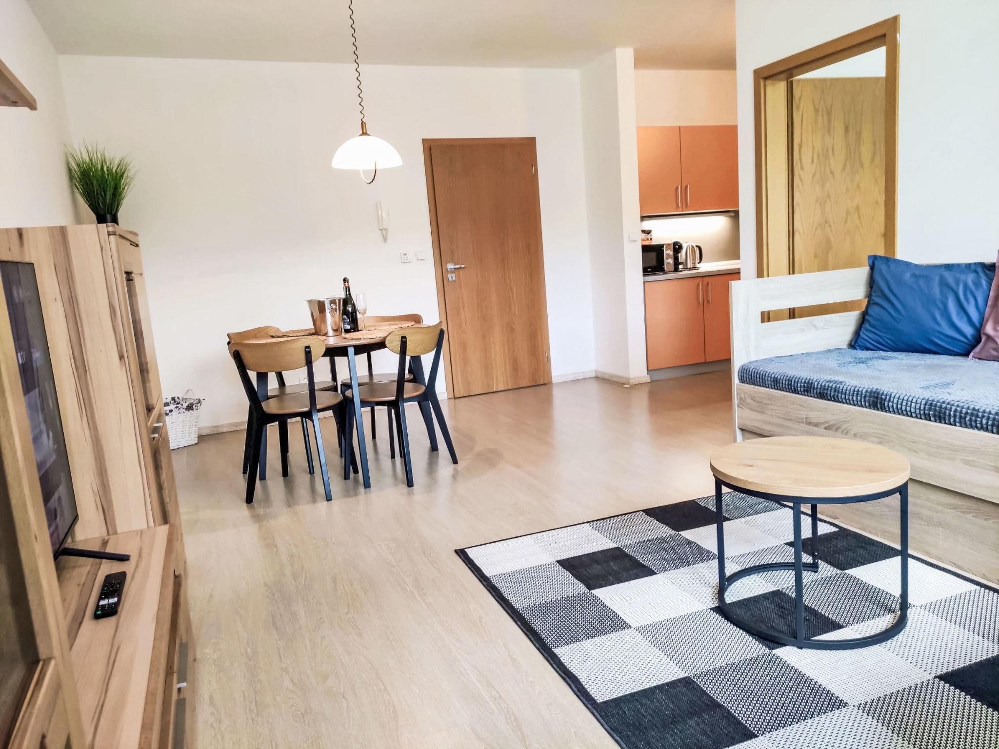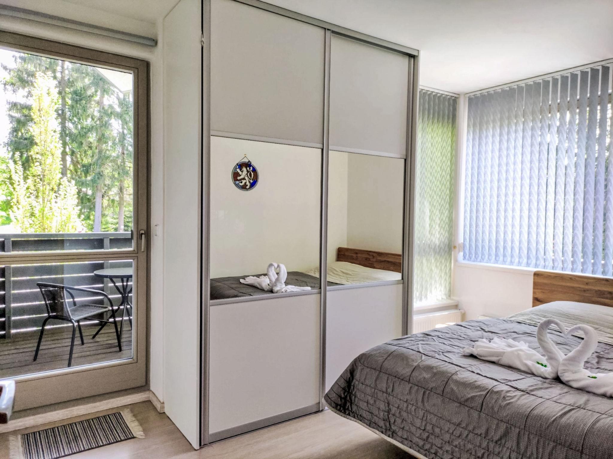 "Harrachov Resident 209", 2-room apartment 60 m2 on 2nd floor. Modern and cosy furnishings: living/sleeping room with 2 beds, dining table and TV. 1 room with 1 double bed. Exit to the balcony. Kitchenette (4 ceramic glass hob hotplates, toaster, kettle, microwave, freezer, electric coffee machine). Bath/WC. Heating. Large balcony. Balcony furniture. View of the forest. Facilities: children's high chair, hair dryer. Internet (WiFi, free). Parking space n 209. Please note: suitable for families. Non-smokers only.