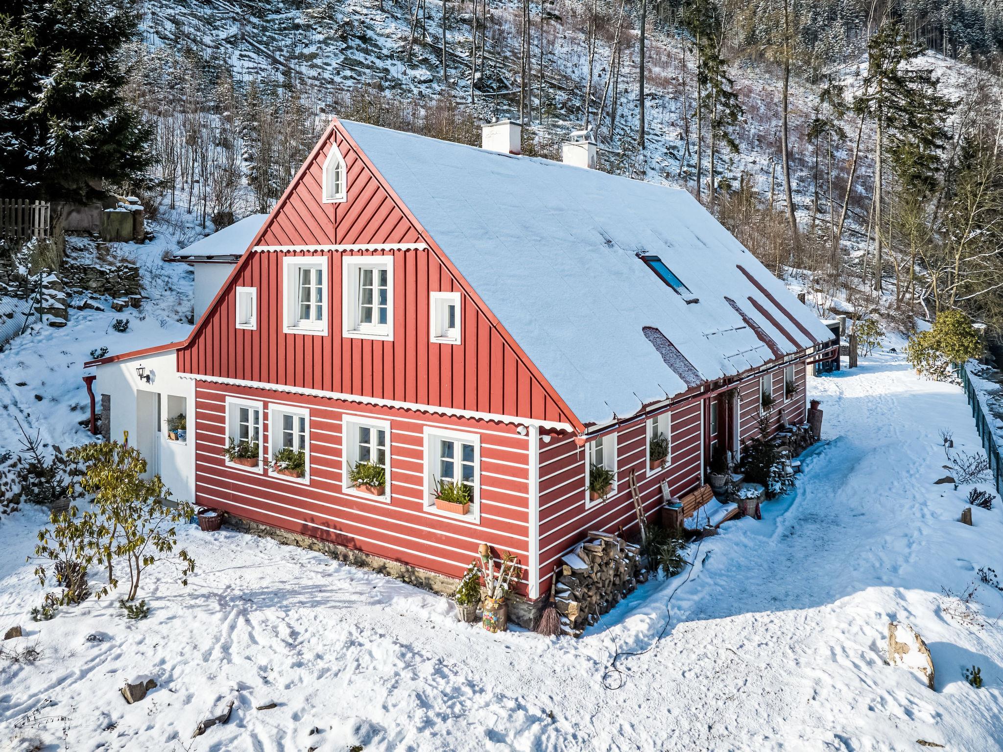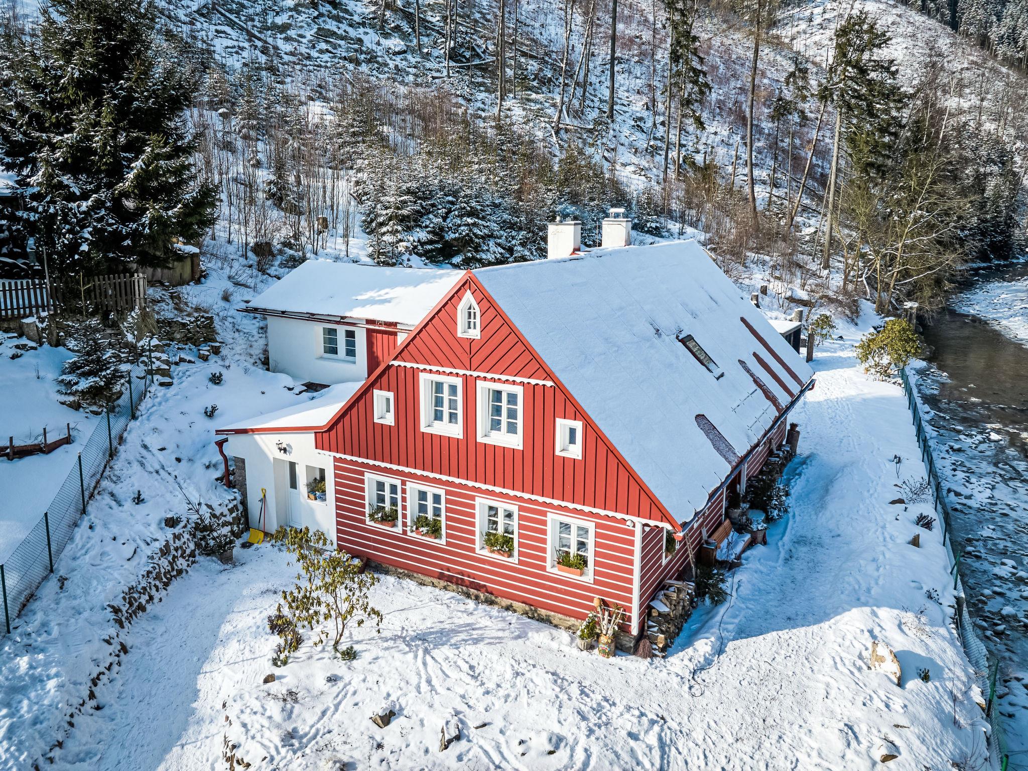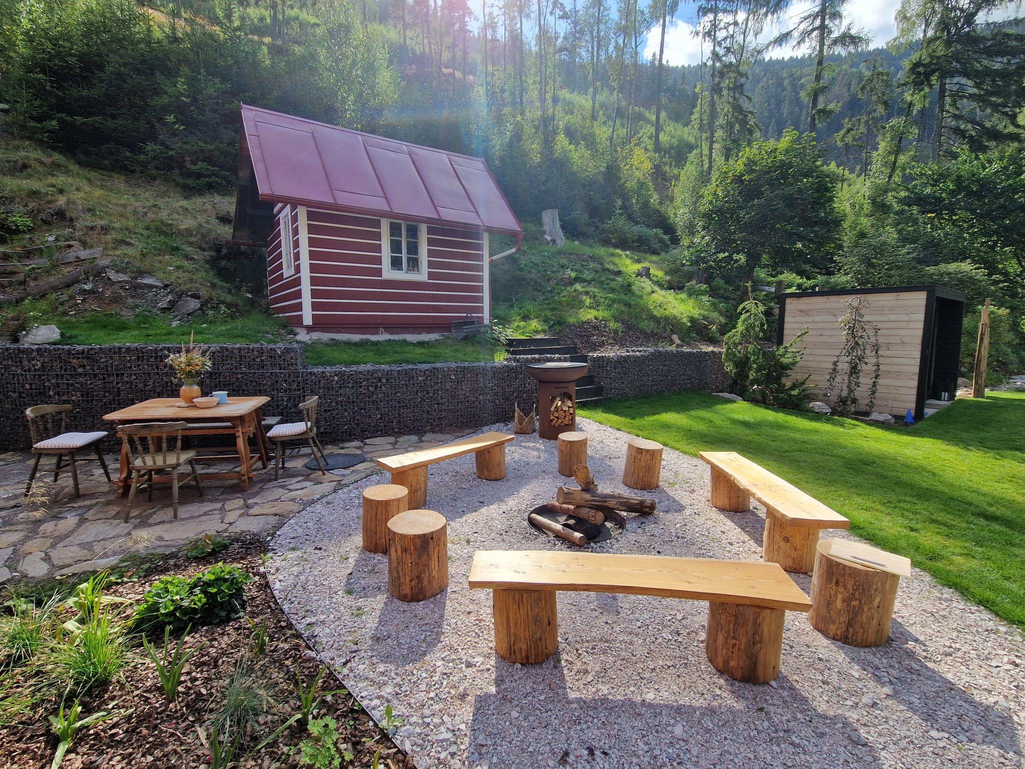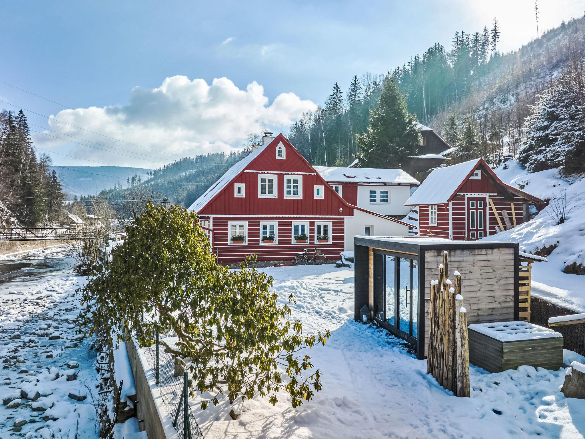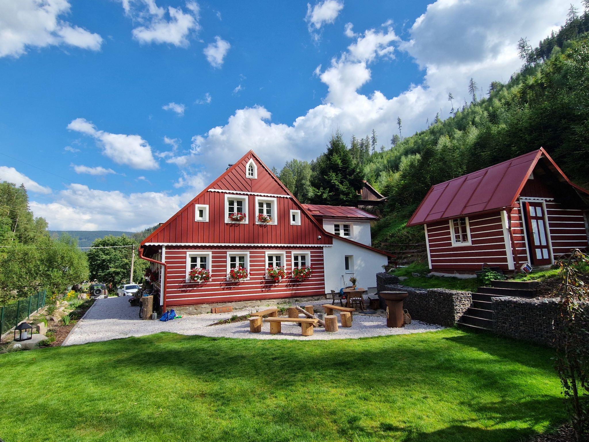 Temný Dul 3 km from Janské Lázne: Very beautiful, rustic country house "Charming Mountain Lodge & Wellness", 2 storeys, detached, built in 1850, renovated in 2023. In a quiet, sunny position, 100 m from the edge of the forest, 2.5 km from the skiing area, directly by the river. Private: garden (not fenced). Patio, fireplace. In the house: WiFi, sauna, storage room for skis, central heating system, laundry, washing machine, tumble dryer. Parking at the house. Grocery 1.5 km, restaurant 900 m, bus stop "Svoboda nad Úpou - Maršov" 400 m, railway station "Svoboda nad Úpou" 3 km, park "Farmapark Muchomurka" 3 km, outdoor swimming pool 7 km, indoor swimming pool 4.5 km. Golf course (18 hole) 9 km, tennis 4 km, minigolf 1.6 km, walking paths from the house, cycle lane 500 m, cable car 5 km, ski lift 2.5 km, gondola lift 5 km, skisport facilities 5 km, slopes 2.5 km, ski rental 3500 km, ski bus stop 200 m, ski school 5 km, children's ski school 5 km, sled run 6 km, cross country ski track 1.5 km, children's playground 800 m. Nearby attractions: Pohádková výstava 1.5 km, Svoboda n. Ú. 2.5 km, hrádek Aichelburg 4 km, Janské Lázne Spa 5 km, Stezka korunami stromu 6 km, Pec pod Snežkou, Relaxpark, bobová dráha 10 km, Trutnov, Malá Úpa 14 km, Vrchlabí 20 km, Zoo Dvur Králové, Adršpach, Karpacz 35 km. Well-known ski regions can easily be reached: Svoboda nad Úpou 2.5 km, Janské Lázne 3.5 km, Cerná Hora – Pec, Portášky, Mladé Buky 7 km, Malá Úpa 16 km, Špindleruv Mlýn 40 km. Hiking paths: Krkonošský národní park. Please note: suitable for families.