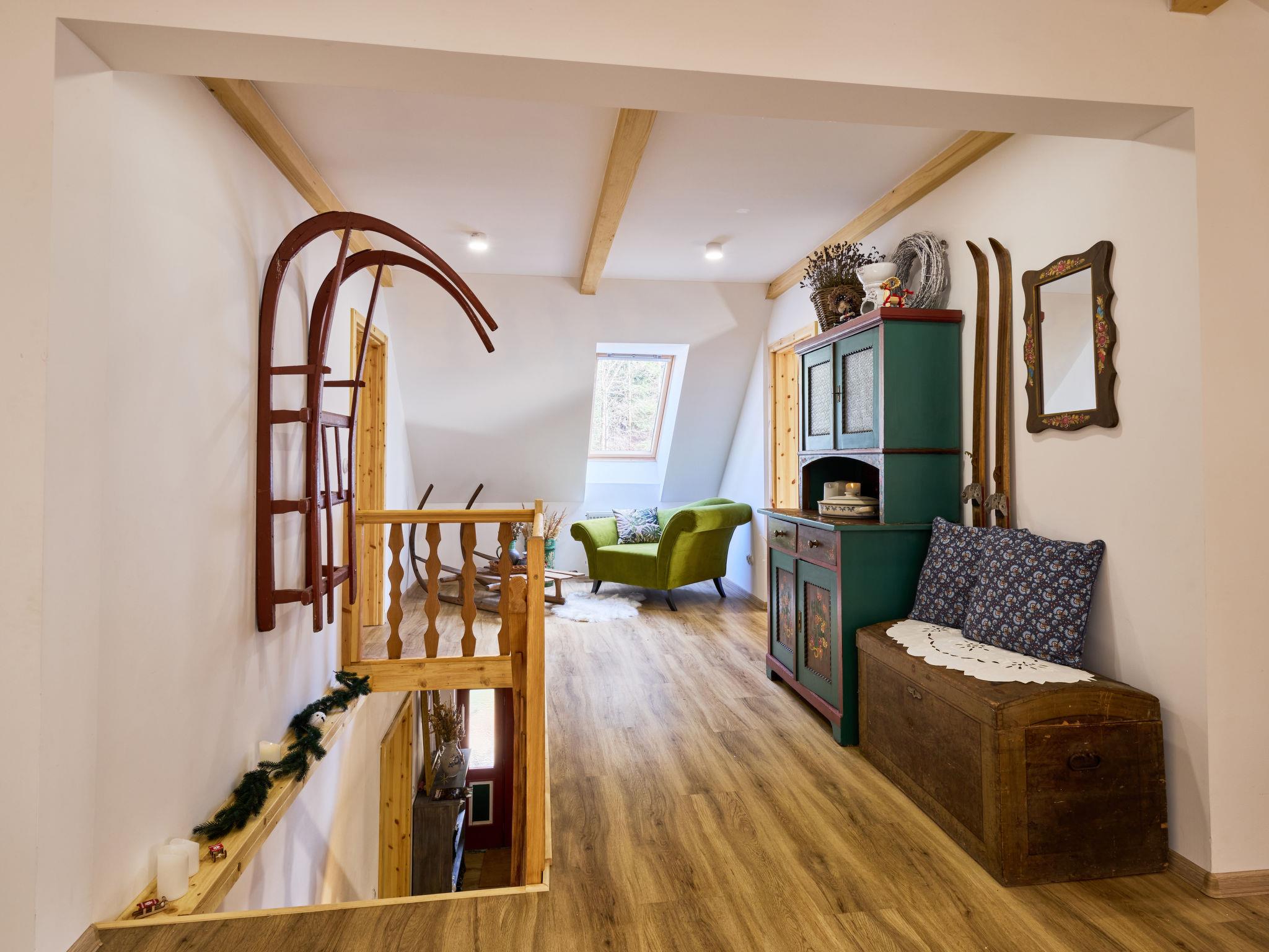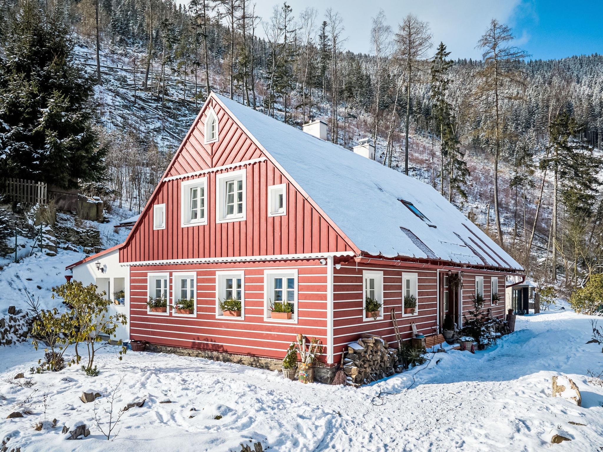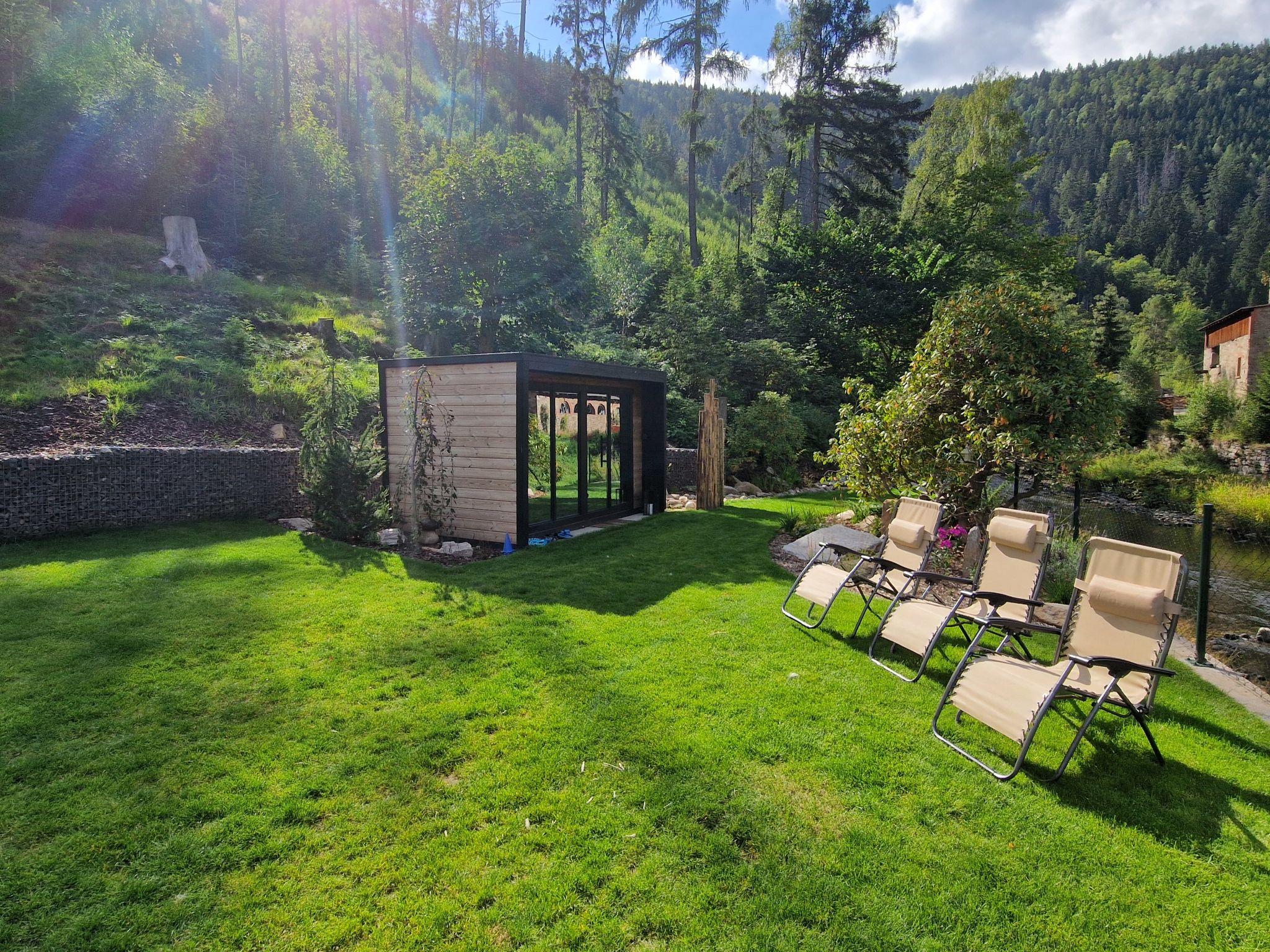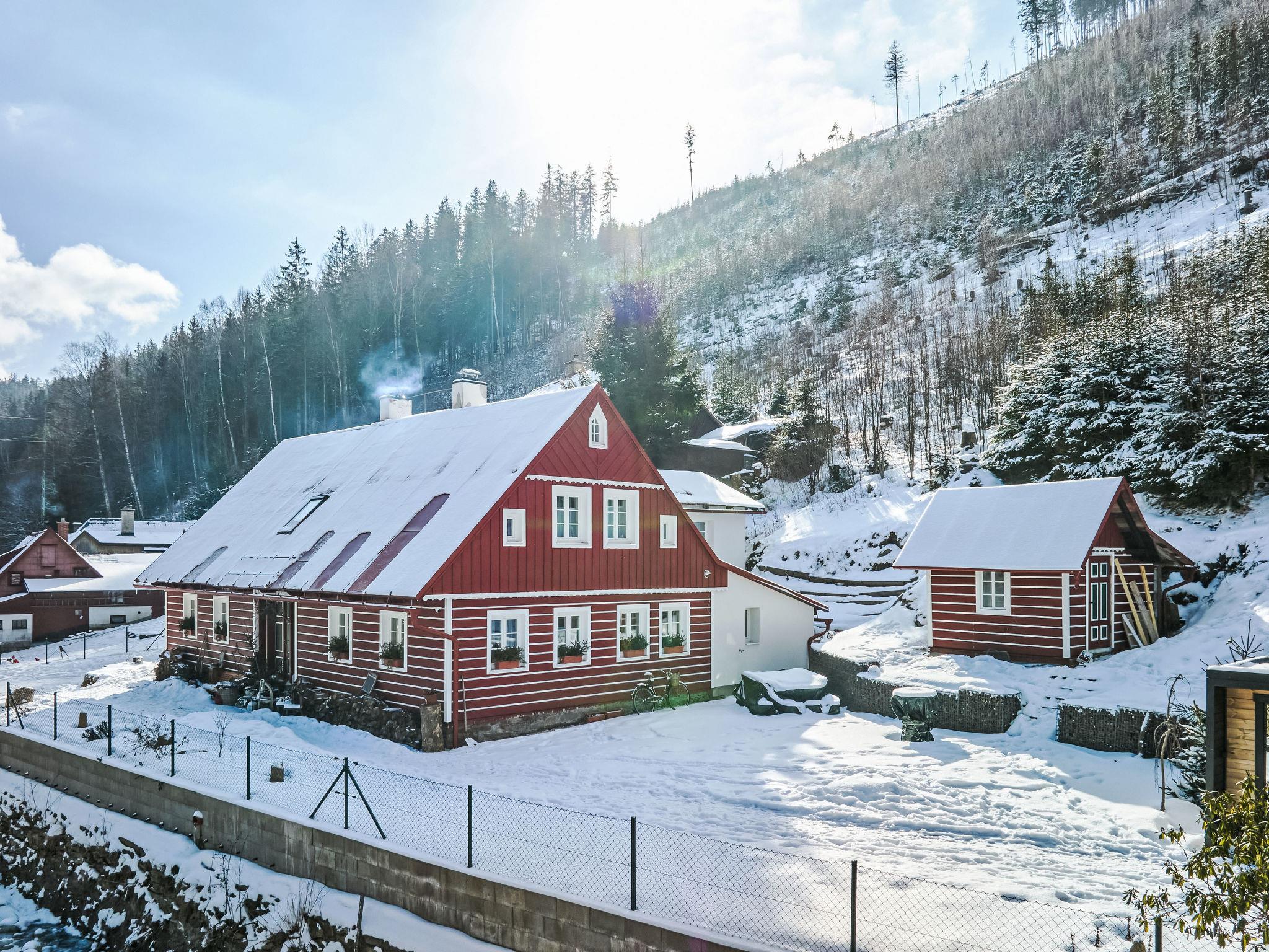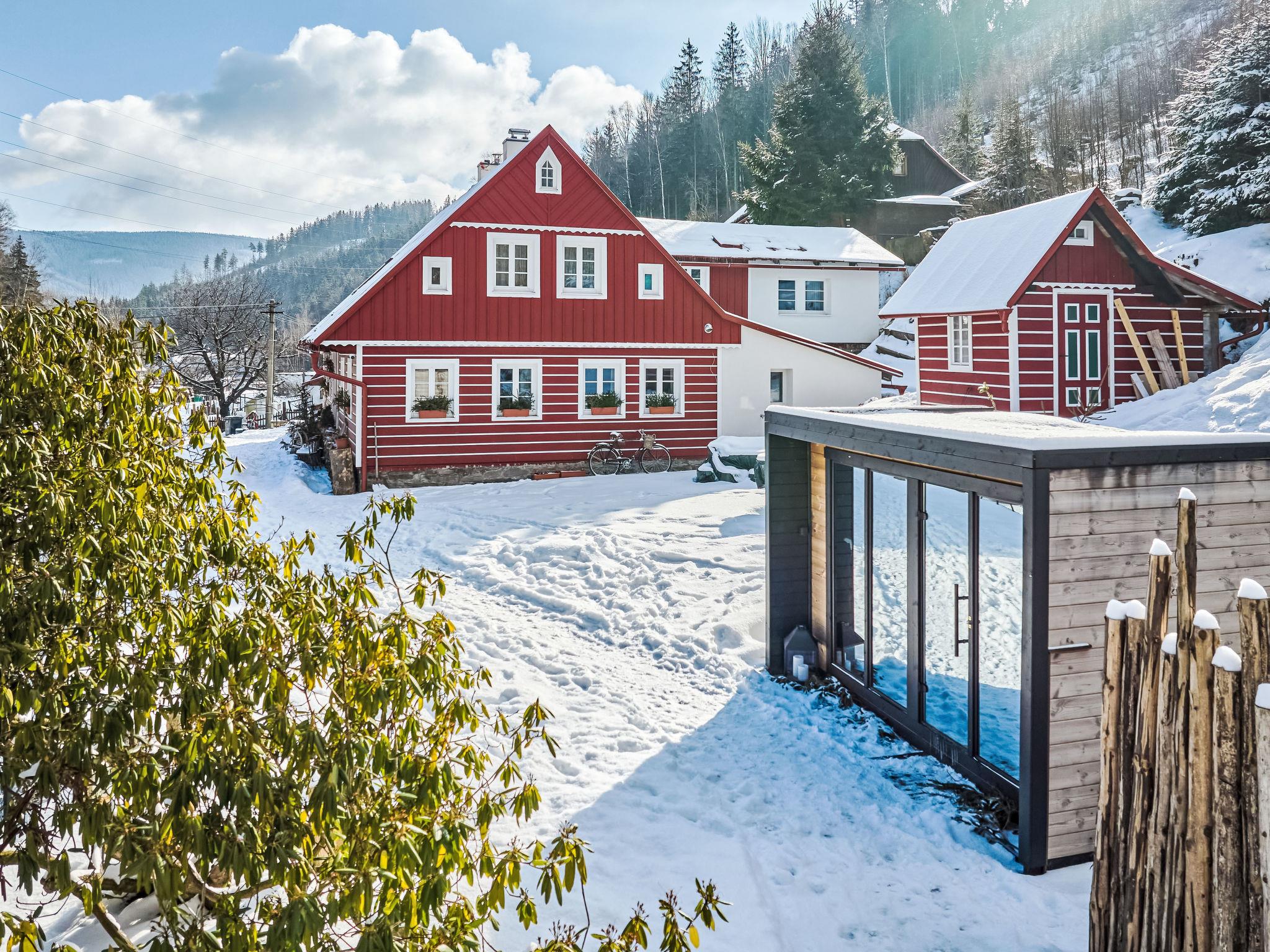 Temný Dul 3 km from Janské Lázne: Very beautiful, rustic country house "Charming Mountain Lodge & Wellness", 2 storeys, detached, built in 1850, renovated in 2023. In a quiet, sunny position, 100 m from the edge of the forest, 2.5 km from the skiing area, directly by the river. Private: garden (not fenced). Patio, fireplace. In the house: WiFi, sauna, storage room for skis, central heating system, laundry, washing machine, tumble dryer. Parking at the house. Grocery 1.5 km, restaurant 900 m, bus stop "Svoboda nad Úpou - Maršov" 400 m, railway station "Svoboda nad Úpou" 3 km, park "Farmapark Muchomurka" 3 km, outdoor swimming pool 7 km, indoor swimming pool 4.5 km. Golf course (18 hole) 9 km, tennis 4 km, minigolf 1.6 km, walking paths from the house, cycle lane 500 m, cable car 5 km, ski lift 2.5 km, gondola lift 5 km, skisport facilities 5 km, slopes 2.5 km, ski rental 3500 km, ski bus stop 200 m, ski school 5 km, children's ski school 5 km, sled run 6 km, cross country ski track 1.5 km, children's playground 800 m. Nearby attractions: Pohádková výstava 1.5 km, Svoboda n. Ú. 2.5 km, hrádek Aichelburg 4 km, Janské Lázne Spa 5 km, Stezka korunami stromu 6 km, Pec pod Snežkou, Relaxpark, bobová dráha 10 km, Trutnov, Malá Úpa 14 km, Vrchlabí 20 km, Zoo Dvur Králové, Adršpach, Karpacz 35 km. Well-known ski regions can easily be reached: Svoboda nad Úpou 2.5 km, Janské Lázne 3.5 km, Cerná Hora – Pec, Portášky, Mladé Buky 7 km, Malá Úpa 16 km, Špindleruv Mlýn 40 km. Hiking paths: Krkonošský národní park. Please note: suitable for families.