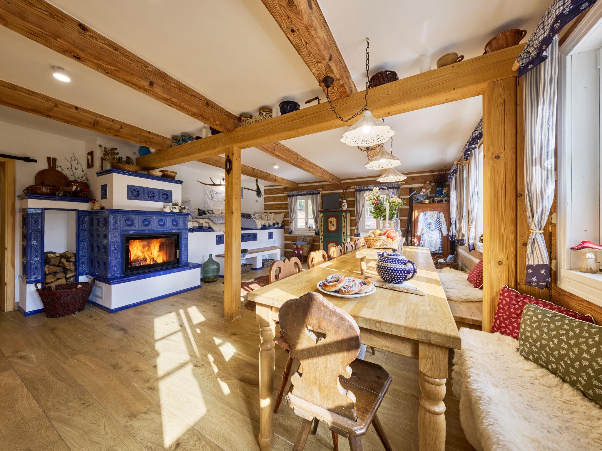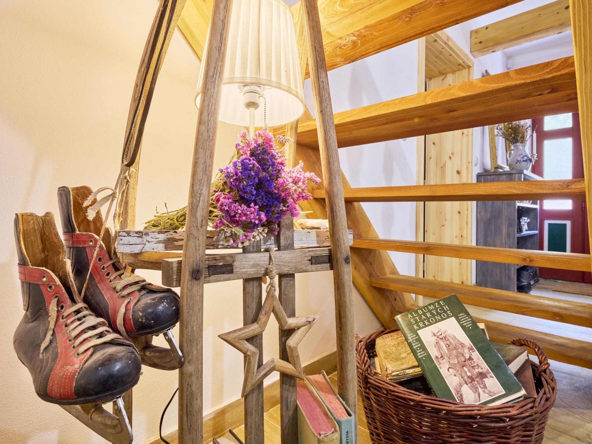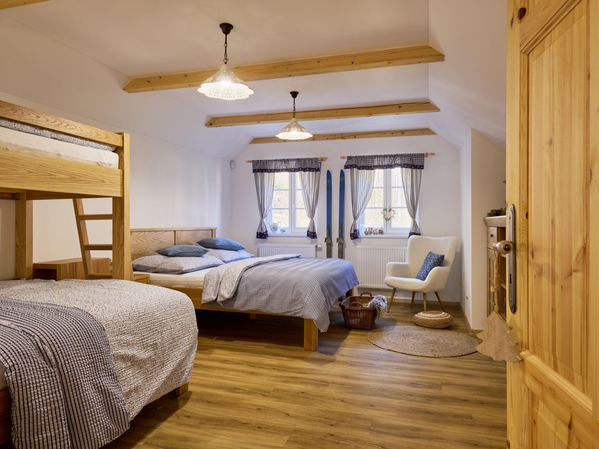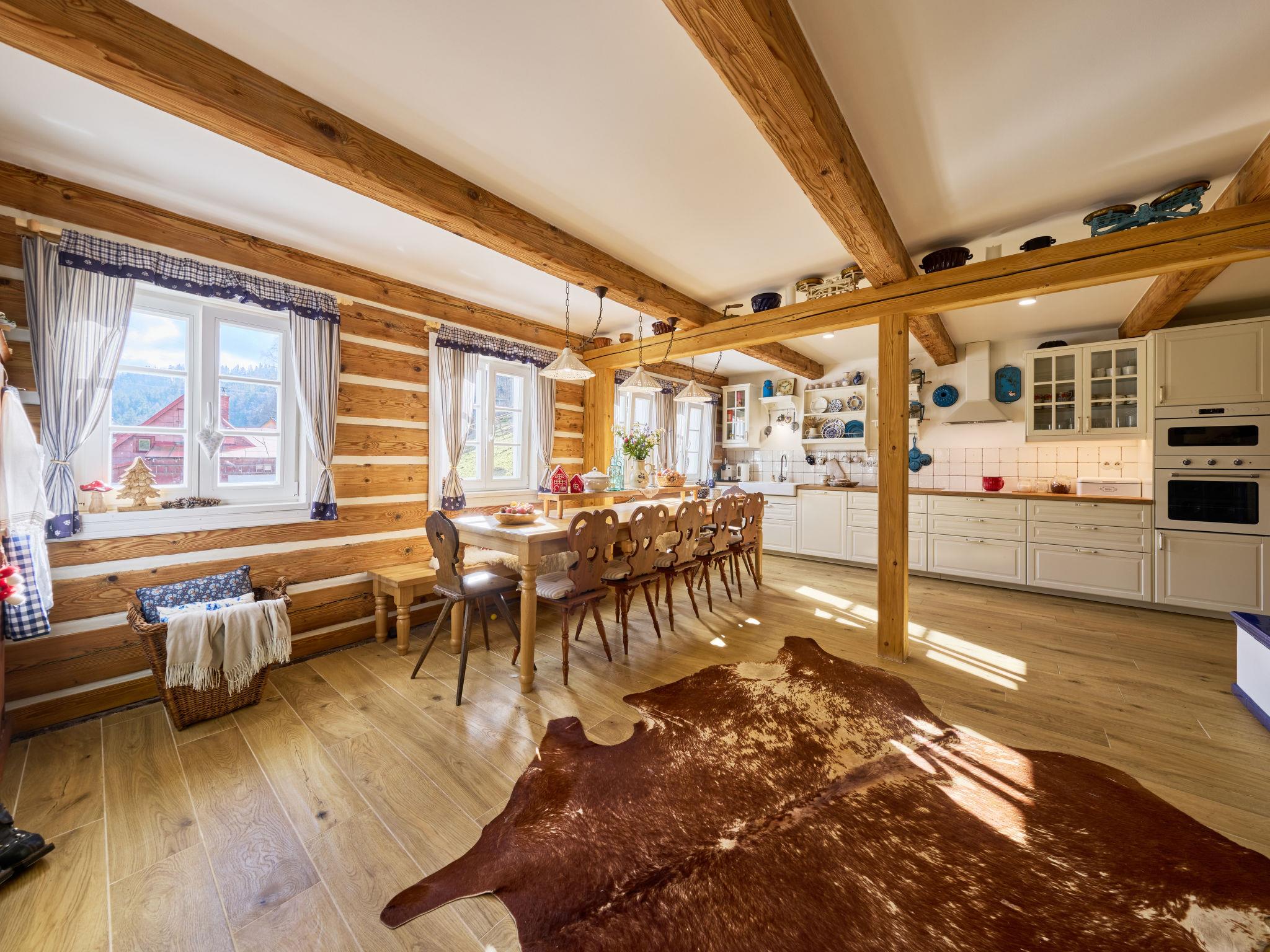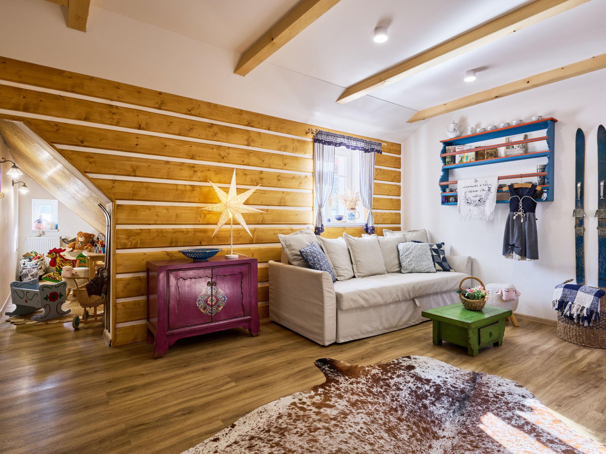Temný Dul 3 km from Janské Lázne: Very beautiful, rustic country house "Charming Mountain Lodge & Wellness", 2 storeys, detached, built in 1850, renovated in 2023. In a quiet, sunny position, 100 m from the edge of the forest, 2.5 km from the skiing area, directly by the river. Private: garden (not fenced). Patio, fireplace. In the house: WiFi, sauna, storage room for skis, central heating system, laundry, washing machine, tumble dryer. Parking at the house. Grocery 1.5 km, restaurant 900 m, bus stop "Svoboda nad Úpou - Maršov" 400 m, railway station "Svoboda nad Úpou" 3 km, park "Farmapark Muchomurka" 3 km, outdoor swimming pool 7 km, indoor swimming pool 4.5 km. Golf course (18 hole) 9 km, tennis 4 km, minigolf 1.6 km, walking paths from the house, cycle lane 500 m, cable car 5 km, ski lift 2.5 km, gondola lift 5 km, skisport facilities 5 km, slopes 2.5 km, ski rental 3500 km, ski bus stop 200 m, ski school 5 km, children's ski school 5 km, sled run 6 km, cross country ski track 1.5 km, children's playground 800 m. Nearby attractions: Pohádková výstava 1.5 km, Svoboda n. Ú. 2.5 km, hrádek Aichelburg 4 km, Janské Lázne Spa 5 km, Stezka korunami stromu 6 km, Pec pod Snežkou, Relaxpark, bobová dráha 10 km, Trutnov, Malá Úpa 14 km, Vrchlabí 20 km, Zoo Dvur Králové, Adršpach, Karpacz 35 km. Well-known ski regions can easily be reached: Svoboda nad Úpou 2.5 km, Janské Lázne 3.5 km, Cerná Hora – Pec, Portášky, Mladé Buky 7 km, Malá Úpa 16 km, Špindleruv Mlýn 40 km. Hiking paths: Krkonošský národní park. Please note: suitable for families.