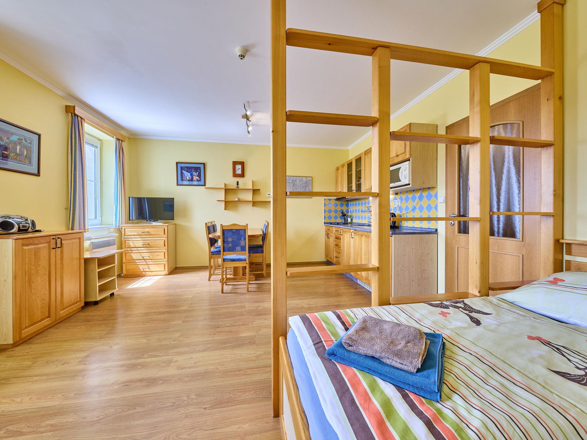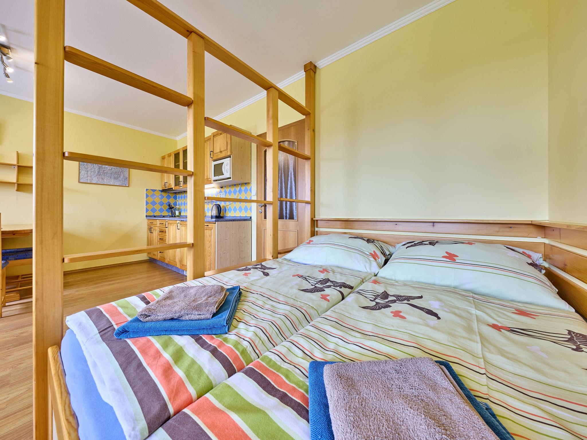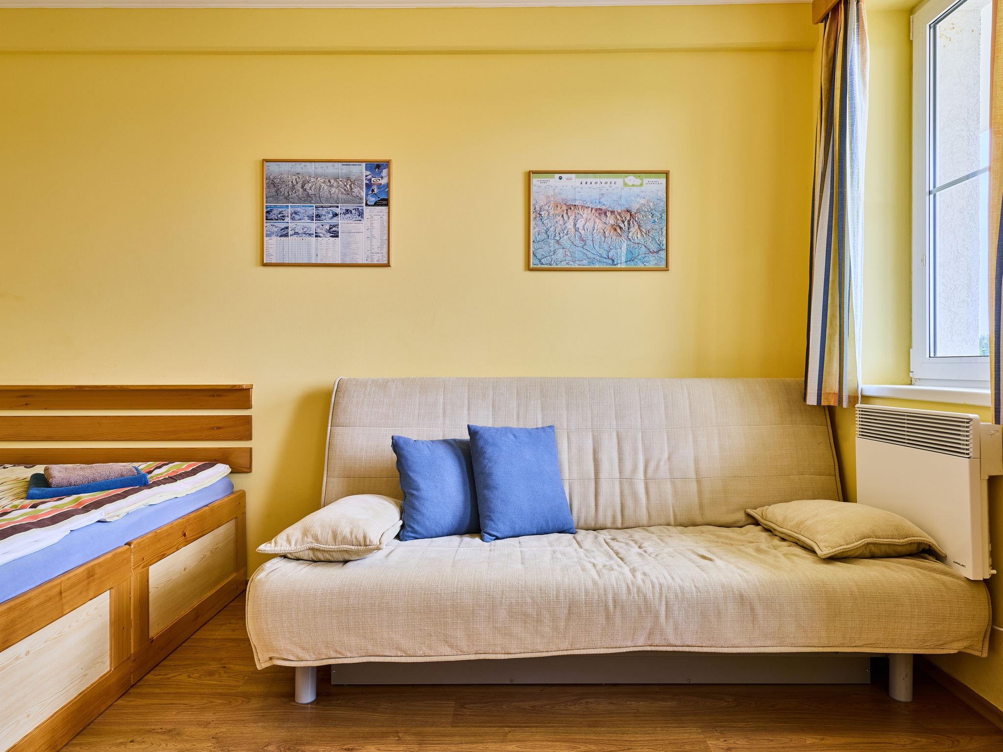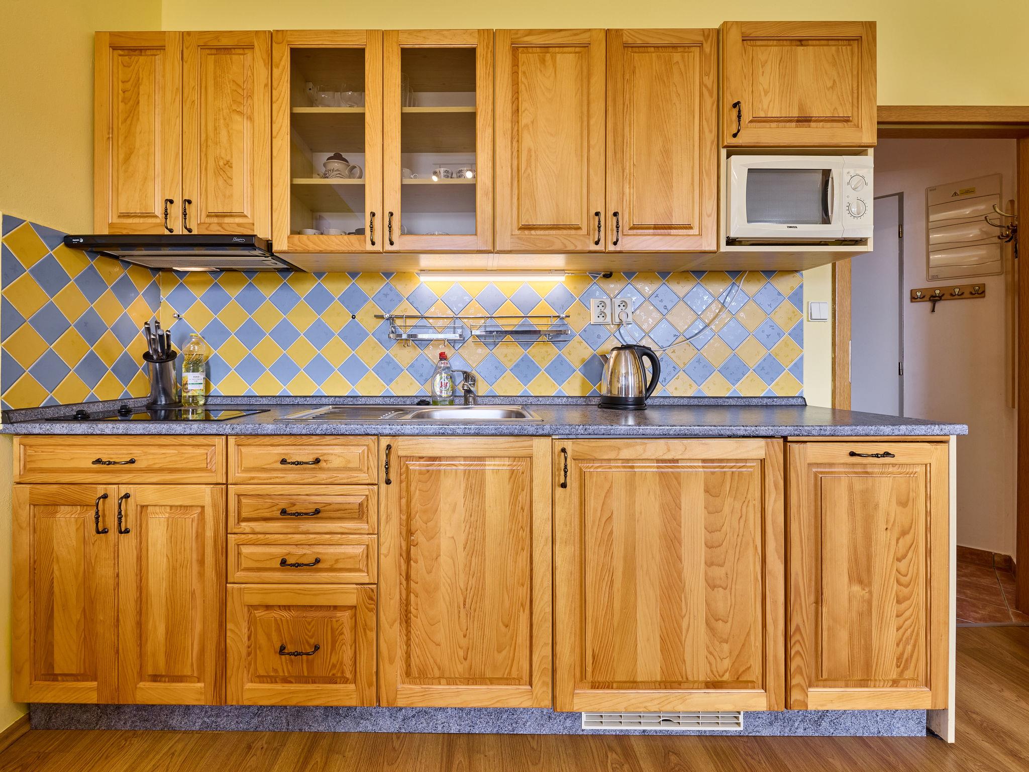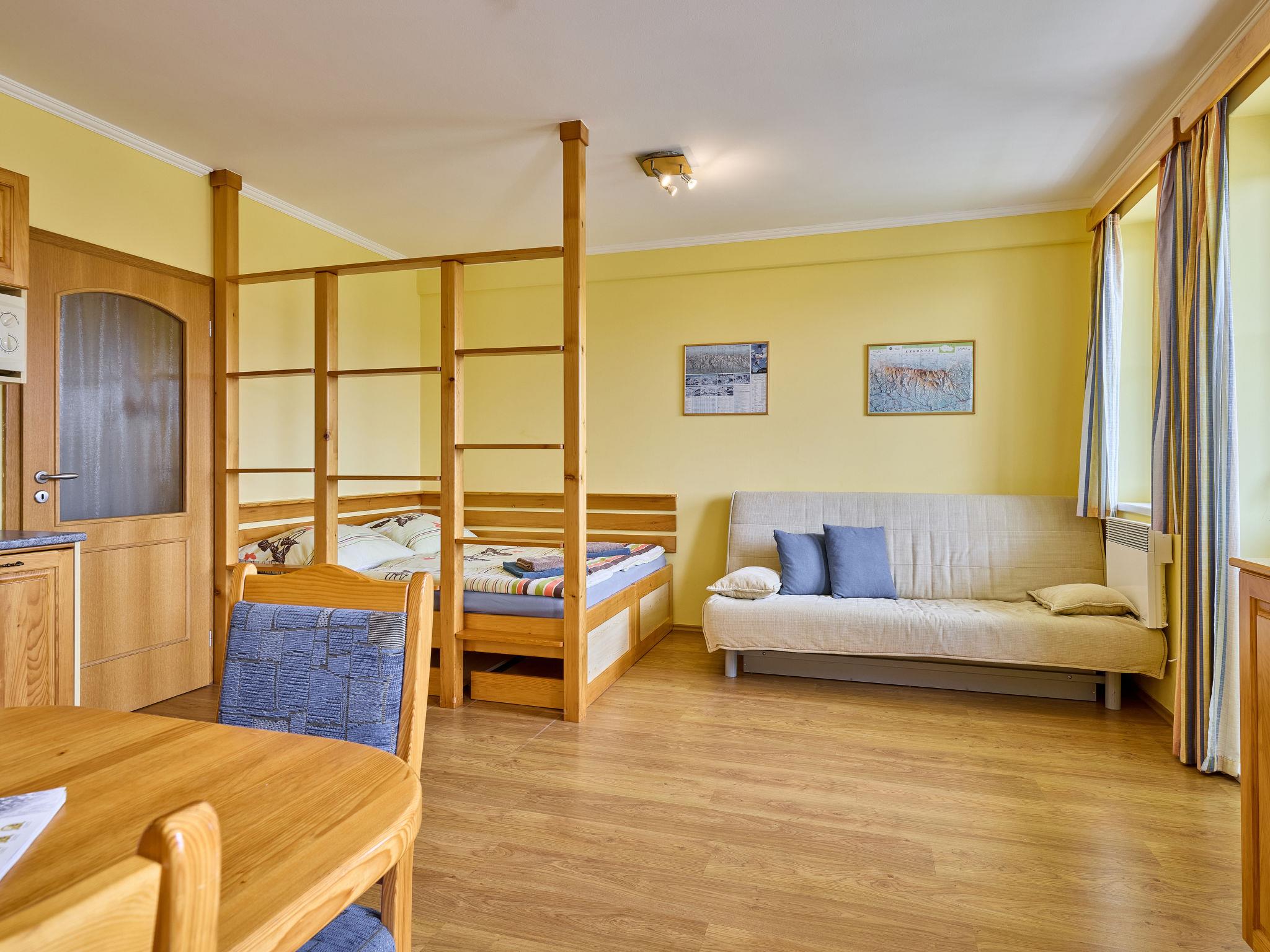 "Horní Mísecky", 1-room apartment 35 m2, on the ground floor. Comfortable and cosy furnishings: living/sleeping room with 1 double sofabed, 1 double bed, dining table, satellite TV and international TV channels. Exit to the balcony. Open kitchen (dishwasher, 2 ceramic glass hob hotplates, toaster, kettle, microwave, electric coffee machine, Capsules for coffee machine (Nespresso) extra). Shower/WC. Electric heating. Balcony. Facilities: Internet (WiFi, free). Parking (roofed). Please note: suitable for families. Non-smokers only.