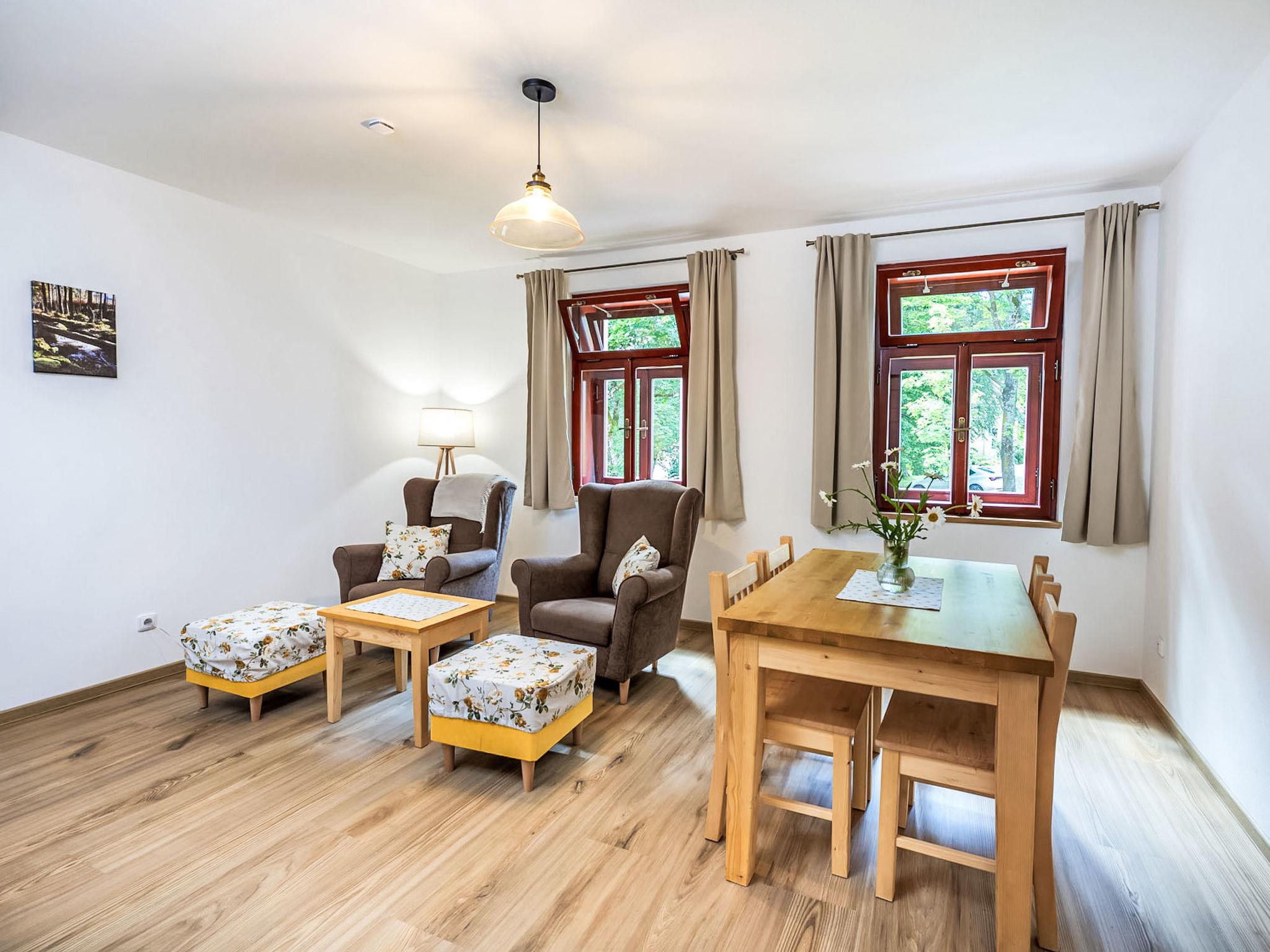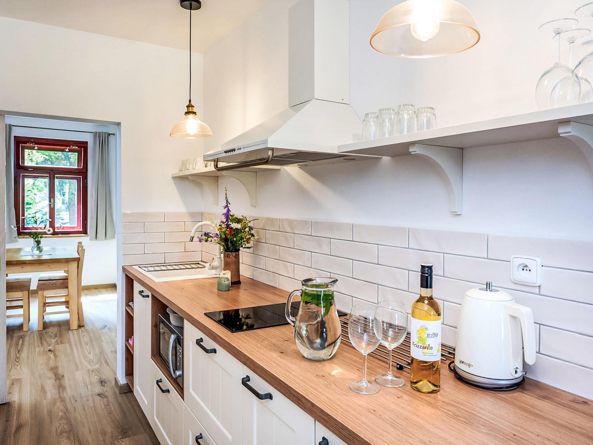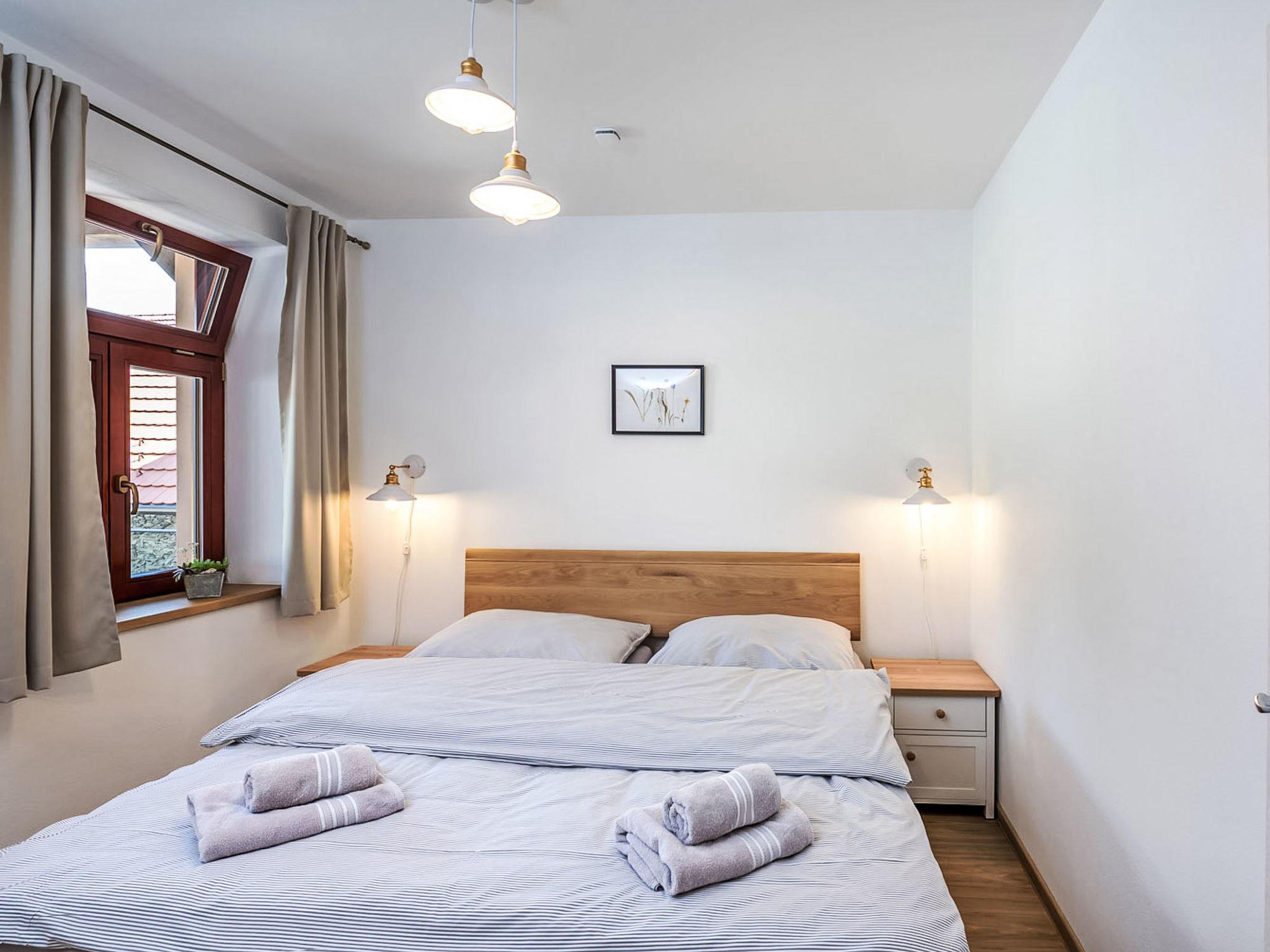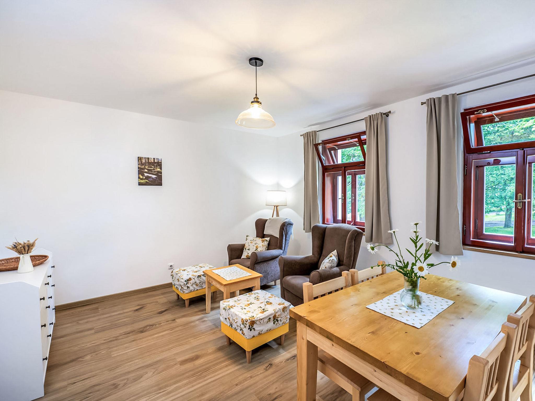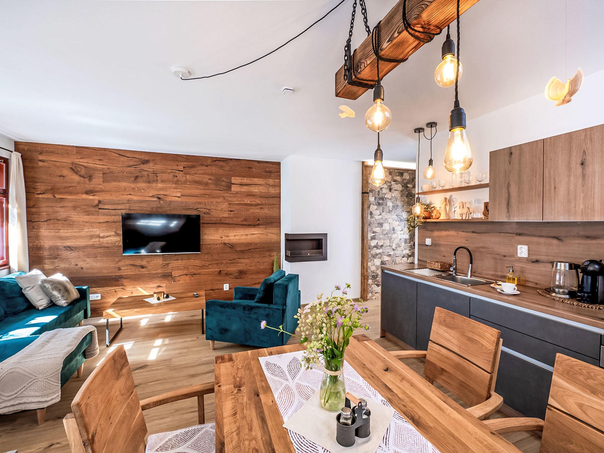 "Lipno", 5-room apartment 106 m2, on the ground floor. Spacious and bright, very beautiful and stylish furnishings: living/sleeping room with 1 double bed and Scandinavian wood stove (only for decoration), dining table and TV. 1 room with 1 double bed. Living room with dining table and kitchen corner. 1 room with 1 double bed. 1 room with 2 beds. Kitchenette (oven, 4 ceramic glass hob hotplates, kettle, microwave, electric coffee machine). 2 showers/WC. Terrace. Terrace furniture. Facilities: baby cot. Internet (WiFi, free). Suitable for families. Maximum 1 pet/ dog allowed.