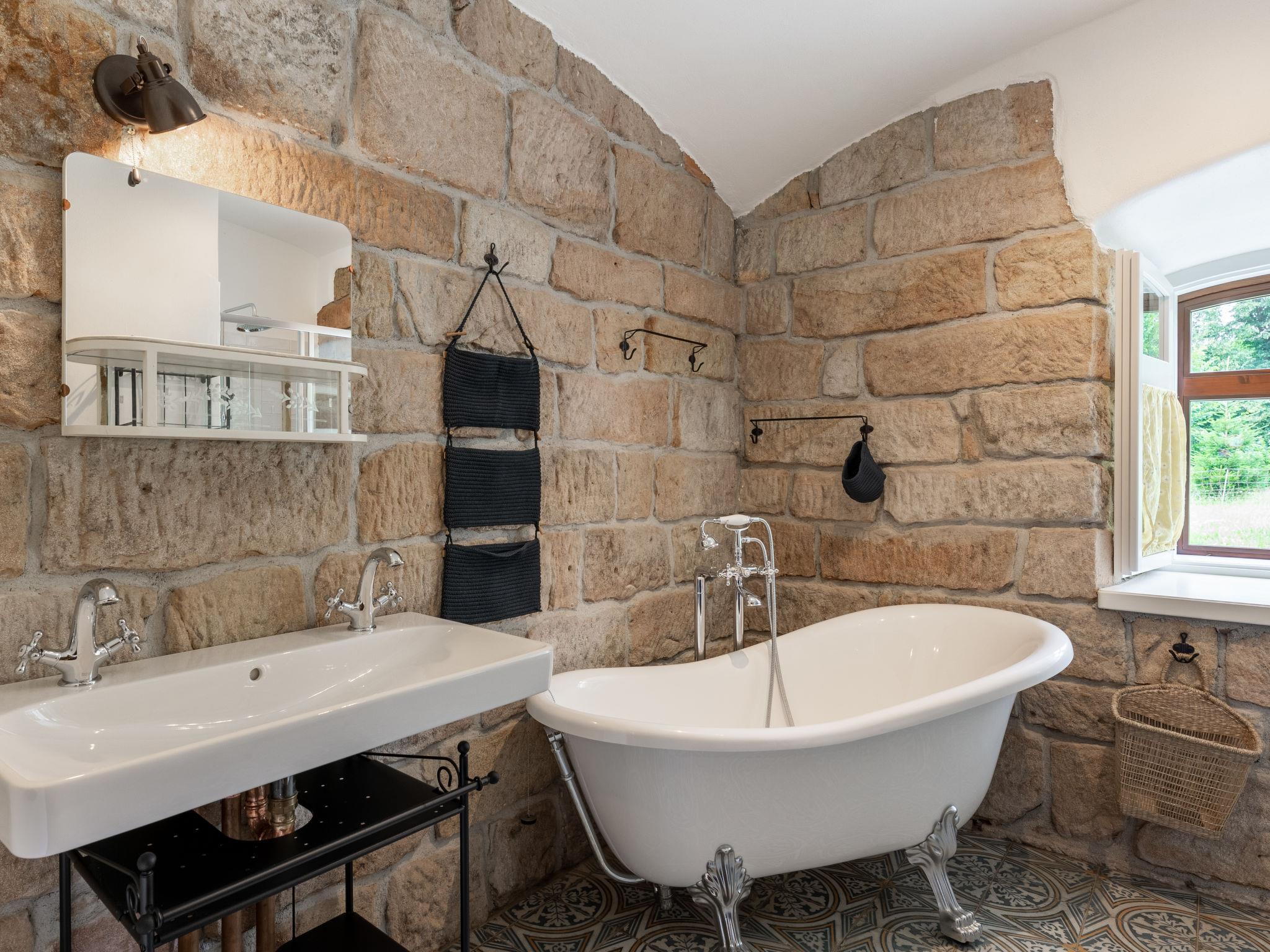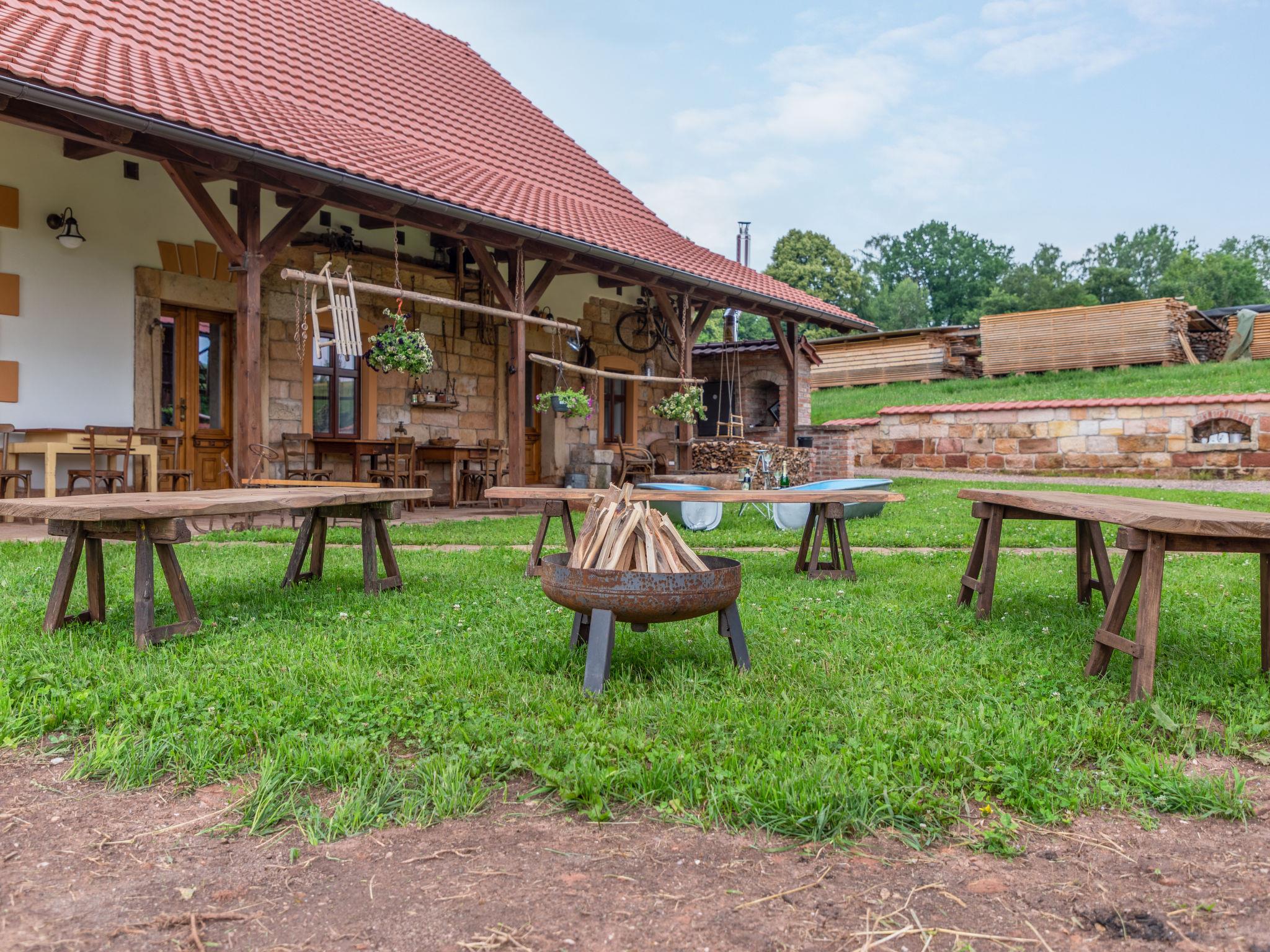 Dolní Olešnice 7 km from Hostinné: Luxurious farmhouse detached, built in 1868, renovated in 2021. Private: property, swimming pool (2 x 4 m, depth 120 cm, seasonal availability: 01.Jun. - 30.Sep.). Terrace, garden furniture, barbecue, fireplace, children's playground (sandbox). In the house: WiFi, table tennis, billiard table, table football, trampoline, washing machine. Steep motor access to 50 m from the grounds. Parking at the house. Shop 5 km, restaurant 4 km, bus stop "Dolní Olešnice, Nové Zámky" 3 km, railway station "Chotevice" 5 km. Nearby attractions: Zvicina 10 km, Vrchlabí 17 km, Trutnov 19 km, Jilemnice 20 km, Janské Lázne 25 km. Well-known ski regions can easily be reached: Knežický vrch-Vrchlabí 19 km, Mladé Buky 25 km, Cerná hora-Pec pod Snežkou 36 km. Well-known lakes can easily be reached: Dolce 18 m. Hiking paths: Les Království 12 km. Please note: animals in the neighbourhood. Separate grass pitch available including goals and net for ball games.