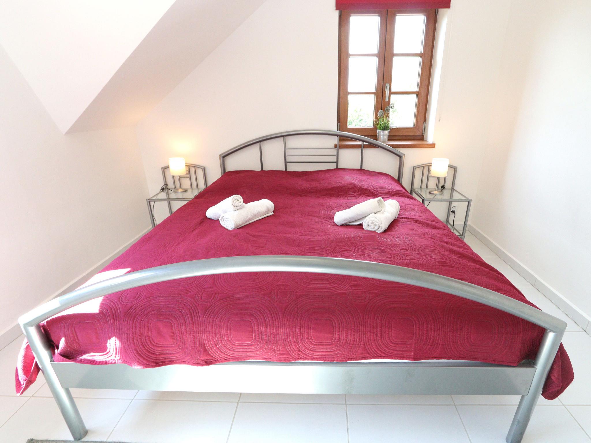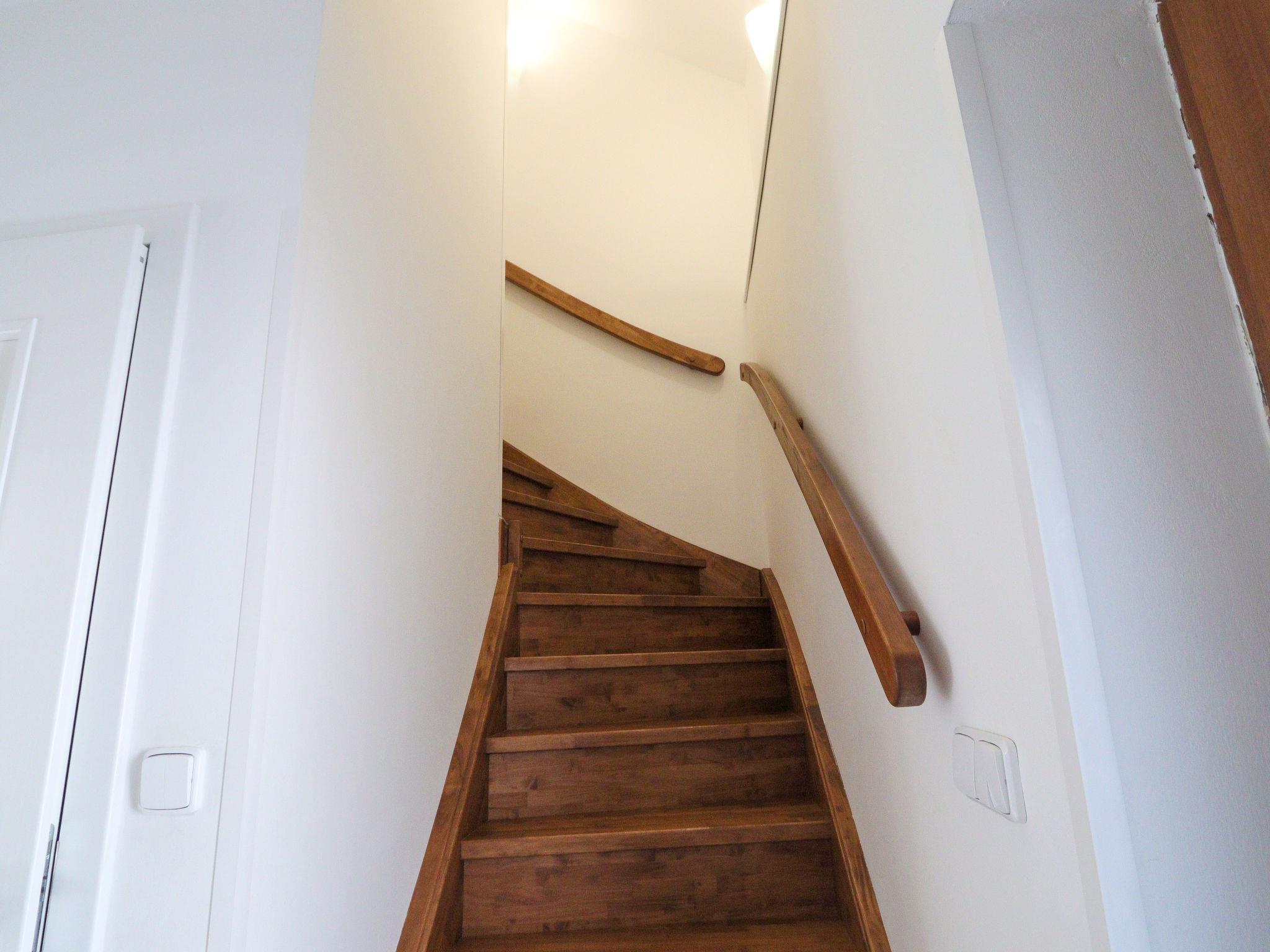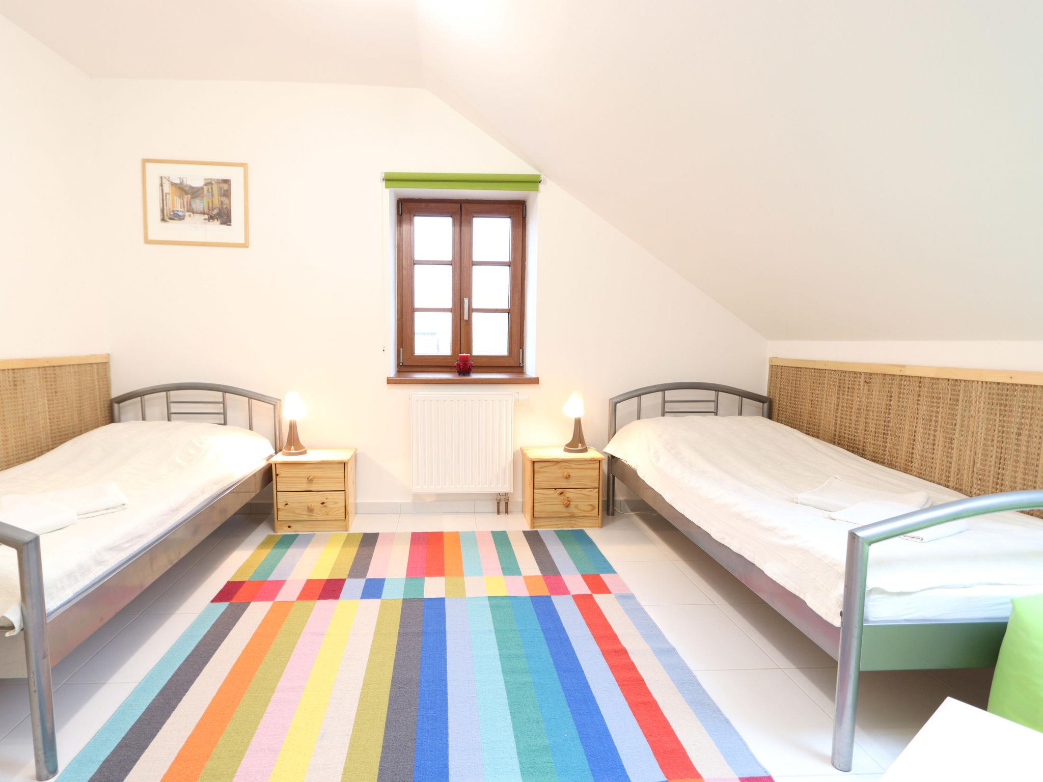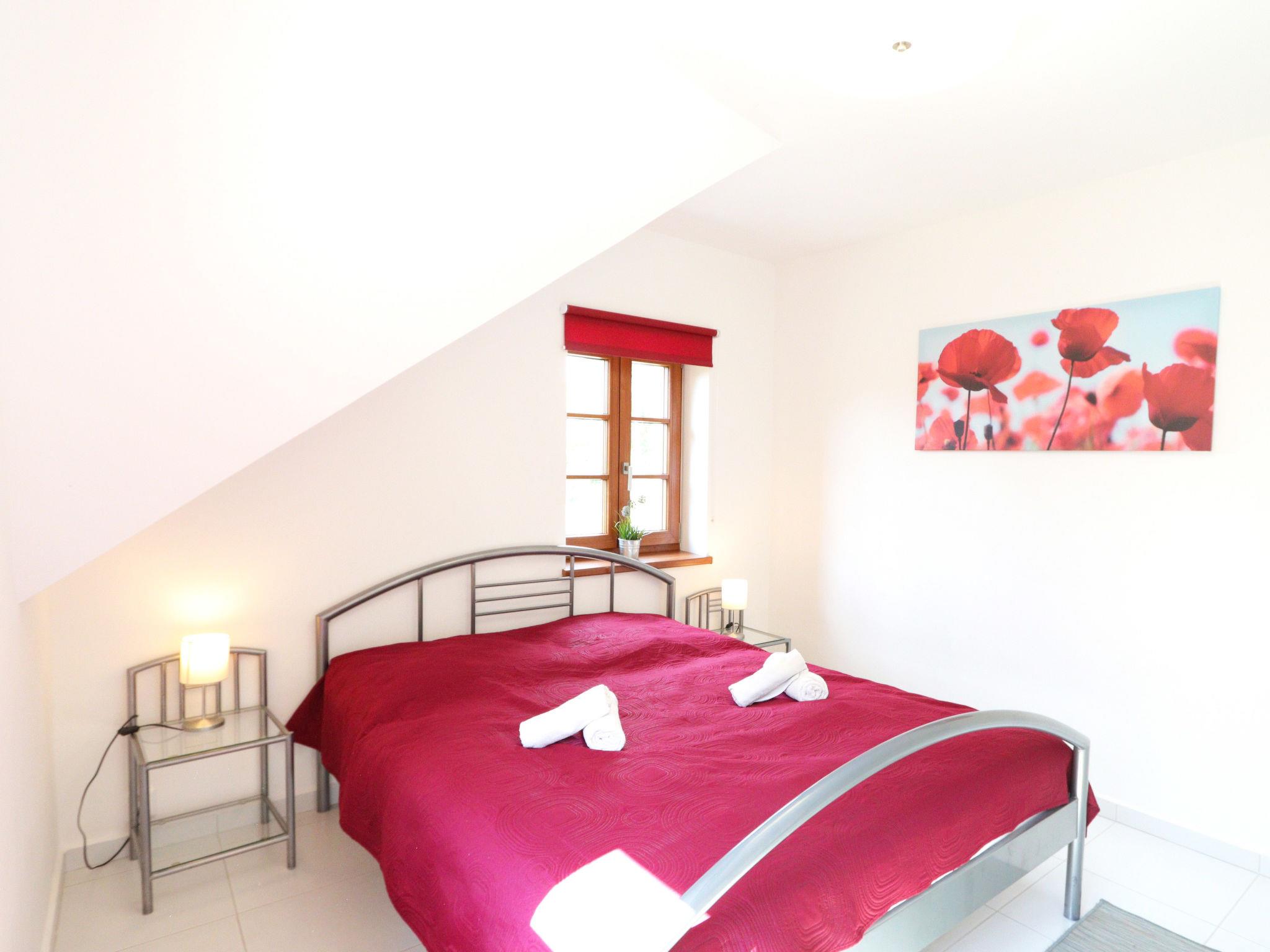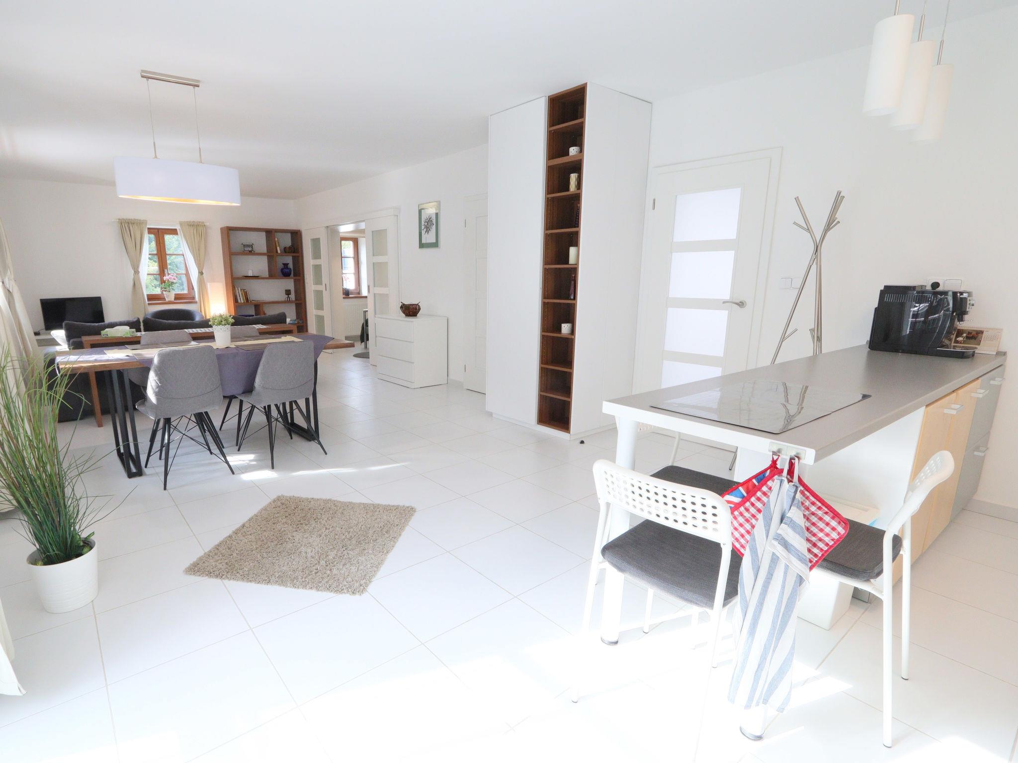 5-room house 175 m2. Bright, renovated, comfortable furnishings: large living room with 1 sofabed, dining table and satellite TV. 1 room with 1 double bed. 1 room with 2 beds. Open kitchen (oven, dishwasher, 4 ceramic glass hob hotplates, kettle, microwave, freezer, electric coffee machine). Shower, sep. WC. Heating. Upper floor: living room with 1 sofabed and satellite TV. 1 room with sloping ceilings with 1 double bed. Kitchenette (oven, 4 ceramic glass hob hotplates, kettle, microwave) with dining table. Shower/WC. Heating. Terrace. Terrace furniture, deck chairs. View of the garden and the forest. Facilities: sauna (extra). Internet (WiFi, free). Please note: suitable for families. Non-smoking house. 1 small pet/ dog allowed.
