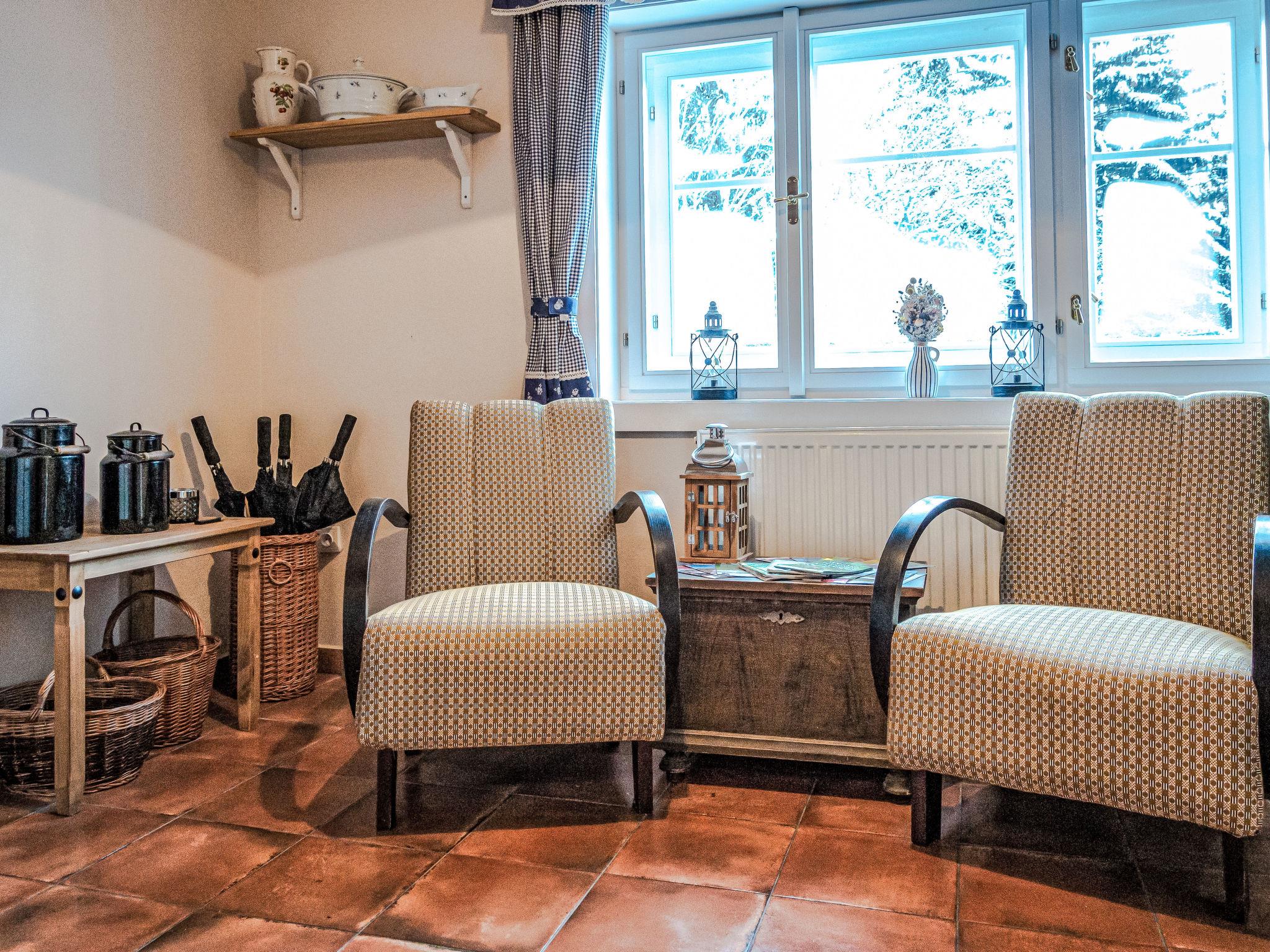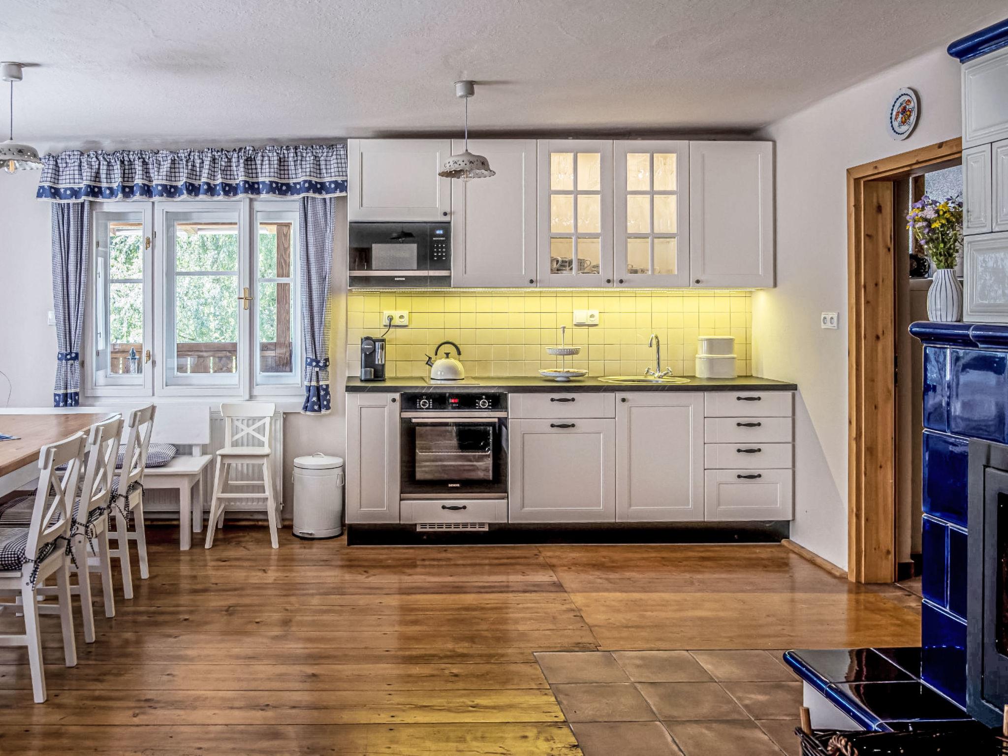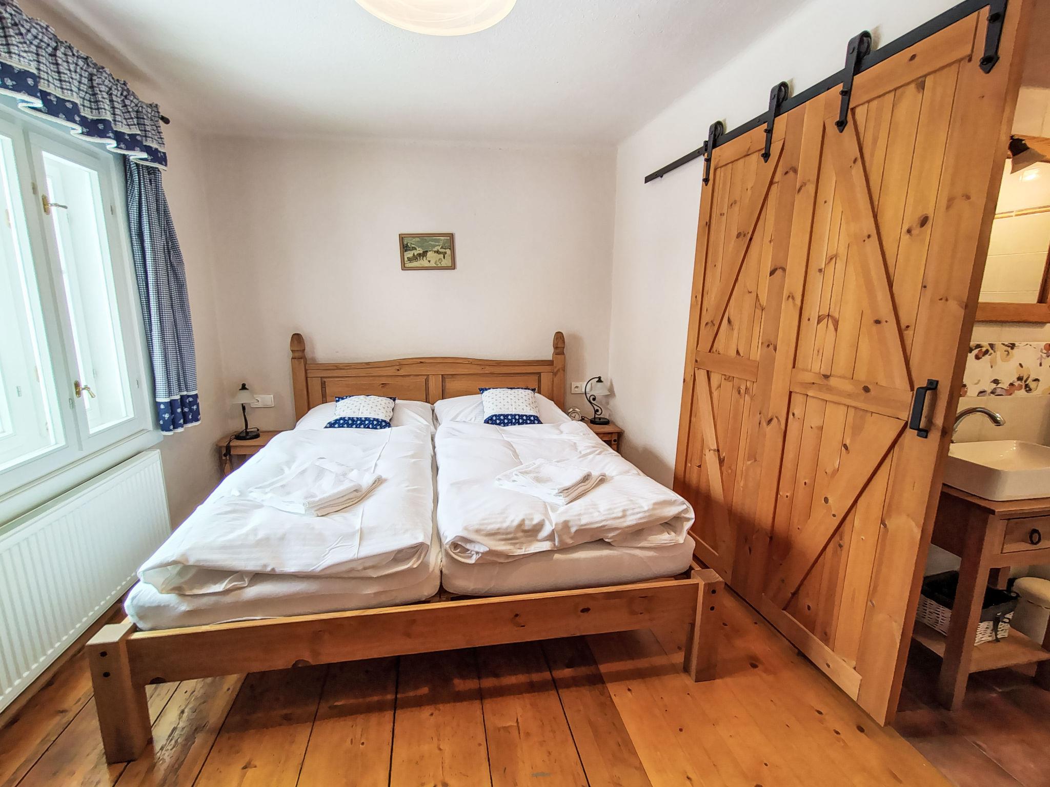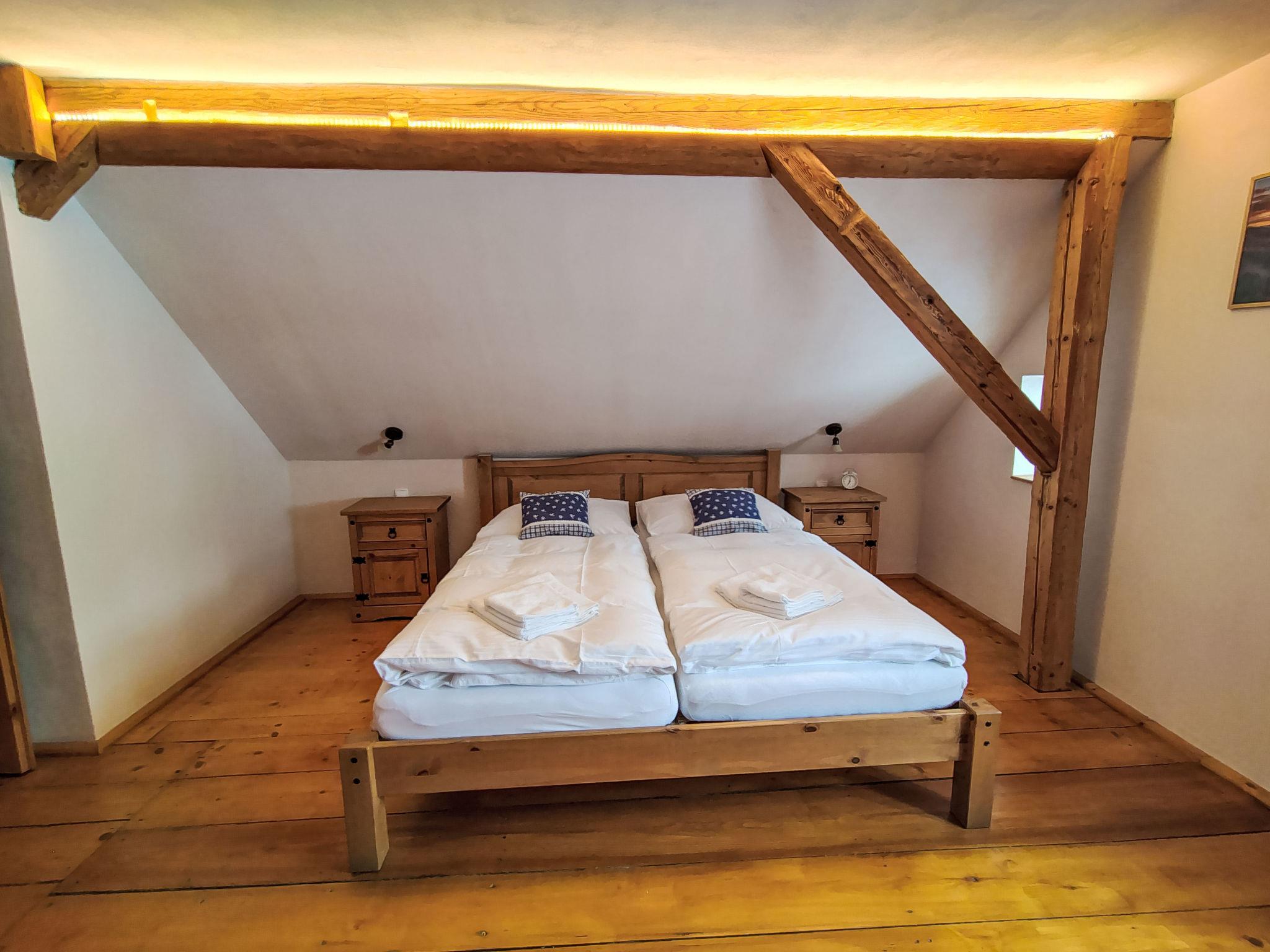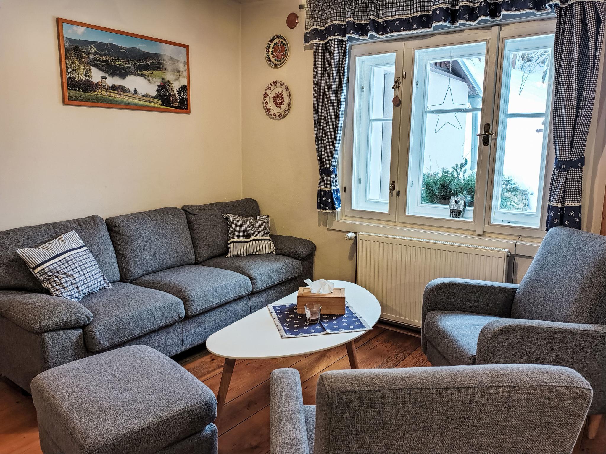 5-room cottage. Very beautiful and rustic furnishings: entrance hall with separate WC. Exit to the veranda. Open large living/dining room with 1 sofabed, dining table and wood-burning stove. Large, open kitchen (oven, dishwasher, 4 ceramic glass hob hotplates, toaster, kettle, microwave, freezer, electric coffee machine, Capsules for coffee machine (Nespresso)). Sep. WC, Sauna. 2nd upper floor: 1 room with 2 beds, 1 double bed and shower/WC. 1 room with 1 double bed and shower/WC. 1 room with 1 double bed and shower/WC. 1 room with 2 beds, 1 double bed and bath/WC. Wooden floors. Terrace furniture. View of the mountains, the garden and the forest. Facilities: washing machine, sauna, children's high chair, baby cot, hair dryer. Internet (WiFi, free). Please note: suitable for families. Non-smokers only. 1 pet/ dog allowed.