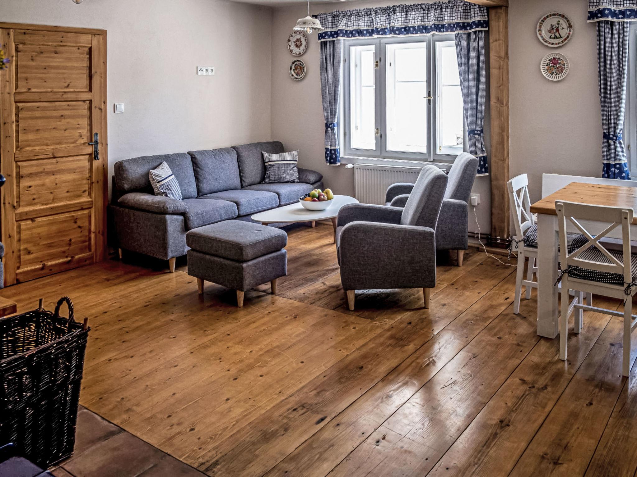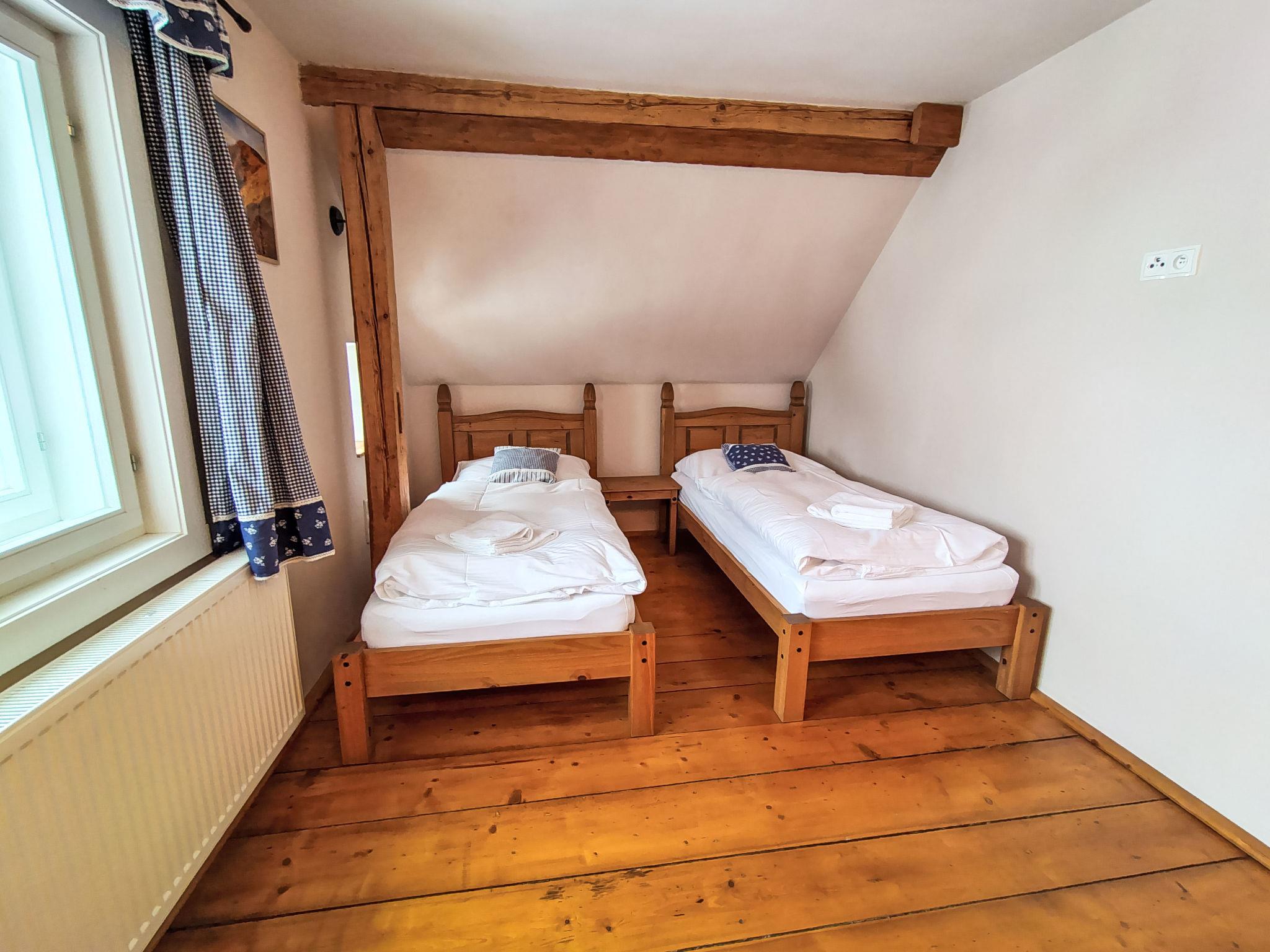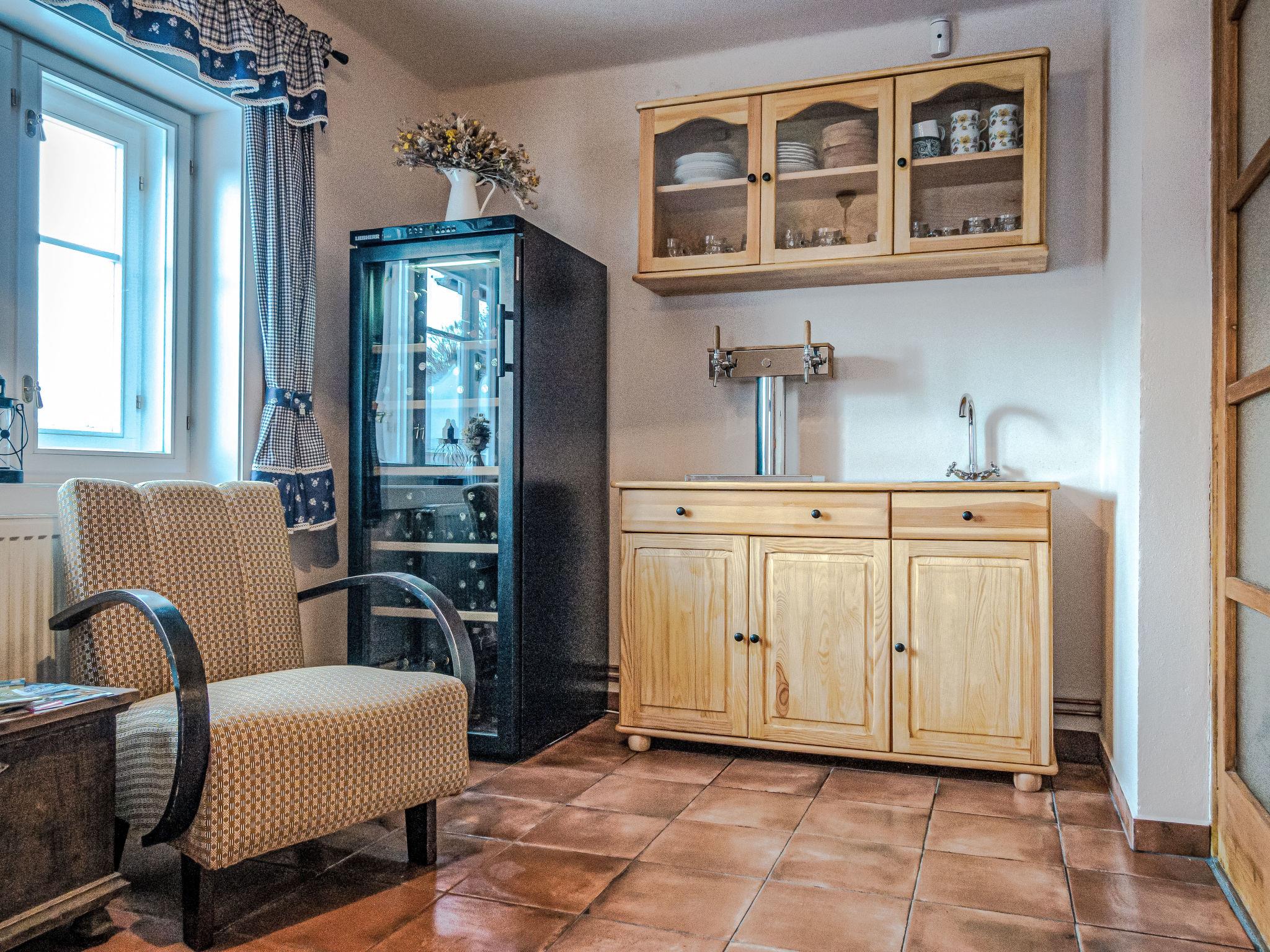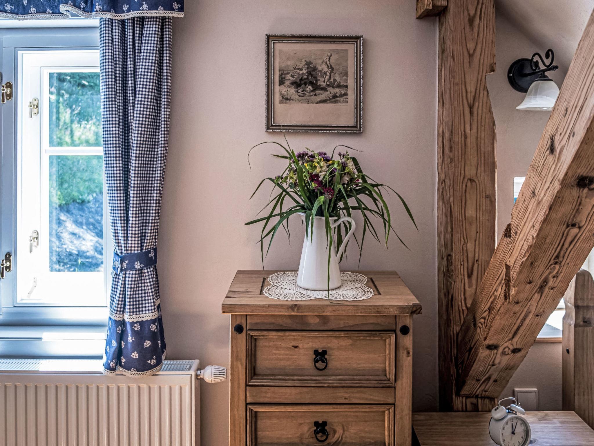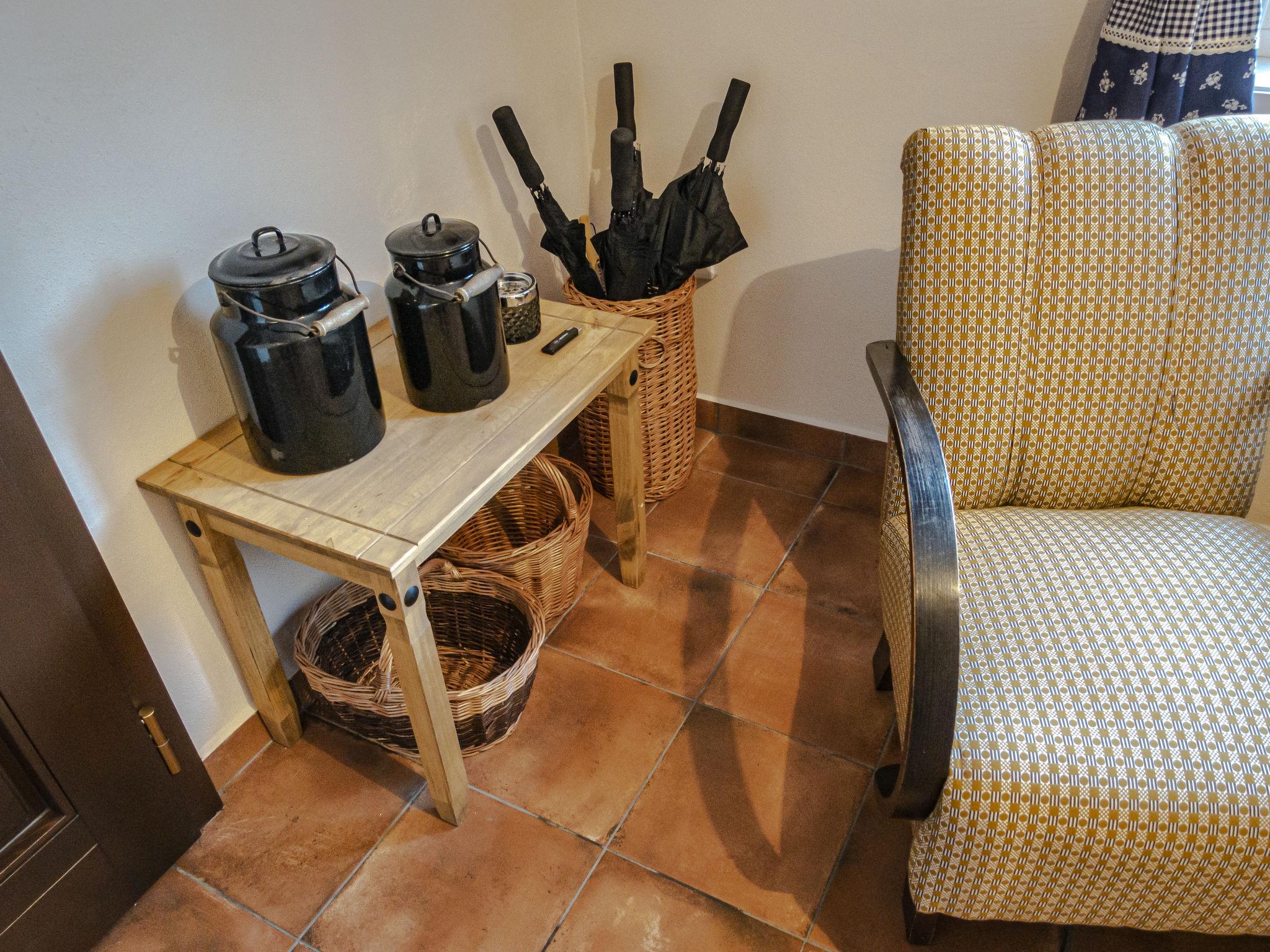 5-room cottage. Very beautiful and rustic furnishings: entrance hall with separate WC. Exit to the veranda. Open large living/dining room with 1 sofabed, dining table and wood-burning stove. Large, open kitchen (oven, dishwasher, 4 ceramic glass hob hotplates, toaster, kettle, microwave, freezer, electric coffee machine, Capsules for coffee machine (Nespresso)). Sep. WC, Sauna. 2nd upper floor: 1 room with 2 beds, 1 double bed and shower/WC. 1 room with 1 double bed and shower/WC. 1 room with 1 double bed and shower/WC. 1 room with 2 beds, 1 double bed and bath/WC. Wooden floors. Terrace furniture. View of the mountains, the garden and the forest. Facilities: washing machine, sauna, children's high chair, baby cot, hair dryer. Internet (WiFi, free). Please note: suitable for families. Non-smokers only. 1 pet/ dog allowed.