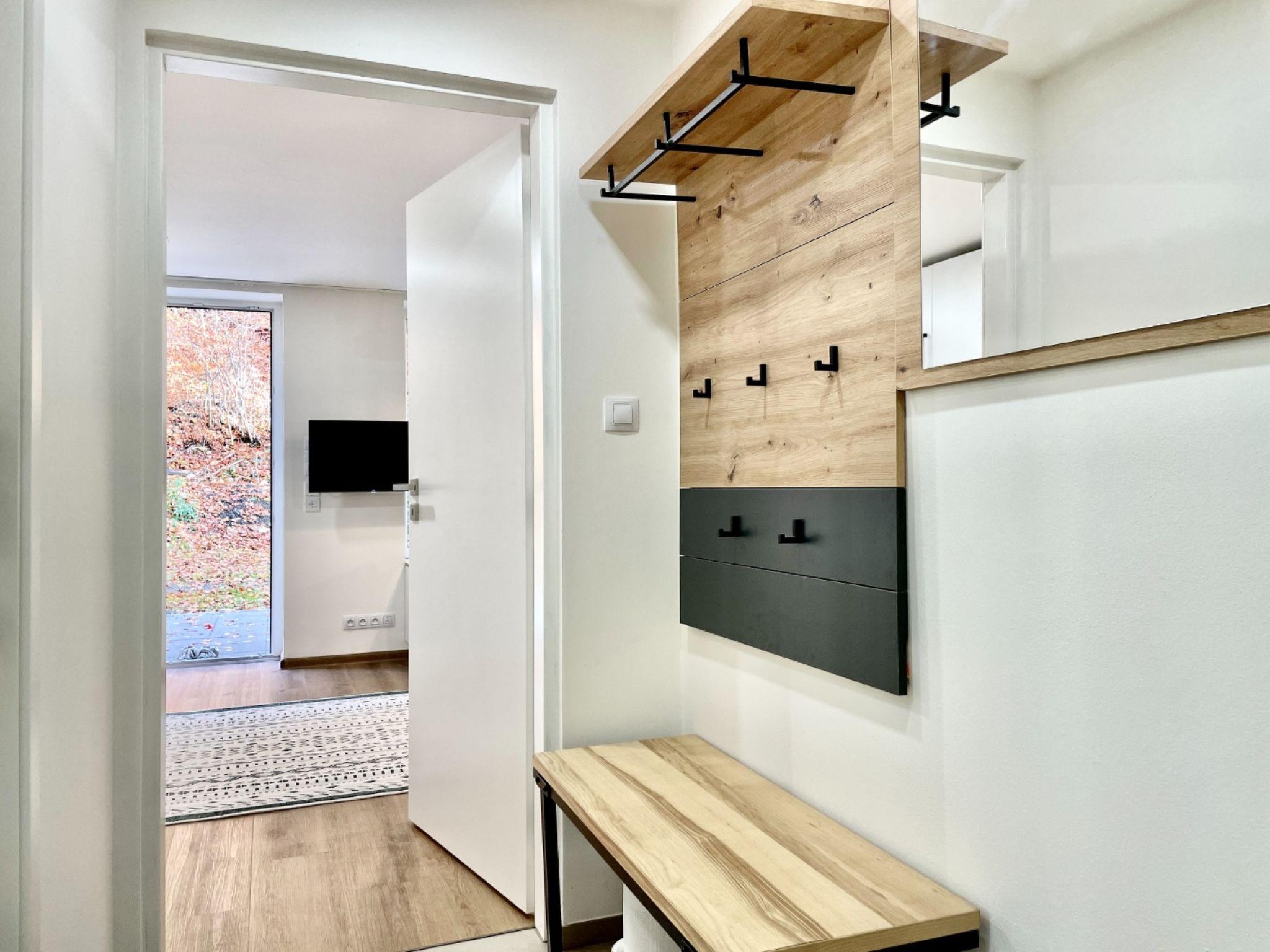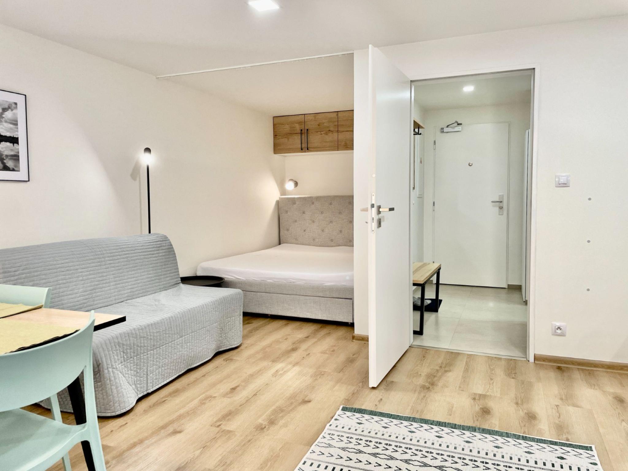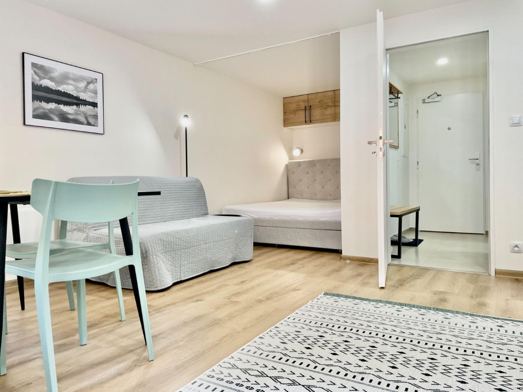 1-room apartment 32 m2, on the ground floor. Modern and cosy furnishings: entrance hall. Living/sleeping room with 1 double sofabed, 1 double bed, dining table and TV. Kitchenette (dishwasher, 2 ceramic glass hob hotplates, kettle, microwave, electric coffee machine) with dining table. Exit to the terrace. Shower/WC. Electric heating, floor heating. Terrace. Terrace furniture. View of the forest. Facilities: Internet (WiFi, free). Please note: suitable for families. Non-smokers only.