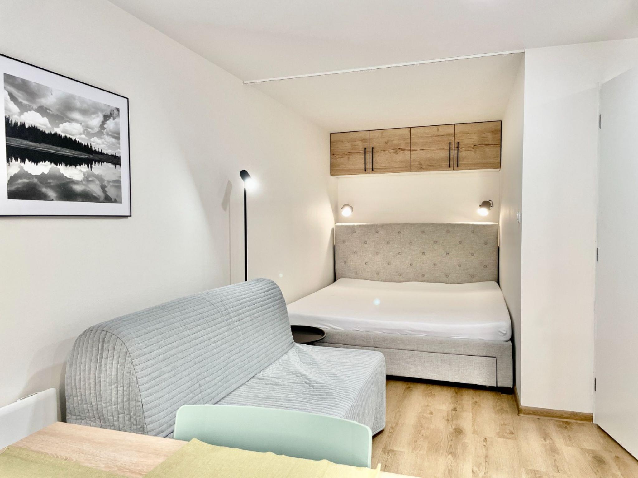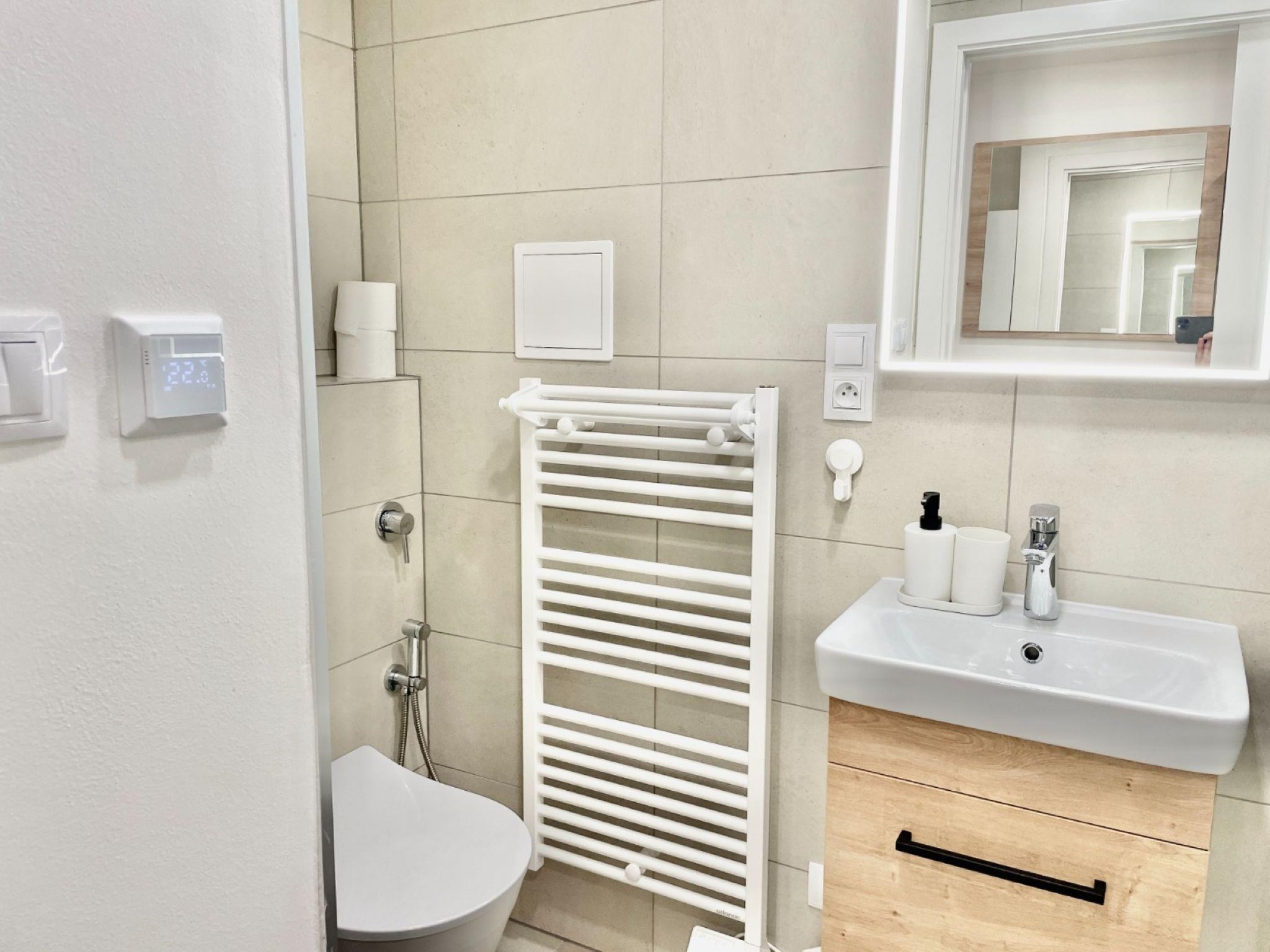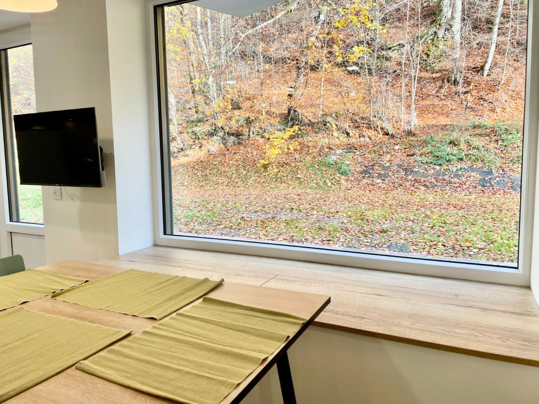 1-room apartment 32 m2, on the ground floor. Modern and cosy furnishings: entrance hall. Living/sleeping room with 1 double sofabed, 1 double bed, dining table and TV. Kitchenette (dishwasher, 2 ceramic glass hob hotplates, kettle, microwave, electric coffee machine) with dining table. Exit to the terrace. Shower/WC. Electric heating, floor heating. Terrace. Terrace furniture. View of the forest. Facilities: Internet (WiFi, free). Please note: suitable for families. Non-smokers only.