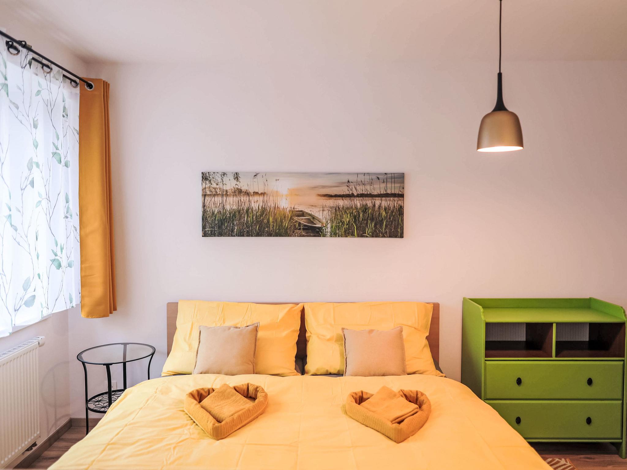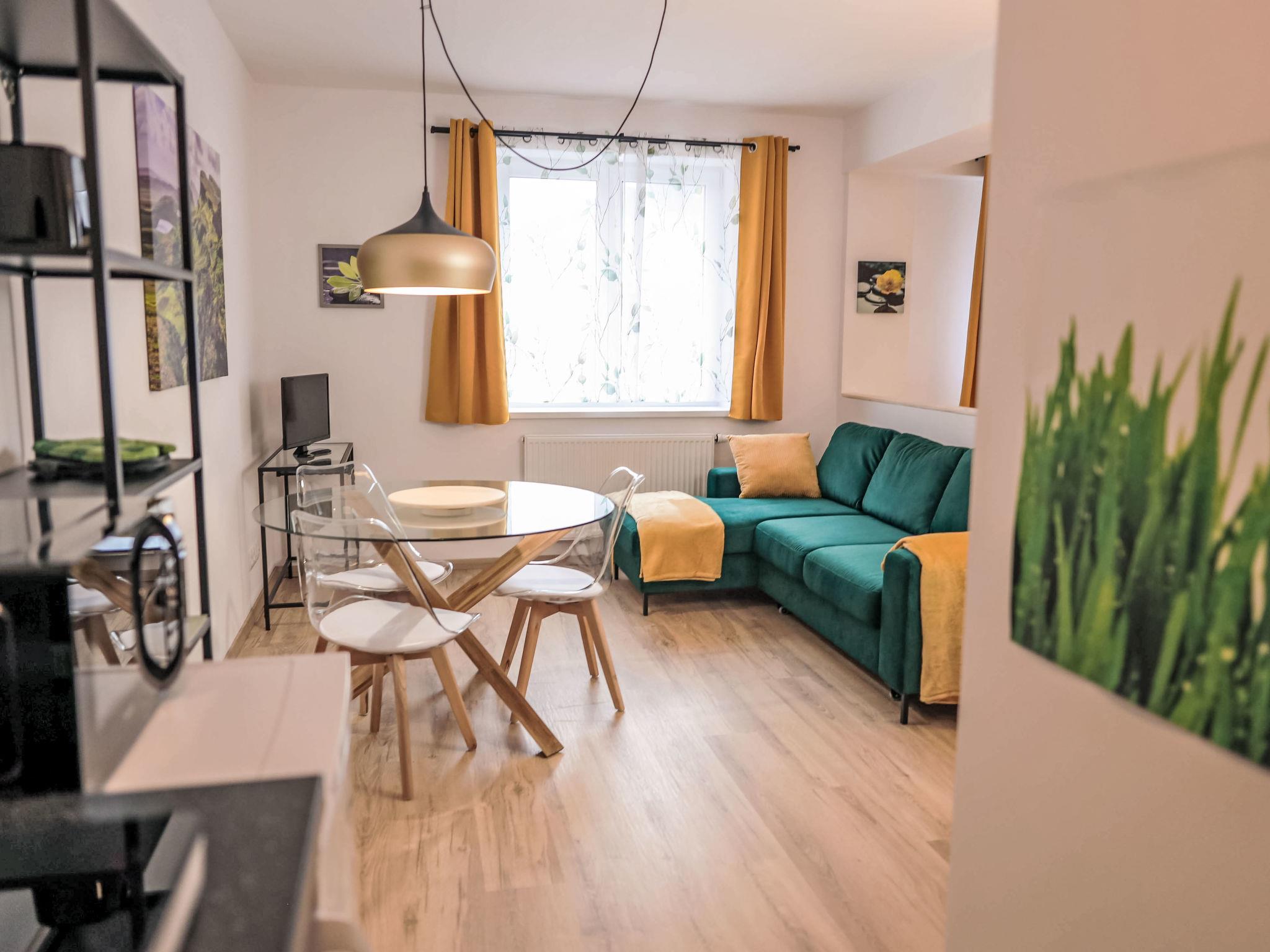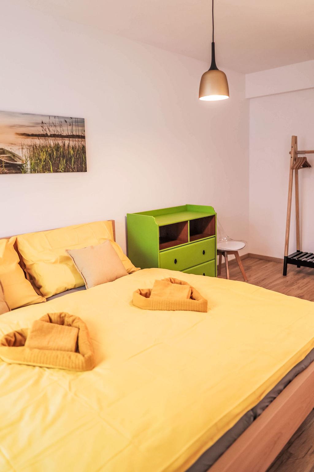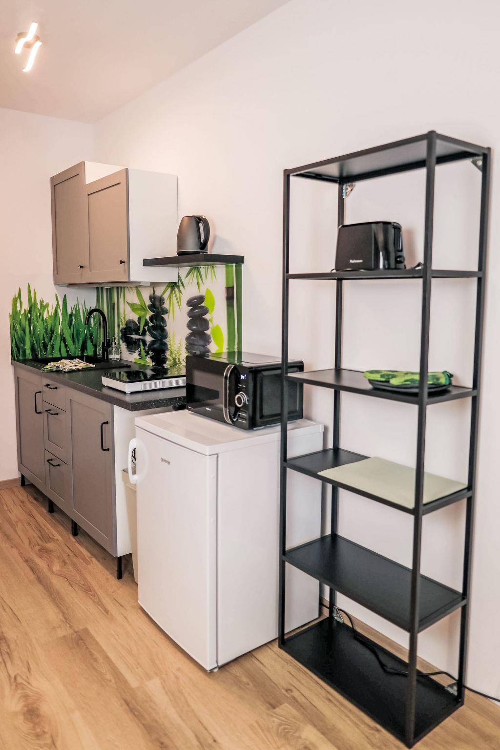 "Atom", 1-room apartment 40 m2 on 3rd floor. Living/sleeping room with 1 double sofabed, 1 double bed and TV. Kitchenette (2 hot plates, toaster, kettle, microwave, freezer). Shower/WC. Electric heating. View of the countryside. Facilities: hair dryer. Internet (WiFi, free). Parking at the house. Please note: suitable for families. Non-smokers only.