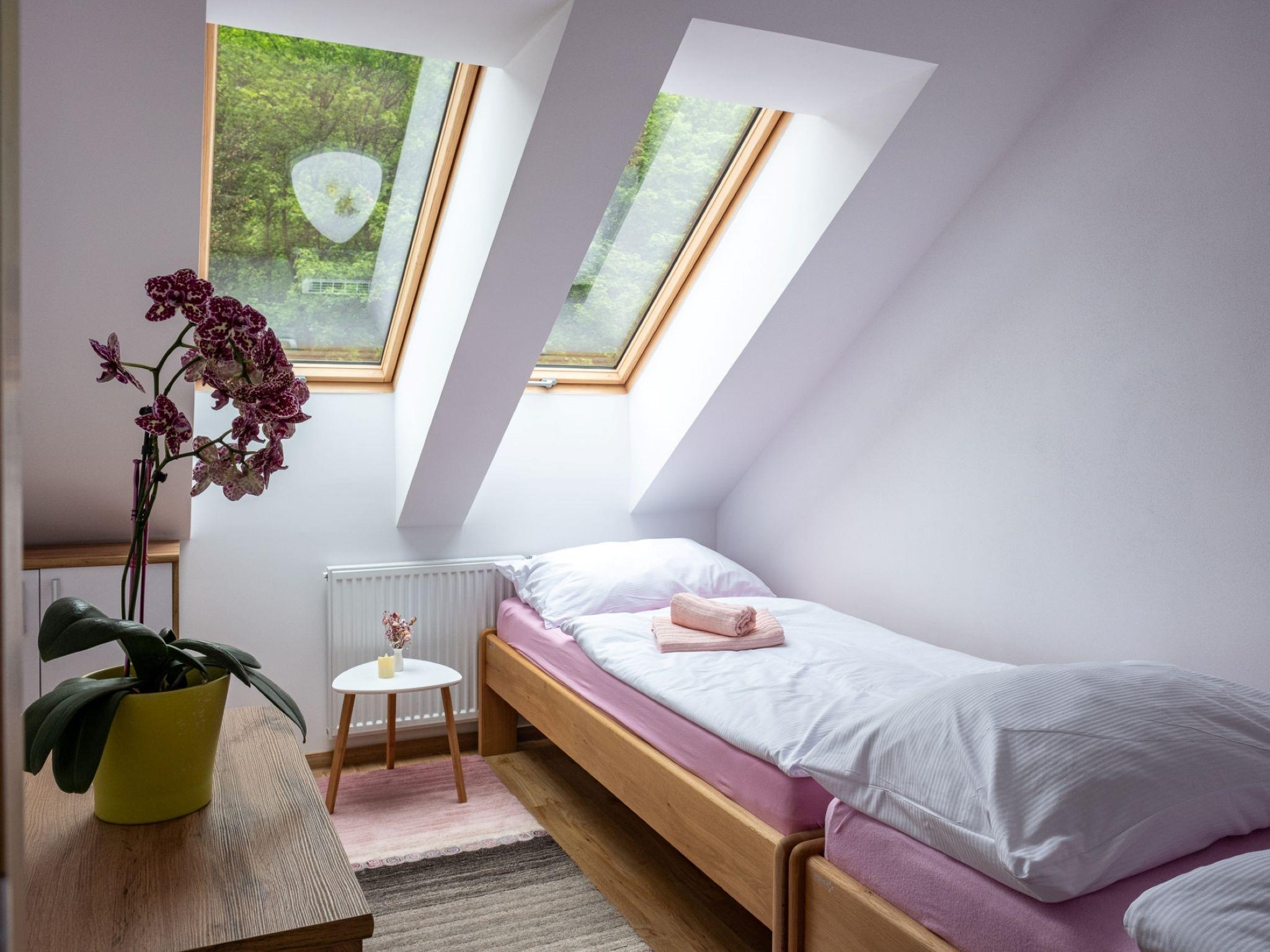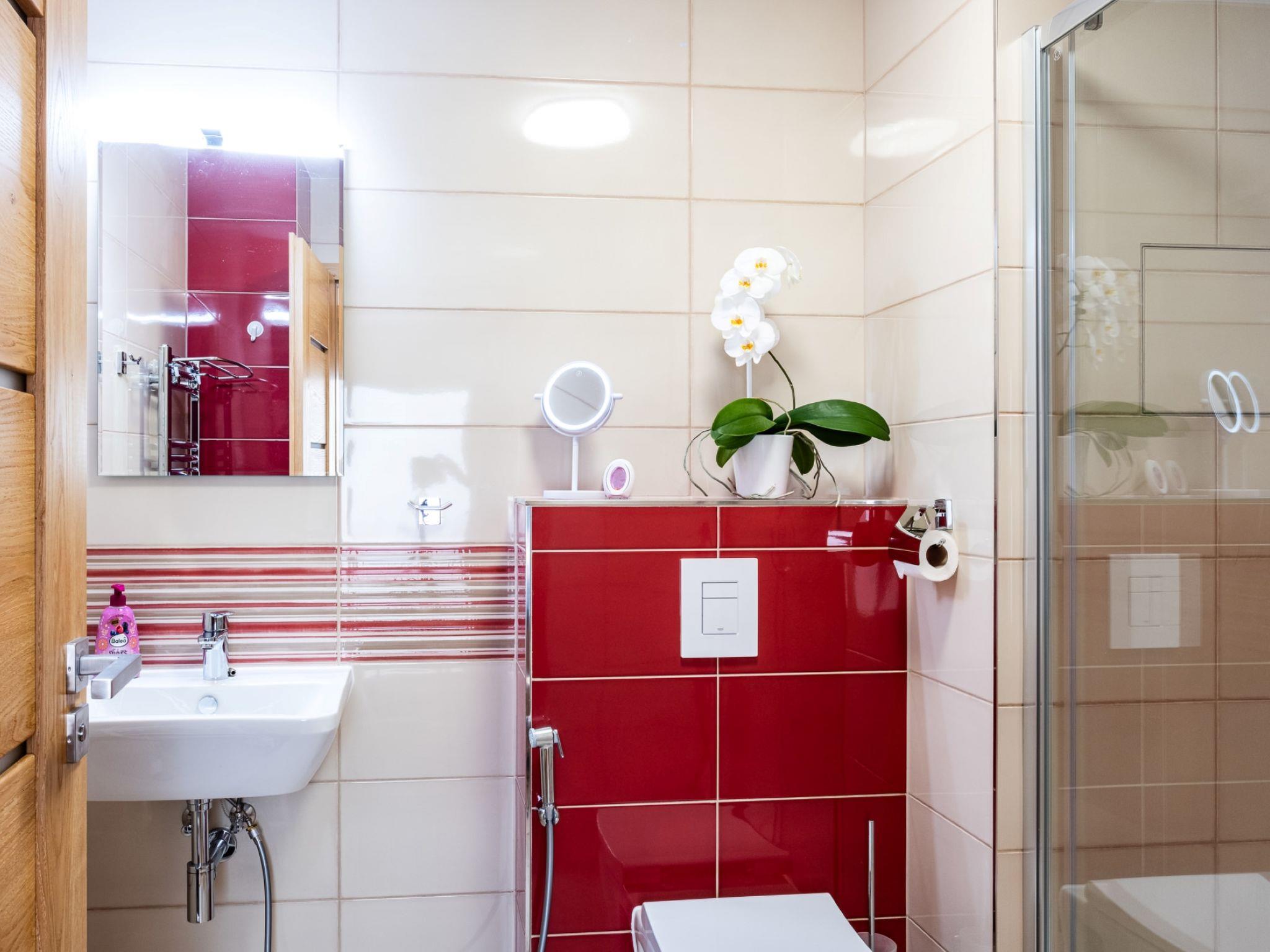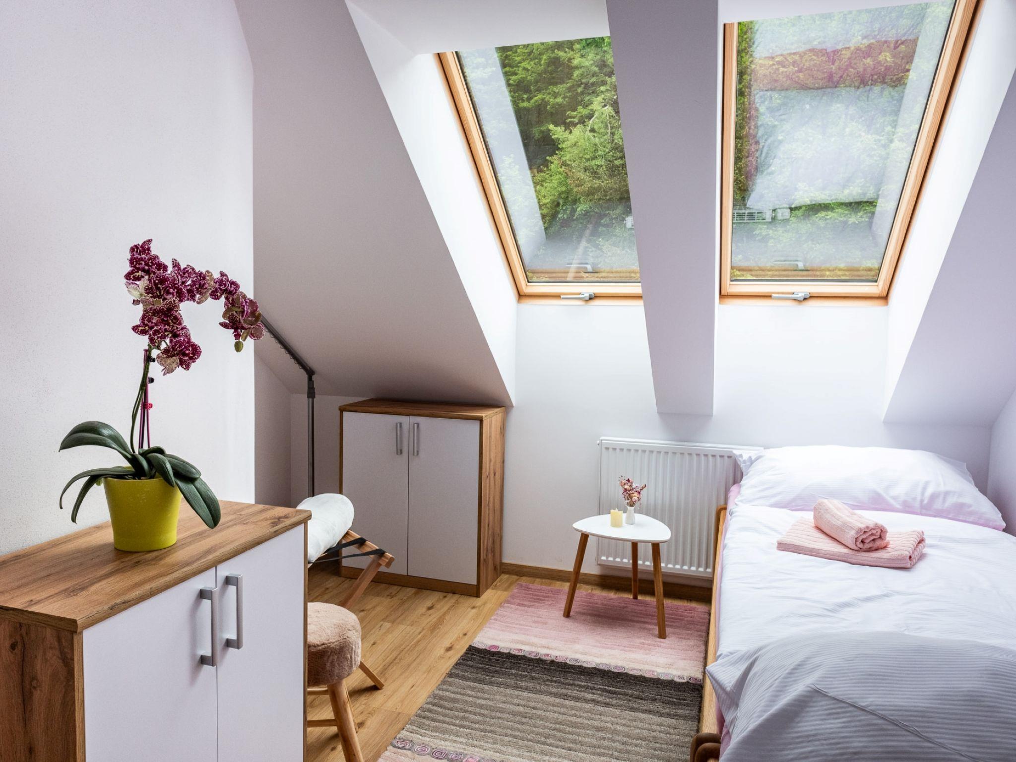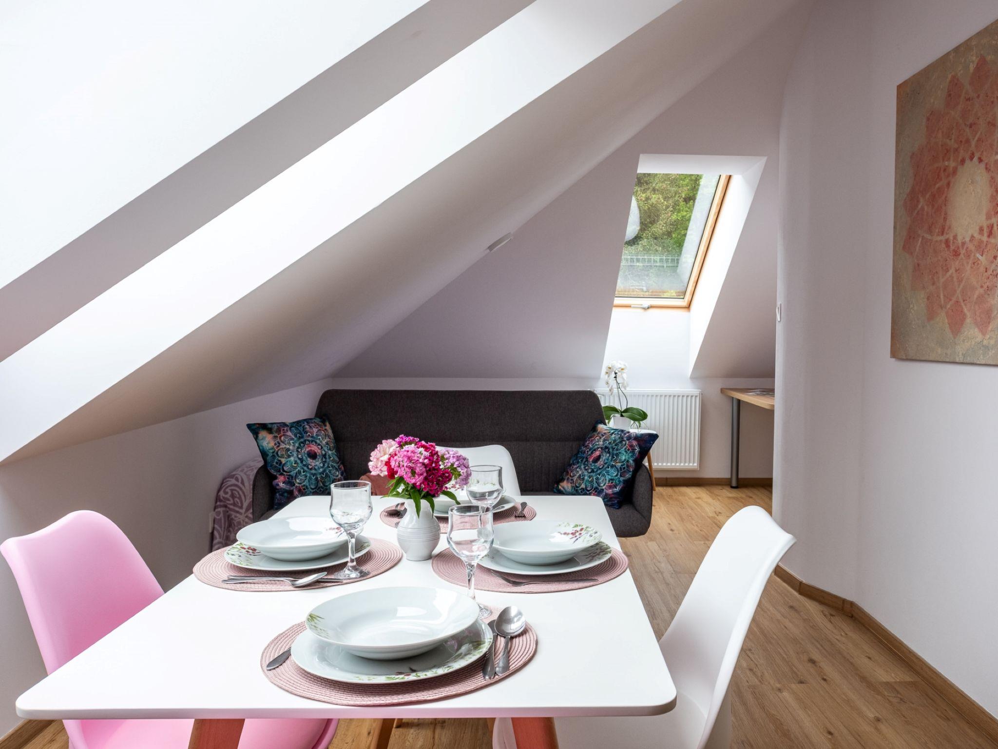 "Pink Mandala", 2-room apartment 42 m2, on the top floor. Very beautiful furnishings: entrance hall. Upper floor: (spiral staircase) living/dining room with sloping ceilings with 1 double bed (160 cm), dining table and TV (flat screen). 1 room with sloping ceilings with 2 beds. Kitchenette (2 induction hot plates, toaster, kettle, microwave, electric coffee machine). Shower/bidet/WC. Heating, gas heating. View of the mountains and the town. Facilities: hair dryer. Internet (WiFi, free). Parking (1 car). E-charging station. Please note: suitable for families. Non-smokers only. Nespresso coffee machine. Bidet shower. Cellar with shoe dryer. Possibility of connection with apartment CZ3625.250.12.
