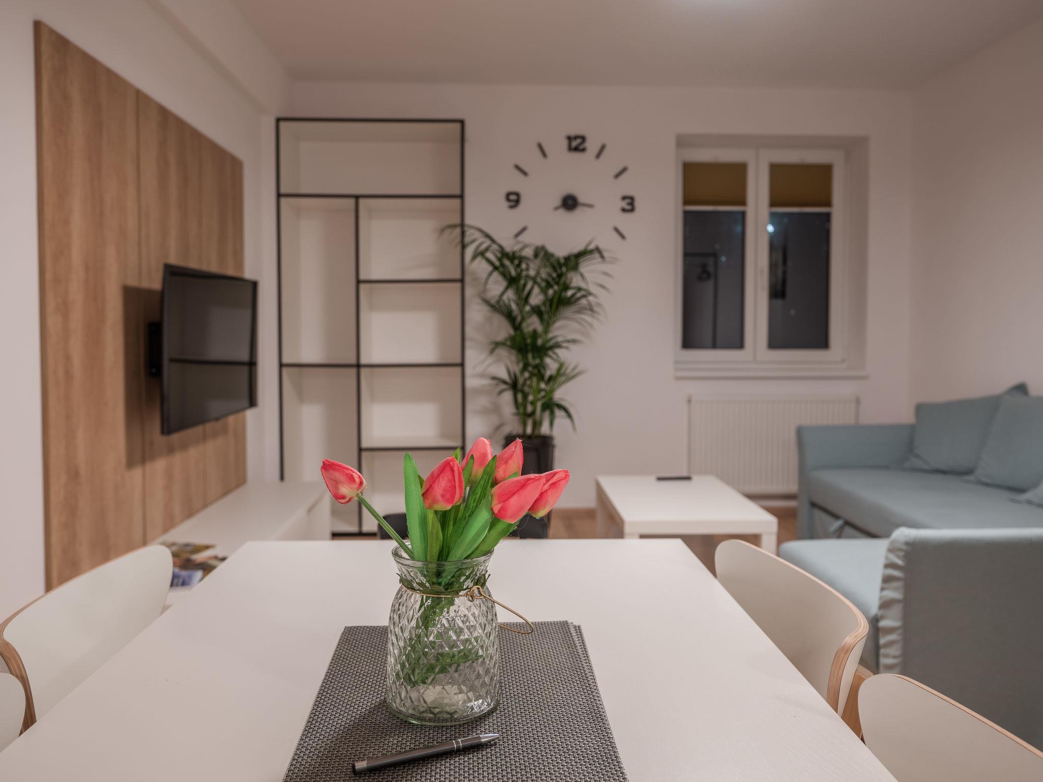 "Claudia", 2-room apartment 54 m2. Object suitable for 4 adults + 1 child. Living room with 1 double sofabed and TV. 1 room with 1 sofabed and 1 double bed. Kitchenette (oven, dishwasher, 2 ceramic glass hob hotplates, kettle, microwave, freezer, grill, electric coffee machine, Capsules for coffee machine (Nespresso) free) with dining table. Shower/WC. Electric heating. View of the town. Facilities: washing machine, dryer, children's high chair, baby cot. Internet (WiFi, free). Parking at the house. Please note: suitable for families. Non-smokers only. Maximum 1 pet/ dog allowed.