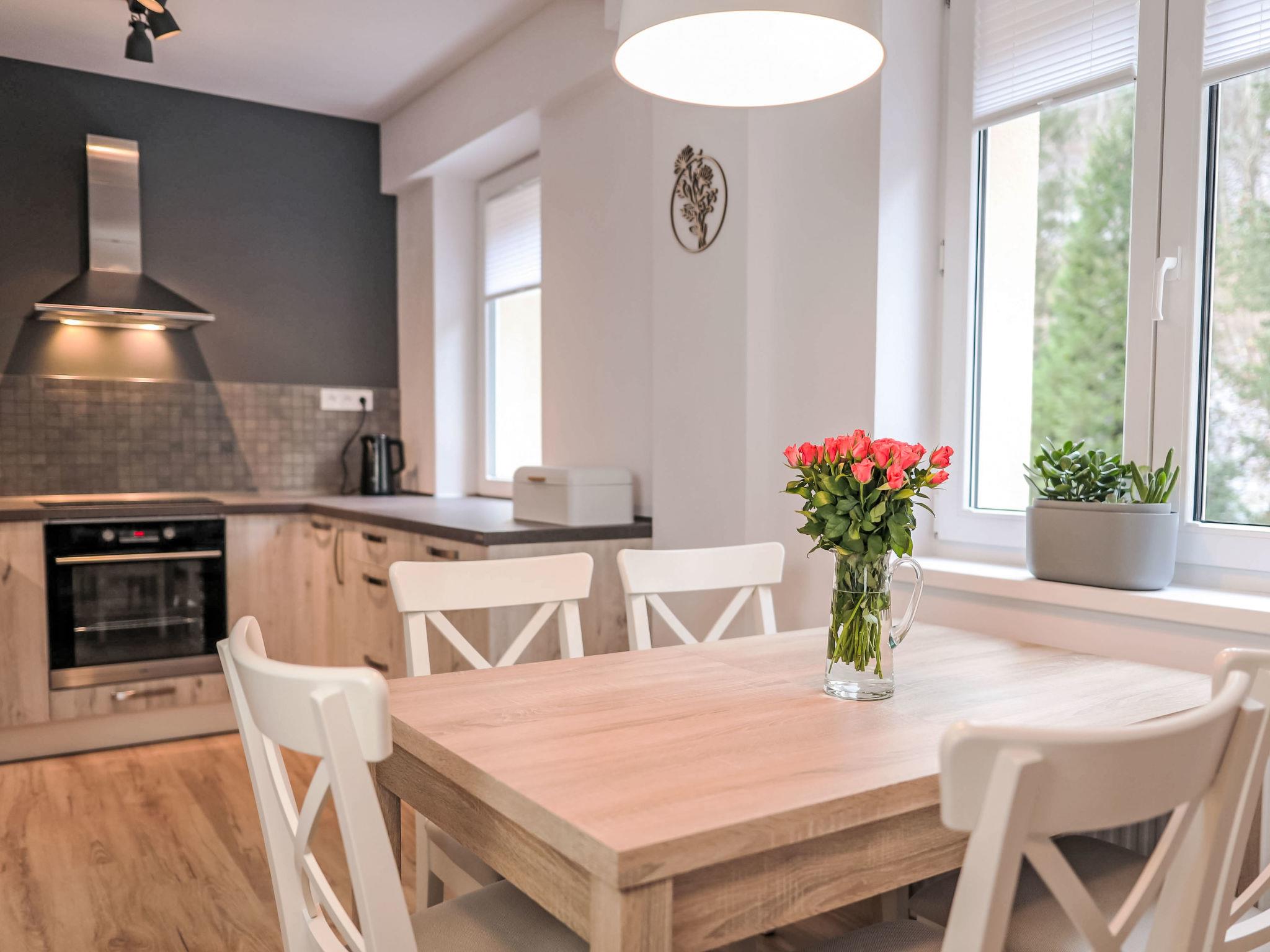 Modern apartment block, 4 storeys, built in 2023. In the centre of Jáchymov, 2.5 km from the skiing area. In the house: lift, central heating system. Breakfast on request (extra). Storeroom available. Parking at the house. Grocery 100 m, supermarket 150 m, shopping centre 6 km, restaurant 100 m, pub garden, bus stop "Jáchymov" 150 m, outdoor swimming pool 15 km, indoor swimming pool 150 m. Walking paths from the house 10 m, cycle lane, chair lift 2.5 km, slopes 2.5 km, ski rental 2.5 km, ski bus stop 30 m, ski school 2.5 km, cross country ski track 5 km, ice rink 6 km, children's playground 500 m. Nearby attractions: Aqua Centre Agricola 500 m, Spa&Wellness Centre 500 m, Boží Dar 8 km, Karlovy Vary 20 km, Oberwiesetnhal 13 km, Annaberg-Buchholz 33 m. Well-known ski regions can easily be reached: Klínovec 2.5 km, Plešivec 13 km, Fichtelberg 11 km. Hiking paths: Krušnohorská magistrála, Ježíškova cesta. Please note: baby equipment on request (extra). Smoking is prohibited in all areas of the building and, with the exception of the ground floor, the use of ski boots is also prohibited.