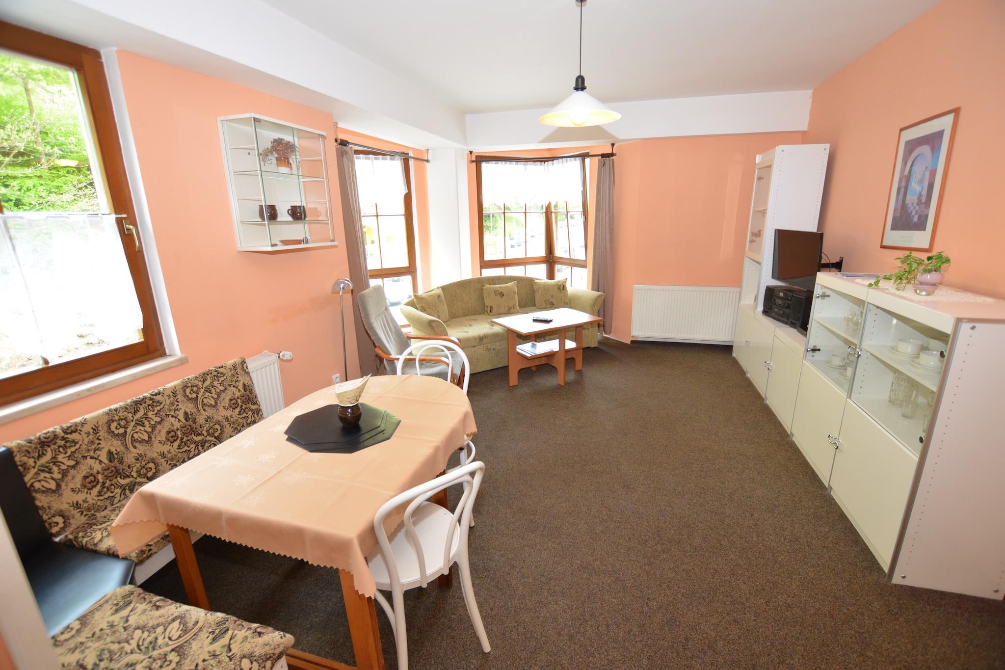 Ski & City Escape Denne kæledyrsvenlige lejlighed i Jáchymov kan rumme op til fire gæster i et soveværelse, hvilket gør den ideel til par, små familier eller venner. Stuen byder på rigelig plads til sammenkomster, mens det åbne køkken er fuldt udstyret til hjemmelavede måltider. Centralvarme holder rummet hyggeligt, og praktiske faciliteter inkluderer en opbevaringsenhed, elevator og parkering på stedet. Gratis WiFi er tilgængelig for at holde forbindelsen under dit ophold. Nærliggende attraktioner og spisning Vinterentusiaster kan drage fordel af skibussen kun 50 meter væk, med Klínovec-skiliften kun 2 km fra lejligheden. Udforsk byen Jáchymov med butikker, restauranter og almindelige forsyninger inden for 100 meter. En offentlig indendørs swimmingpool er kun 200 meter væk, og tilbyder en fantastisk mulighed for afslapning eller familiesjov. Lejlighedens centrale beliggenhed gør det nemt at nyde både skieventyr og lokale madoplevelser. Kæledyrsvenlige aktiviteter Kæledyr er velkomne, så du kan tage din lodne ledsager med. Tag naturskønne vandreture sammen omkring de omkringliggende bjerge, nyd friskluftsture gennem byen, eller udforsk nærliggende skovstier. Efter udendørs eventyr kan du slappe af i den komfortable opholdsstue eller tilberede et måltid i det fuldt udstyrede køkken. Med sin kombination af bekvemmelighed, nærhed til skifaciliteter og kæledyrsvenlige muligheder tilbyder denne lejlighed en mindeværdig base for en vinterferie eller udforskning året rundt i Jáchymov.