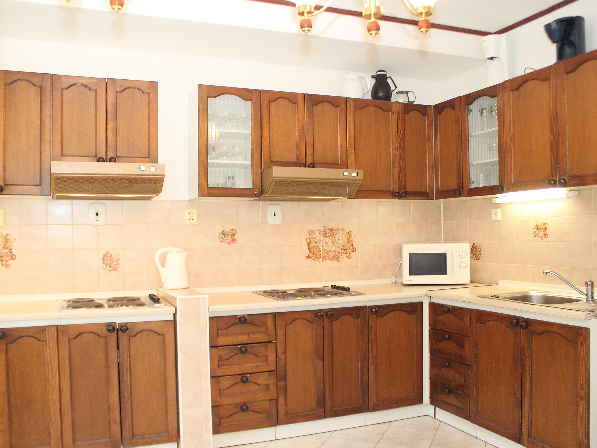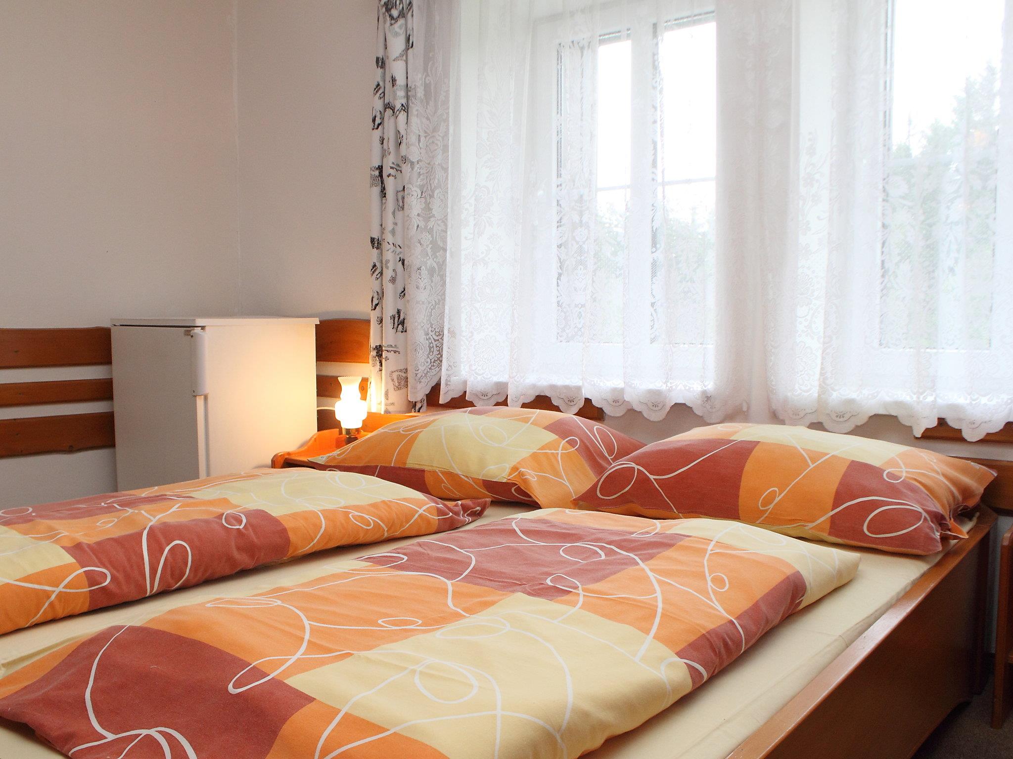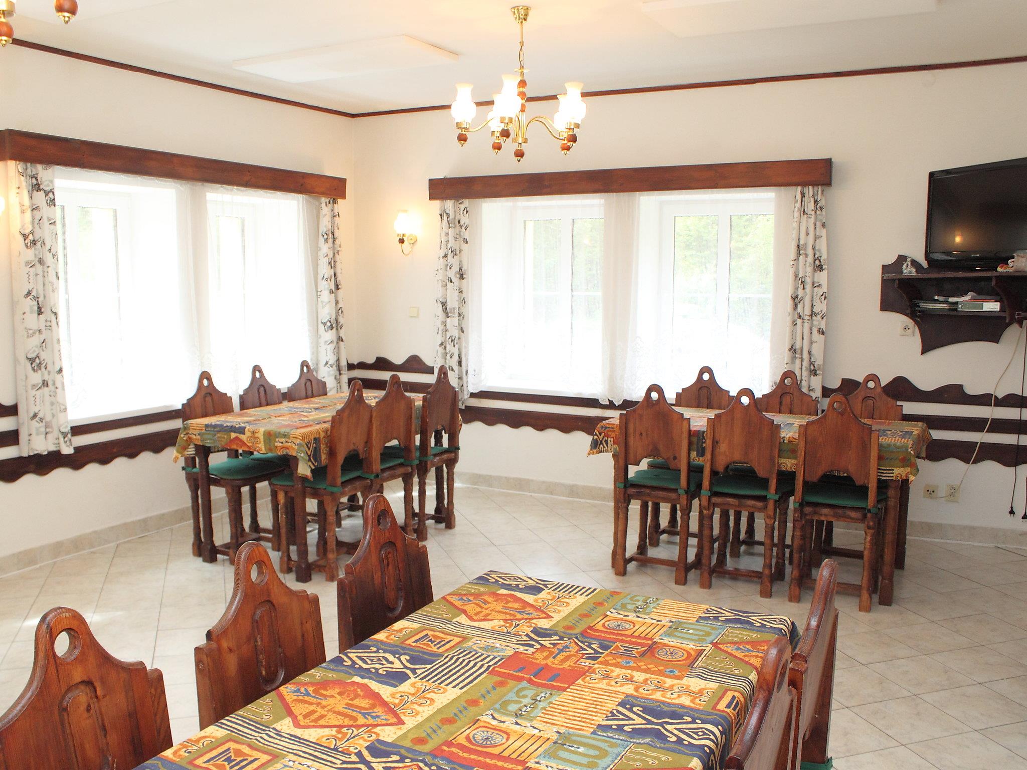 "Karlovka", 8-room house 220 m2. Simple and wooden furniture furnishings: dining room 40 m2 with TV. 1 room with 2 beds, 1 double bed, hand-basin and separate WC. 1 room with 4 beds and shower/WC. Kitchen (8 hot plates, kettle, microwave). Shower, shower/WC, 2 sep. WC's. Upper floor: shower/WC. 2nd upper floor: 2 rooms, each room with 2 beds and hand-basin. 1 room with 2 beds, 1 double bed and hand-basin. 1 room with 3 beds and hand-basin. 1 room with 4 beds. Electric heating. View of the forest. Facilities: Internet (WiFi, free). Parking. Suitable for families. Double sink in the kitchen, large fridge. Cloak room. Every room in its own colour. All rooms (except the twin rooms) have a fridge. Shower/WC on mezzanine. Ski locker. Wifi is free of charge up to 10GB, then for a fee of 15 EUR per day.