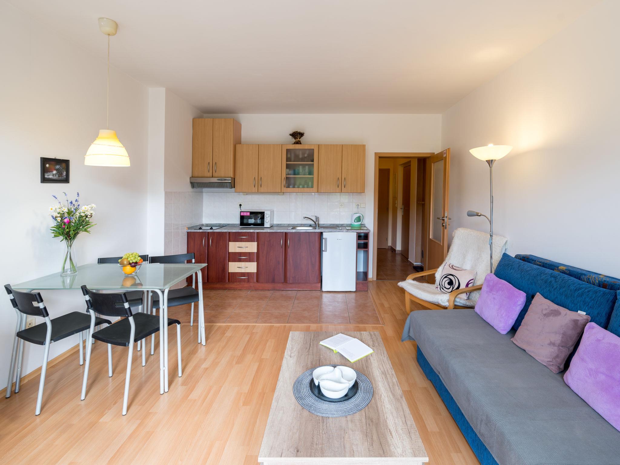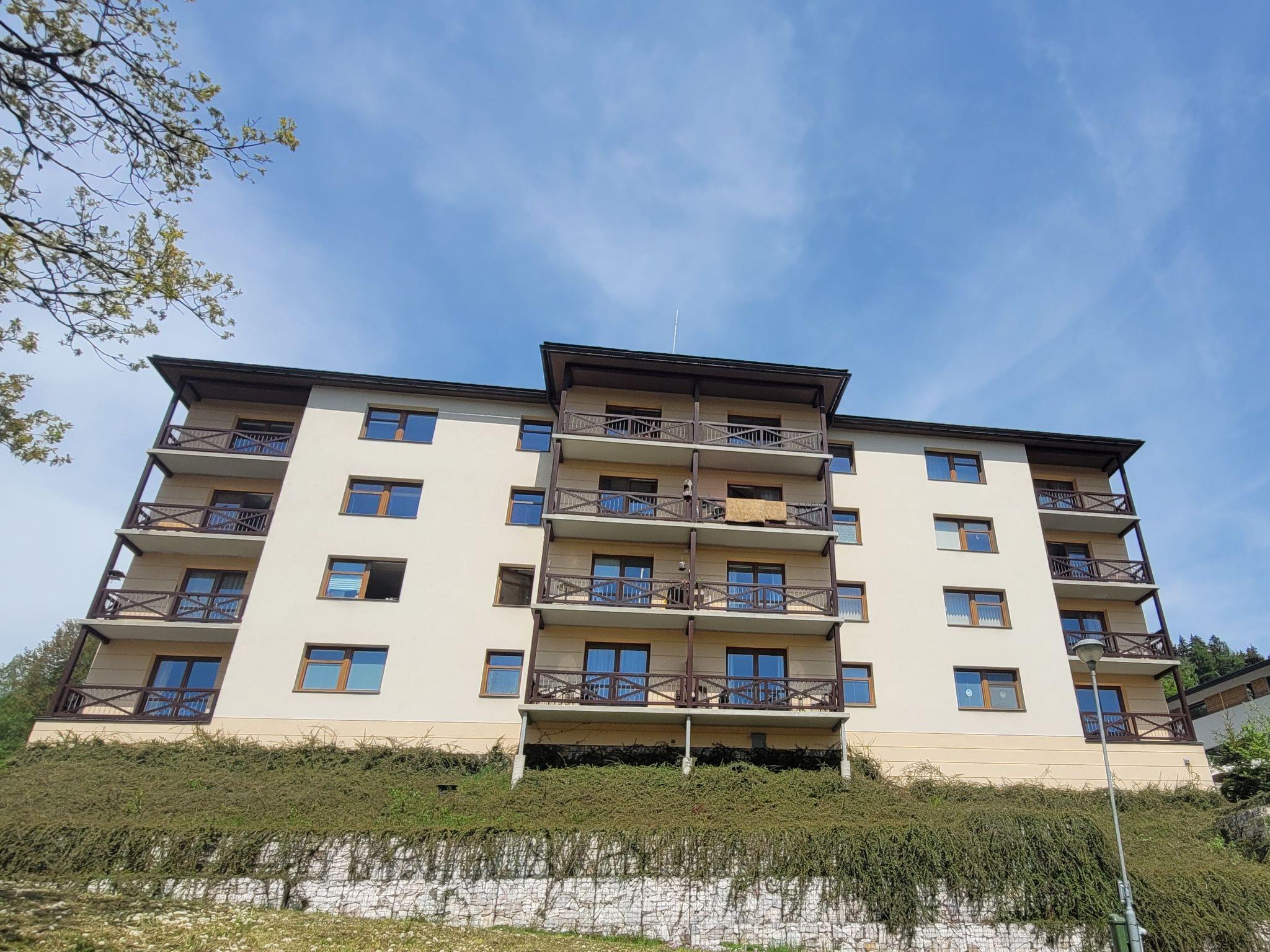 "Slunecní strán IV", 2-room apartment 46 m2 on 2nd floor. Spacious and bright, comfortable furnishings: living/sleeping room with 1 double sofabed and satellite TV. 1 room with 1 double bed. Kitchenette (2 ceramic glass hob hotplates, toaster, kettle, microwave) with dining table. Shower/WC. Balcony. Balcony furniture. Facilities: Internet (WiFi, free). Parking space n 317/9. Please note: suitable for families. Non-smokers only.