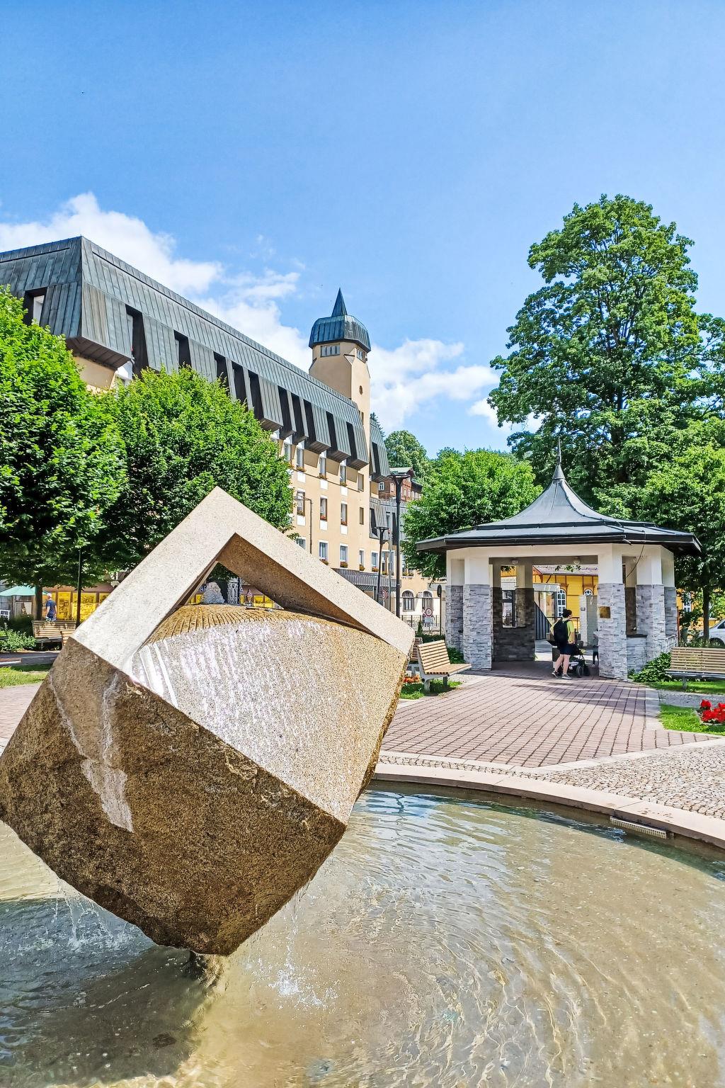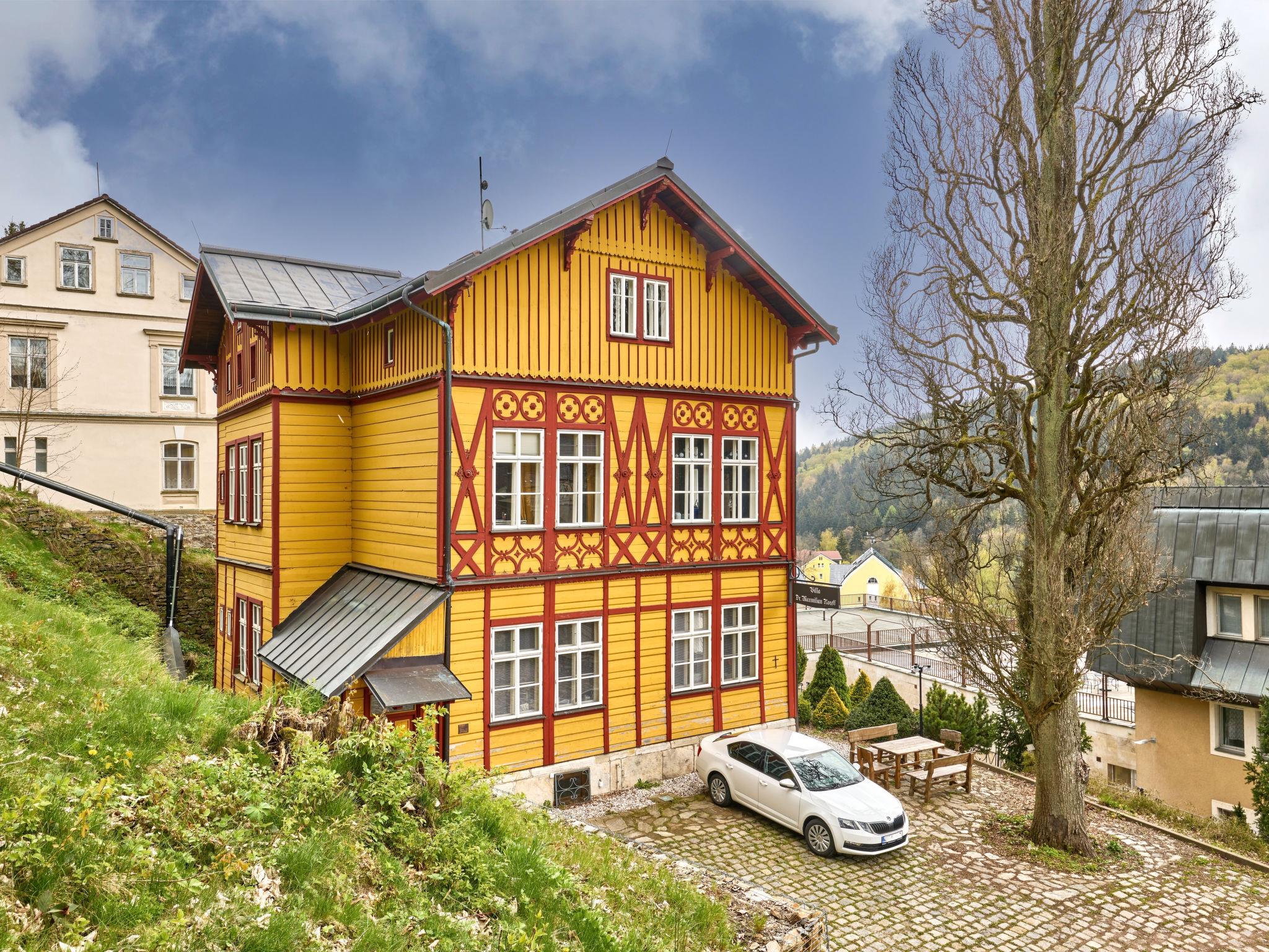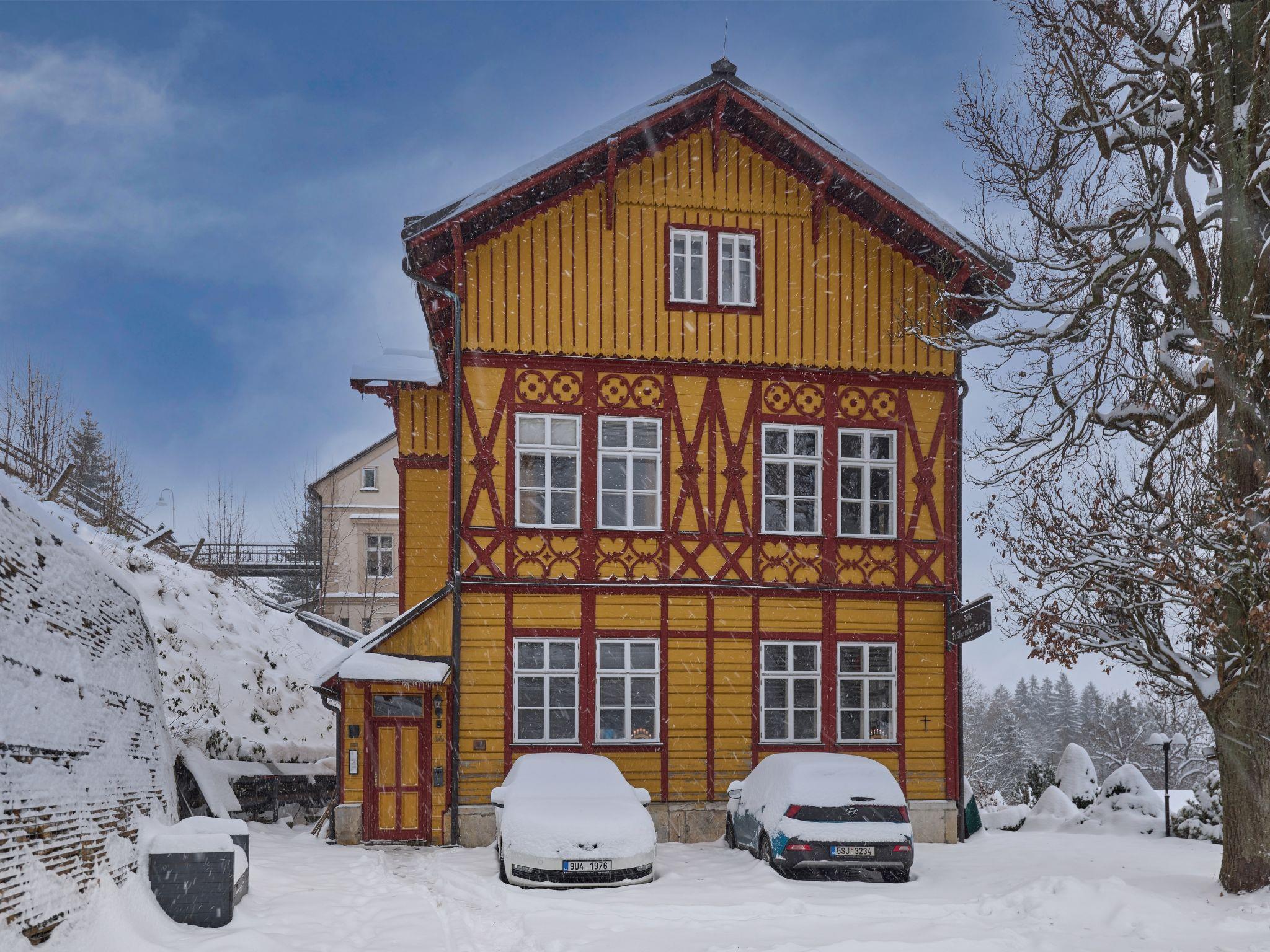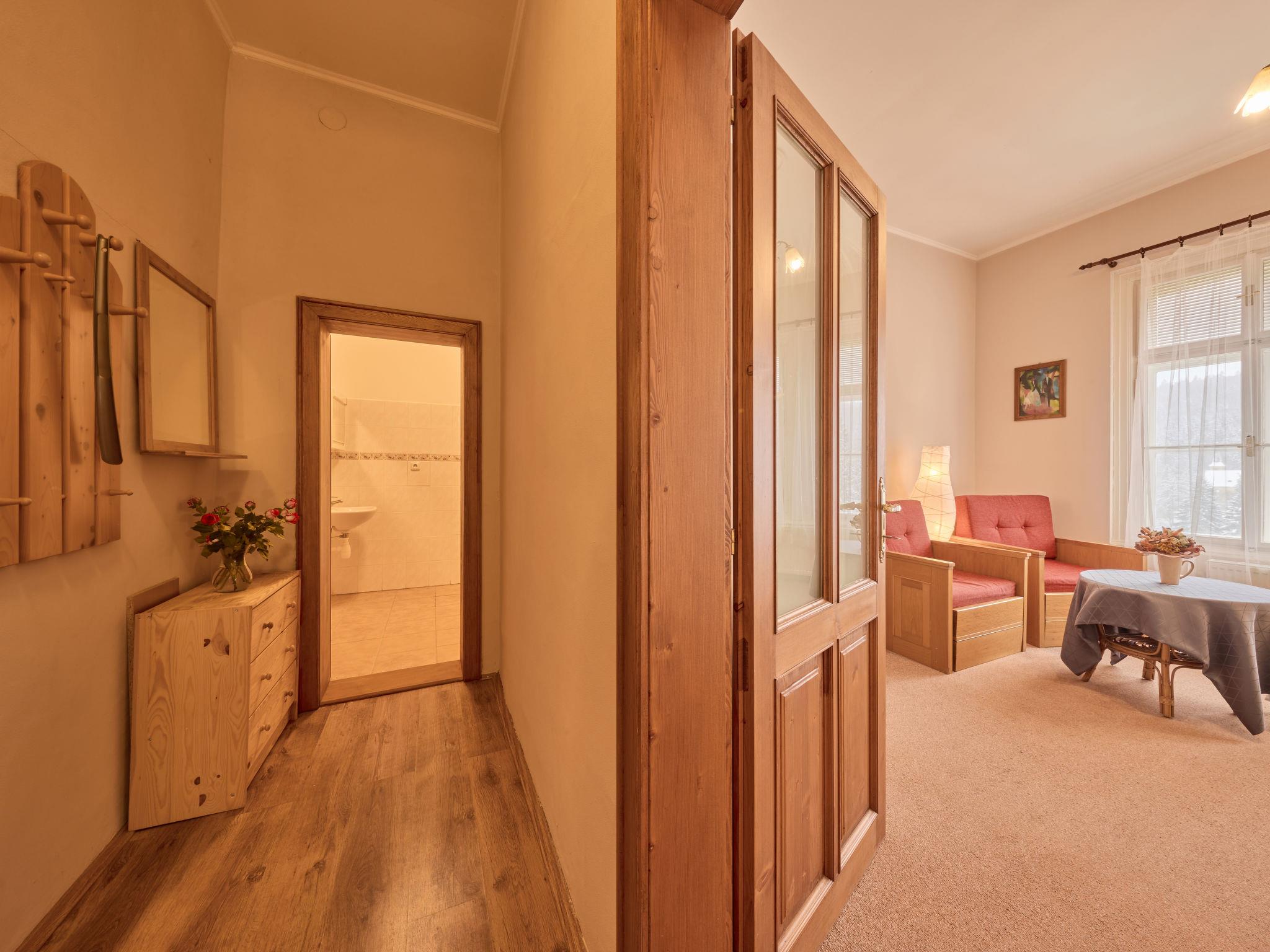 Cosy, rustic apartment house "Koreff", detached, surrounded by trees. In the resort, 200 m from the centre, in a sunny position, 500 m from the skiing area. In the house: central heating system. Linen change (suppl. charge extra). Towel change (suppl. charge extra). Room cleaning on request (extra). Parking at the house, public parking extra. Grocery 300 m, restaurant 50 m, bus stop "Janské Lázne - Lesní dum" 300 m, railway station "Svoboda nad Úpou" 3.3 km, park "Farmapark Muchomurka" 1 km, outdoor swimming pool 7 km, indoor swimming pool 400 m, thermal baths 100 m. Tennis 1 km, indoor tennis centre 800 m, minigolf 400 m, cycle lane 100 m, cable car 600 m, ski lift 300 m, chair lift 500 m, gondola lift 600 m, slopes, ski rental 300 m, ski school 400 m, children's ski school 300 m, sled run, cross country ski track 700 m. Nearby attractions: Lanovka na Cernou horu 600 m, Janské Lázne Spa, Stezka korunami stromu 1 km, bobová dráha 5 km, Pec pod Snežkou, Relaxpark, bobová dráha 11 km, Vrchlabí 10 km, Trutnov 12 km, Malá Úpa 15 km, Zoo Dvur Králové, Adršpach 35, Karpacz 40 km. Well-known ski regions can easily be reached: SkiResort CERNÁ HORA - PEC, Mladé Buky 5 km, Horní Malá Úpa 16 km, Špindleruv Mlýn 30 km. Hiking paths: krkonošské naucné stezky. Please note: no lift. The apartment is located in a zone with limited traffic.