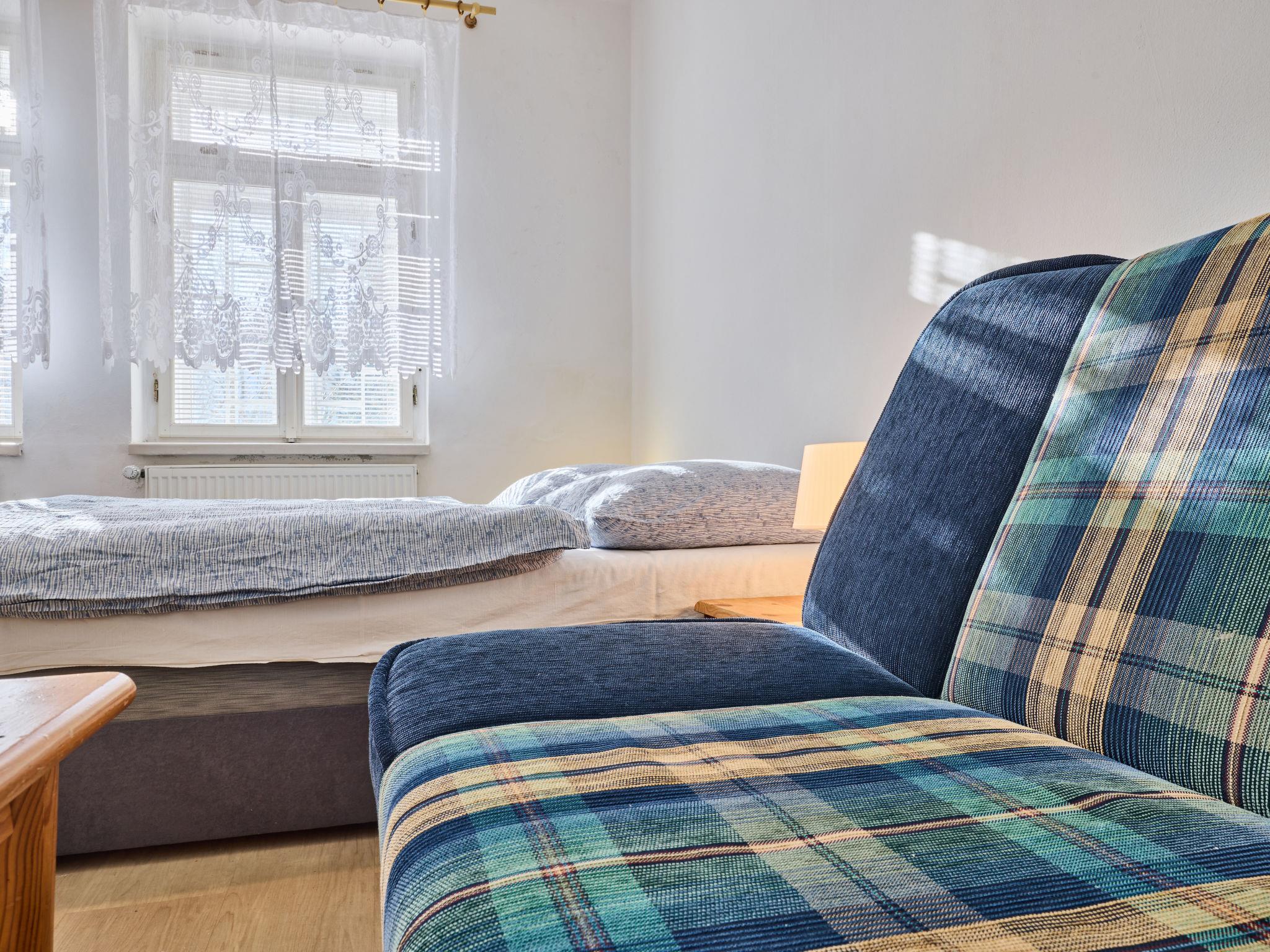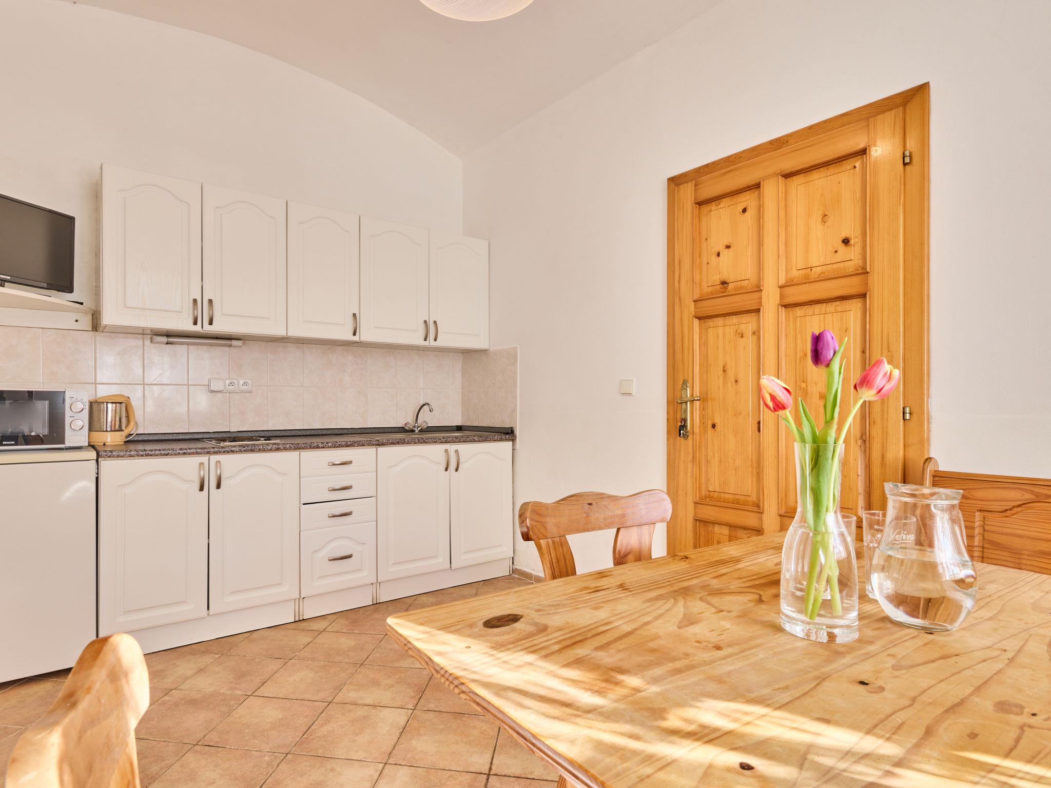 2-room apartment on the lower ground floor. Bright, practical and wooden furniture furnishings: living/sleeping room with 3 beds (90 cm, length 180 cm), 1 sofabed (120 cm, length 180 cm), shower/WC. Kitchen (2 hot plates, kettle, microwave, freezer) with dining table and TV. Exit to the garden. View of the garden. Facilities: Internet (WiFi, free). Suitable for families.