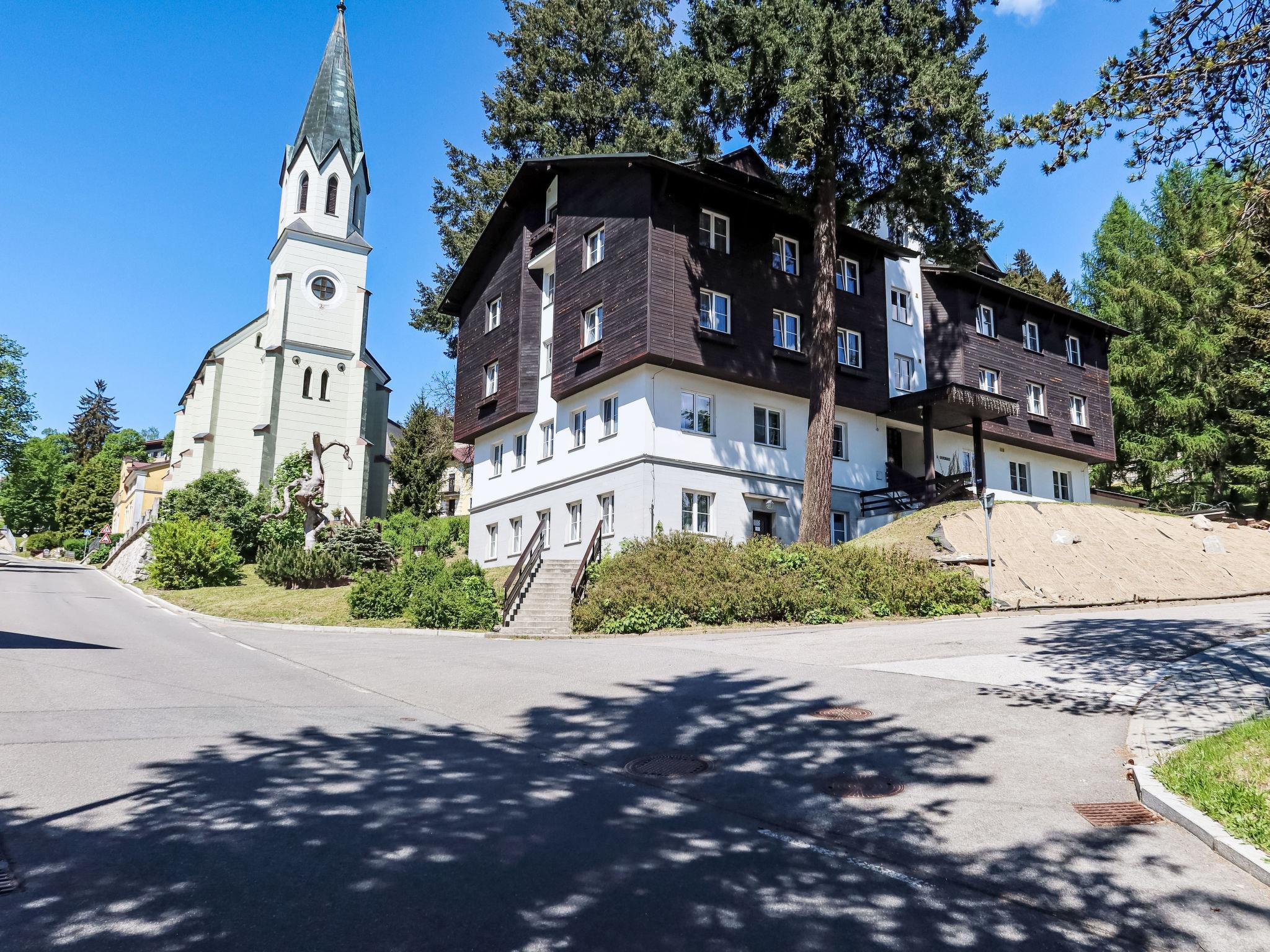 Cosy, rustic residence "Villa Belvedere", detached. 10 apartments in the residence. In the resort, 200 m from the centre, in a sunny position, 500 m from the skiing area. In the house: central heating system. Linen change (suppl. charge extra). Towel change (suppl. charge extra). Room cleaning on request (extra). Parking at the house, public parking extra. Grocery 300 m, restaurant 50 m, bus stop "Janské Lázne - Lesní dum" 300 m, railway station "Svoboda nad Úpou" 3.3 km, park "Farmapark Muchomurka" 1 km, outdoor swimming pool 7 km, indoor swimming pool 400 m. Tennis 1 km, minigolf 400 m, cycle lane 100 m, cable car 600 m, ski lift 300 m, chair lift 500 m, gondola lift 600 m, slopes 300 m, ski rental 300 m, ski school 400 m, children's ski school 300 m, sled run 700 m, cross country ski track. Nearby attractions: Lanovka na Cernou horu 600 m, Janské Lázne Spa, Stezka korunami stromu 1 km, bobová dráha 5 km, Pec pod Snežkou, Relaxpark, bobová dráha 11 km, Vrchlabí 10 km, Trutnov 12 km, Malá Úpa 15 km, Zoo Dvur Králové, Adršpach 35, Karpacz 40 km. Well-known ski regions can easily be reached: SkiResort CERNÁ HORA - PEC, Mladé Buky 5 km, Horní Malá Úpa 16 km, Špindleruv Mlýn 30 km. Hiking paths: krkonošské naucné stezky. Please note: no lift.