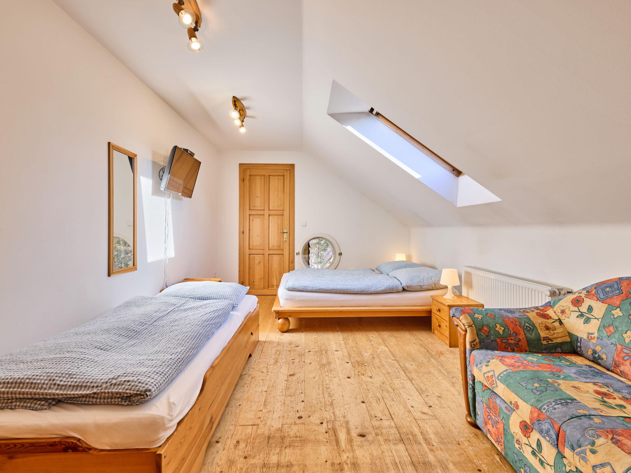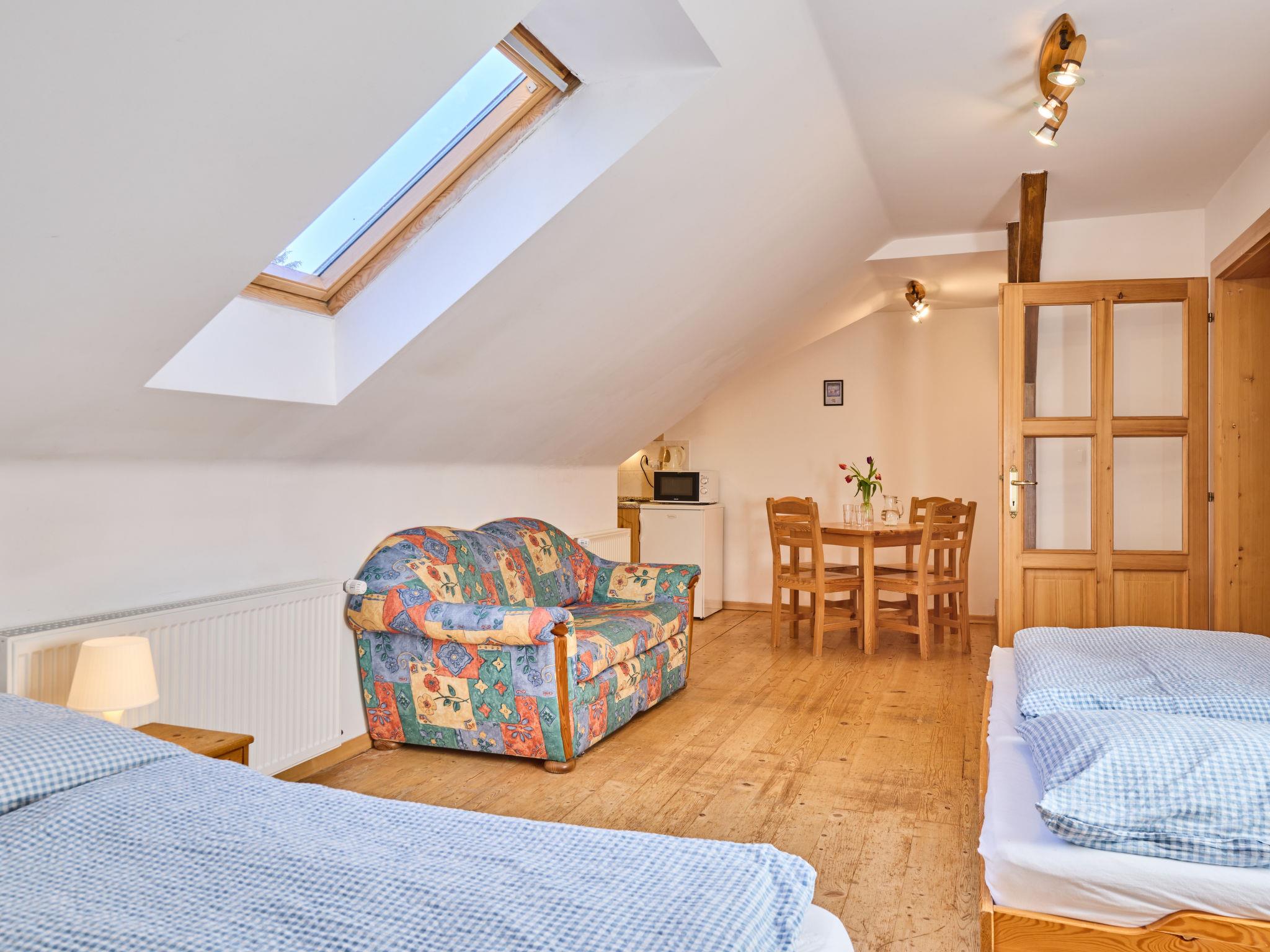 1-room studio on 2nd floor. Bright, beautiful and cosy furnishings: 1 room with 1 bed, 1 double bed and TV. Kitchenette (2 hot plates, microwave, electric coffee machine). Shower/WC. Facilities: Internet (WiFi, free). Please note: suitable for families. TV only CS.