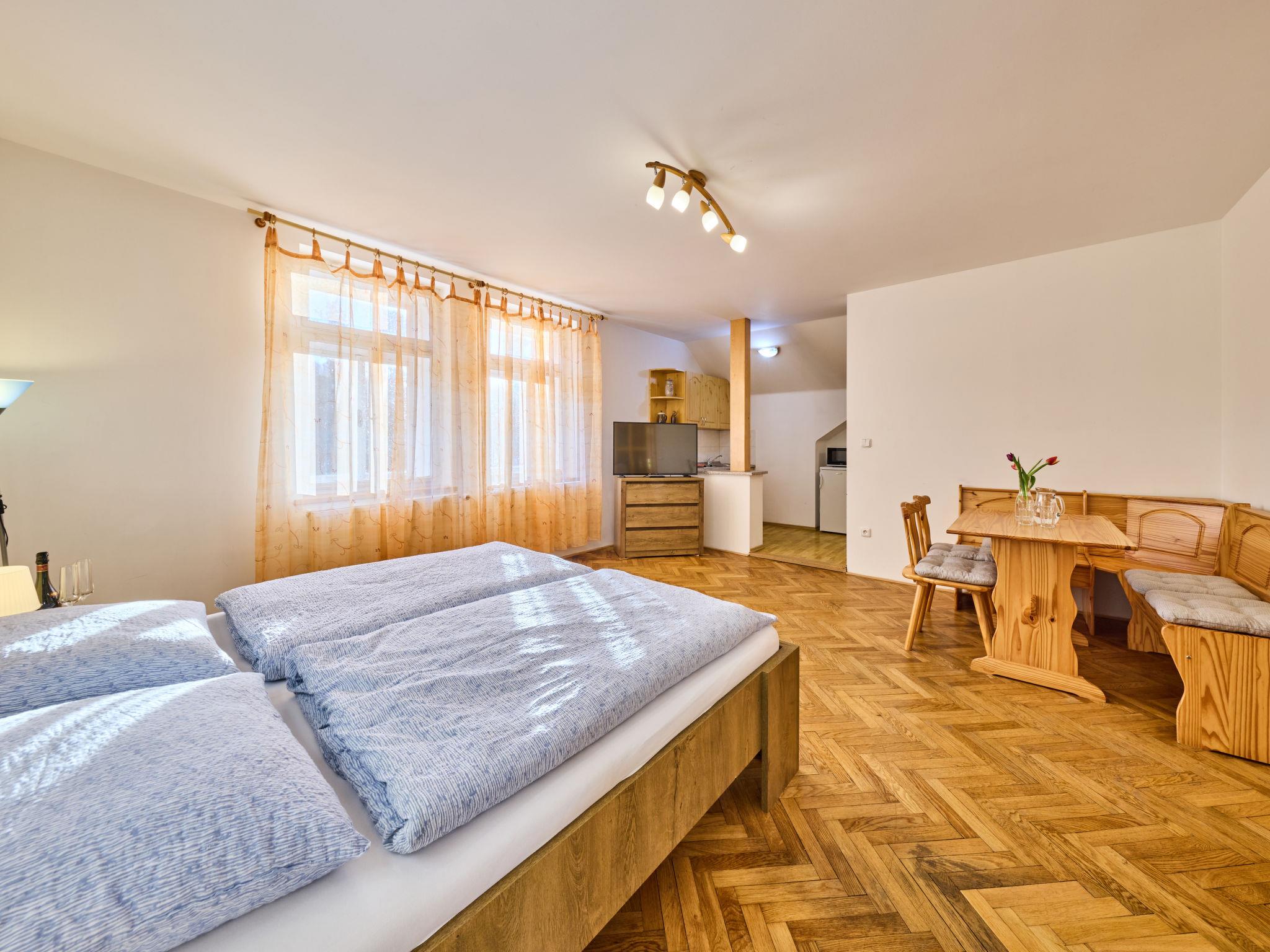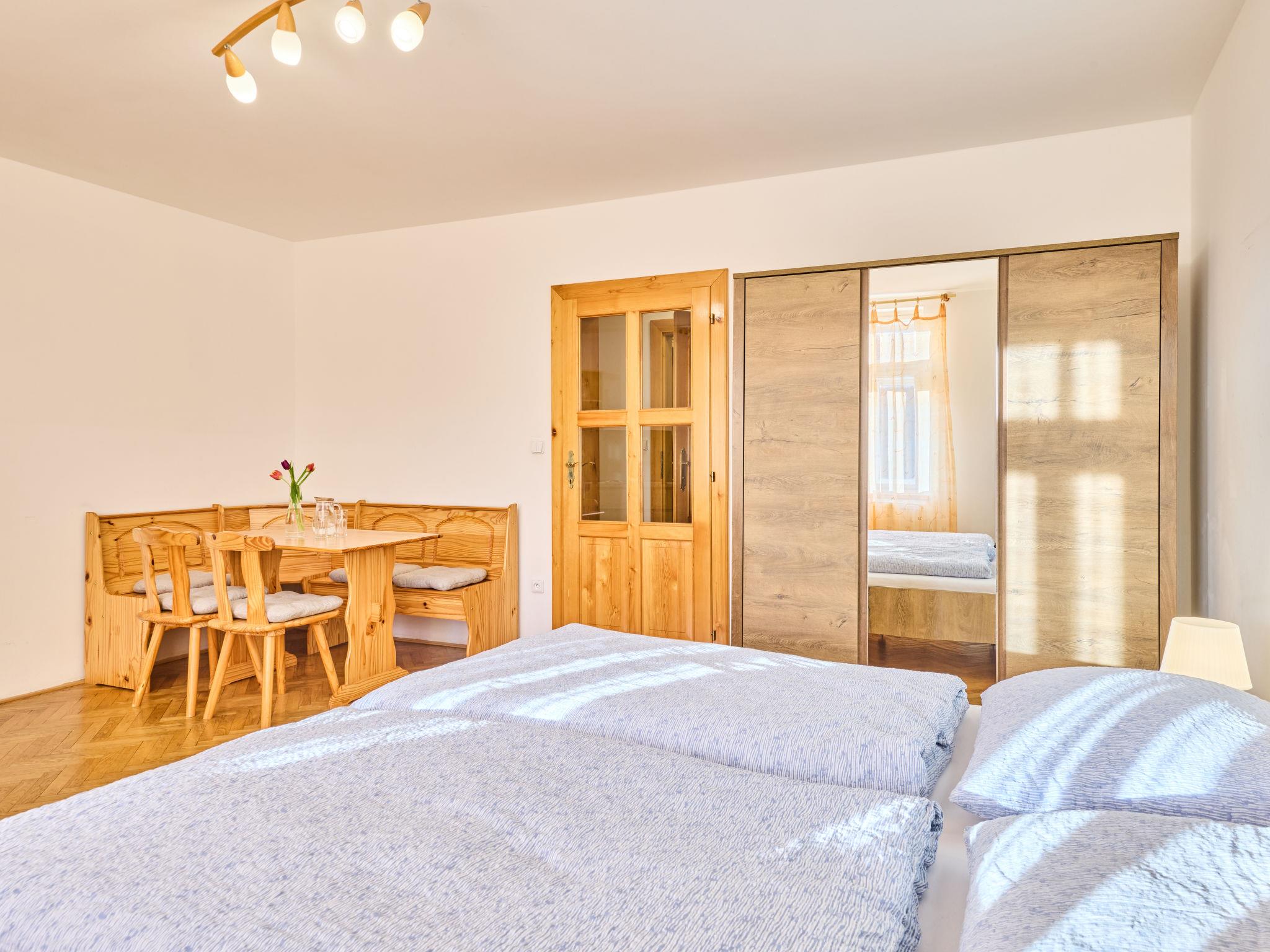 2-room apartment on 2nd floor. Bright, beautiful furnishings: living/dining room with 1 double bed, dining nook and TV. 1 room with 3 beds. Kitchenette (2 hot plates, microwave, electric coffee machine). Shower/WC. Facilities: Internet (WiFi, free). Please note: suitable for families. TV only CS.