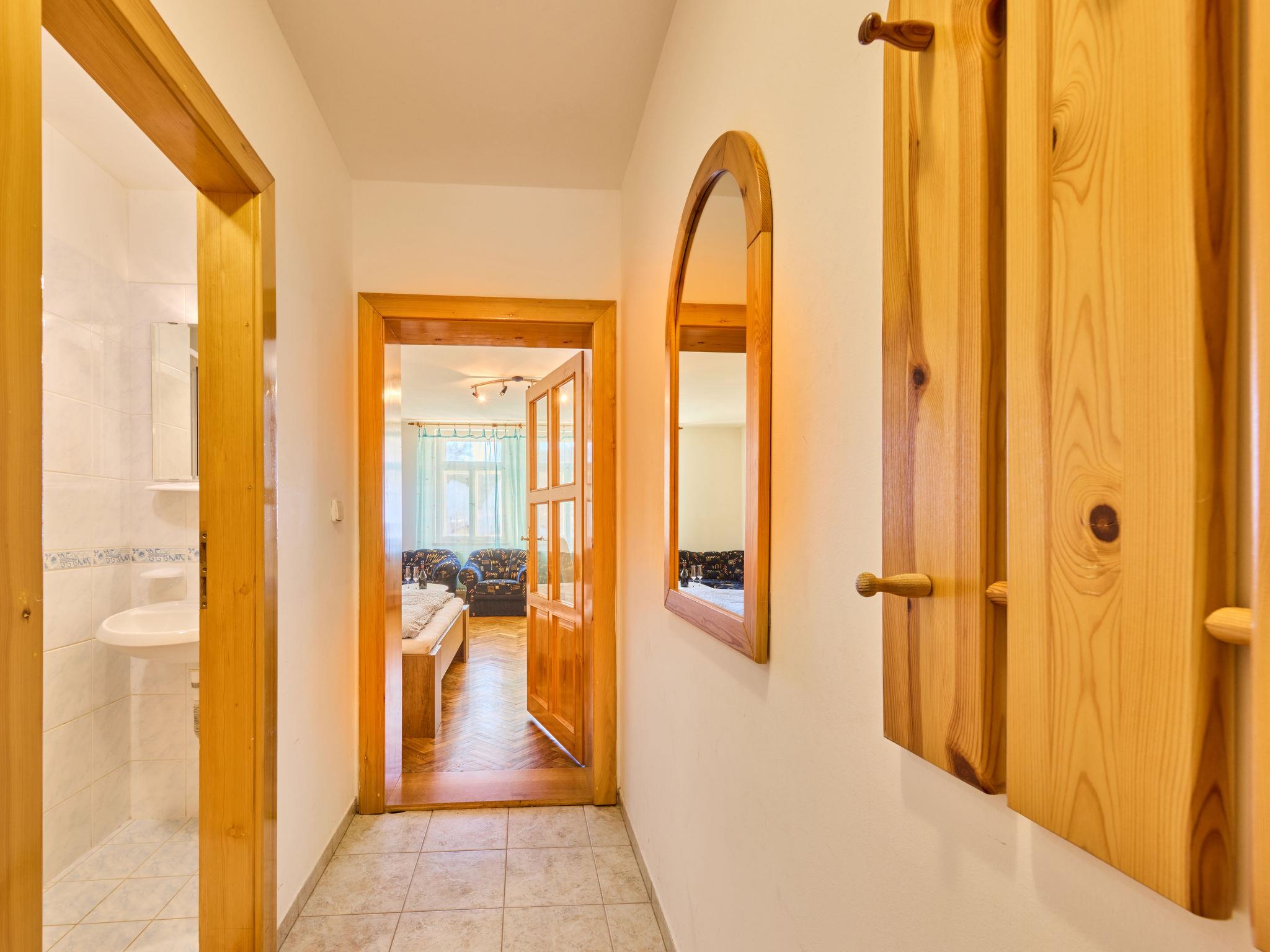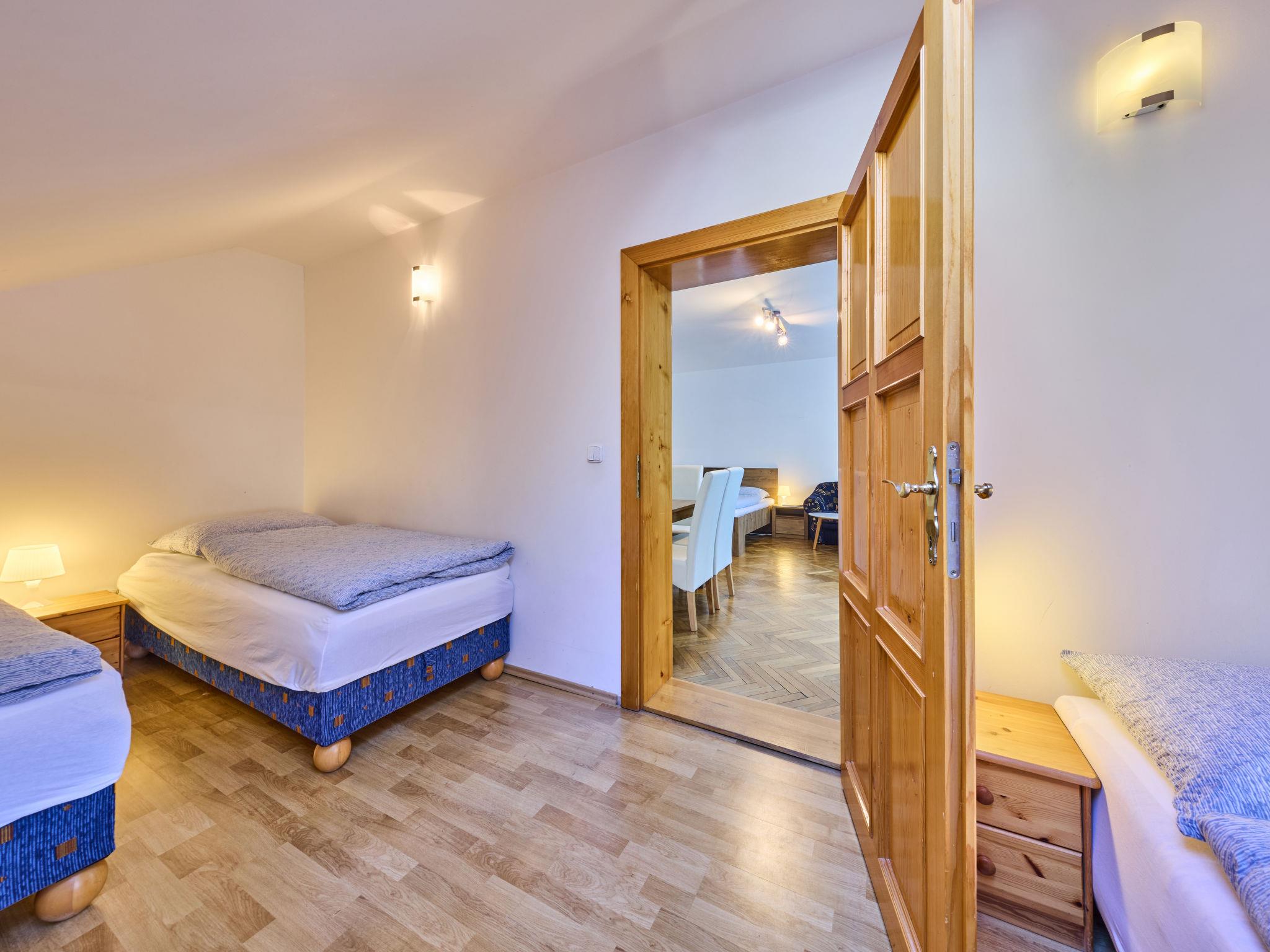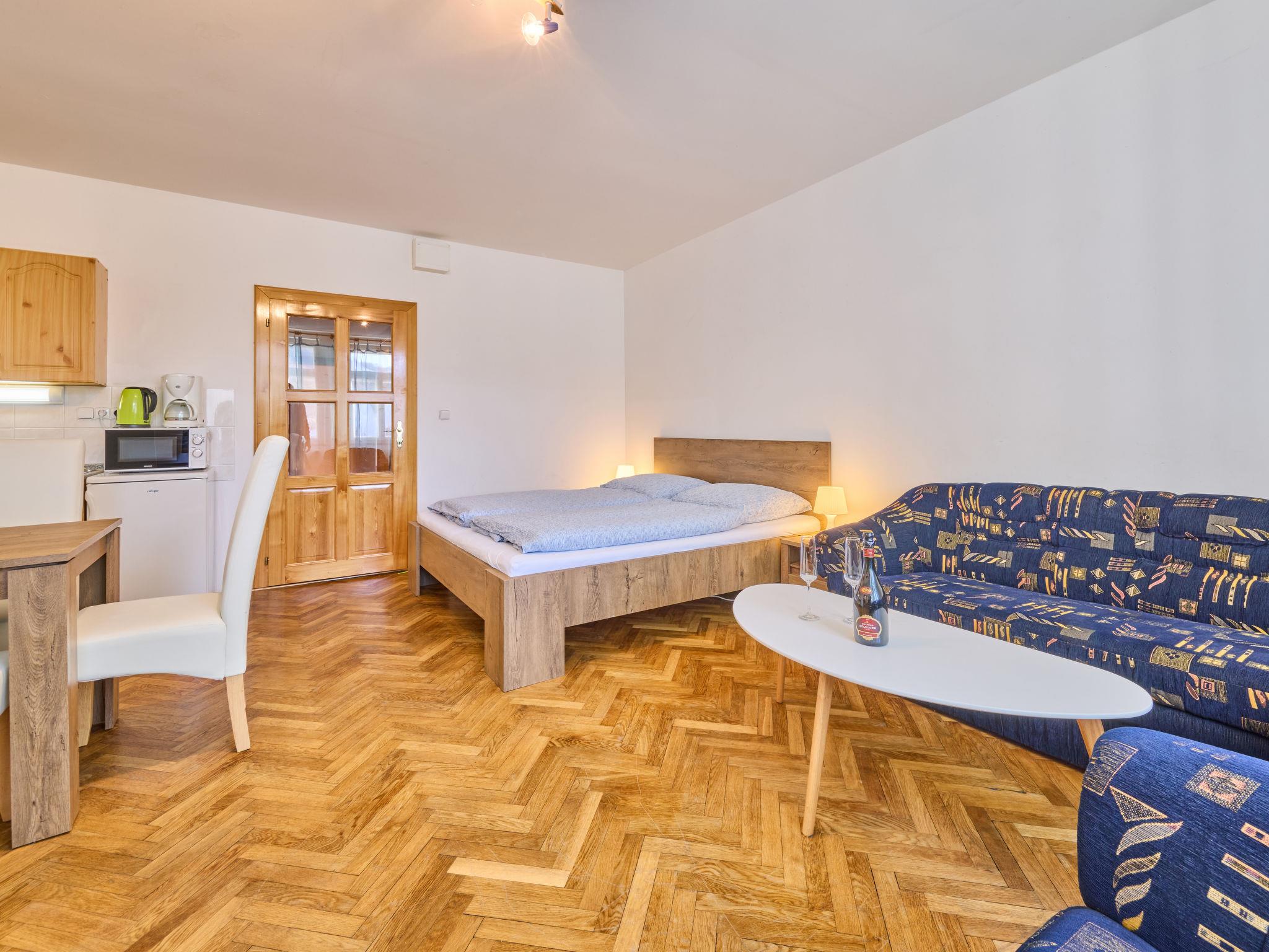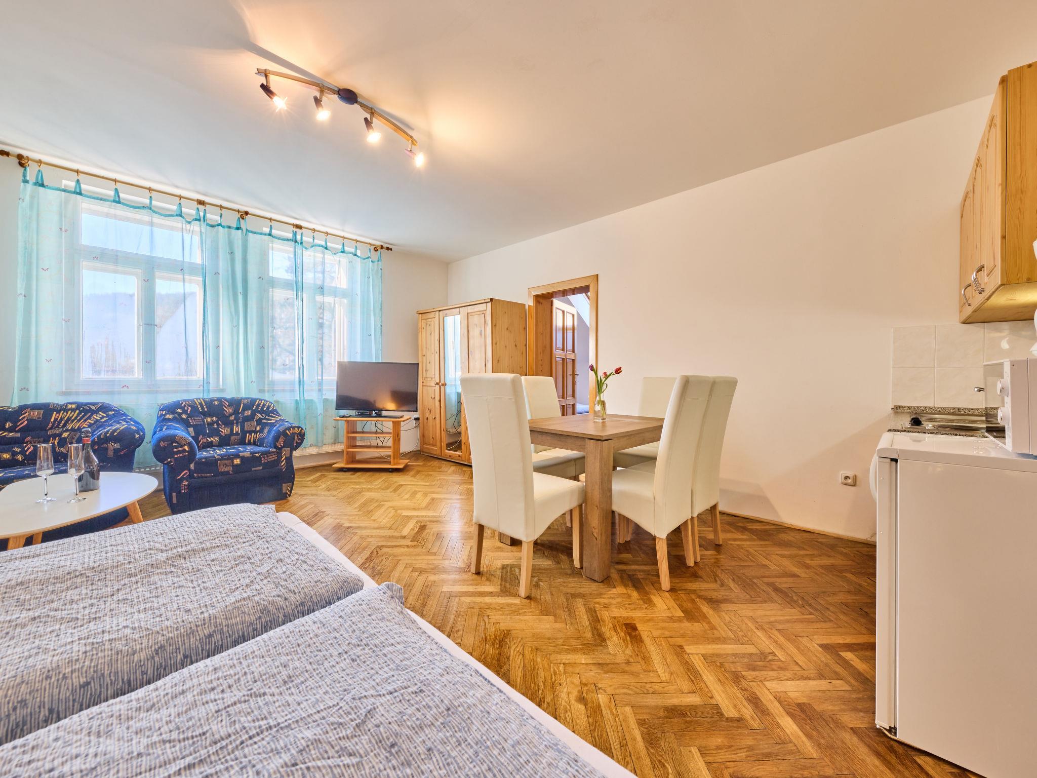 2-room apartment on 2nd floor. Bright, beautiful furnishings: large living/dining room with 1 double bed, dining nook and TV. 1 room with 3 beds. Kitchenette (2 hot plates, microwave, electric coffee machine). Shower/WC. Facilities: Internet (WiFi, free). Please note: suitable for families. TV only CS.