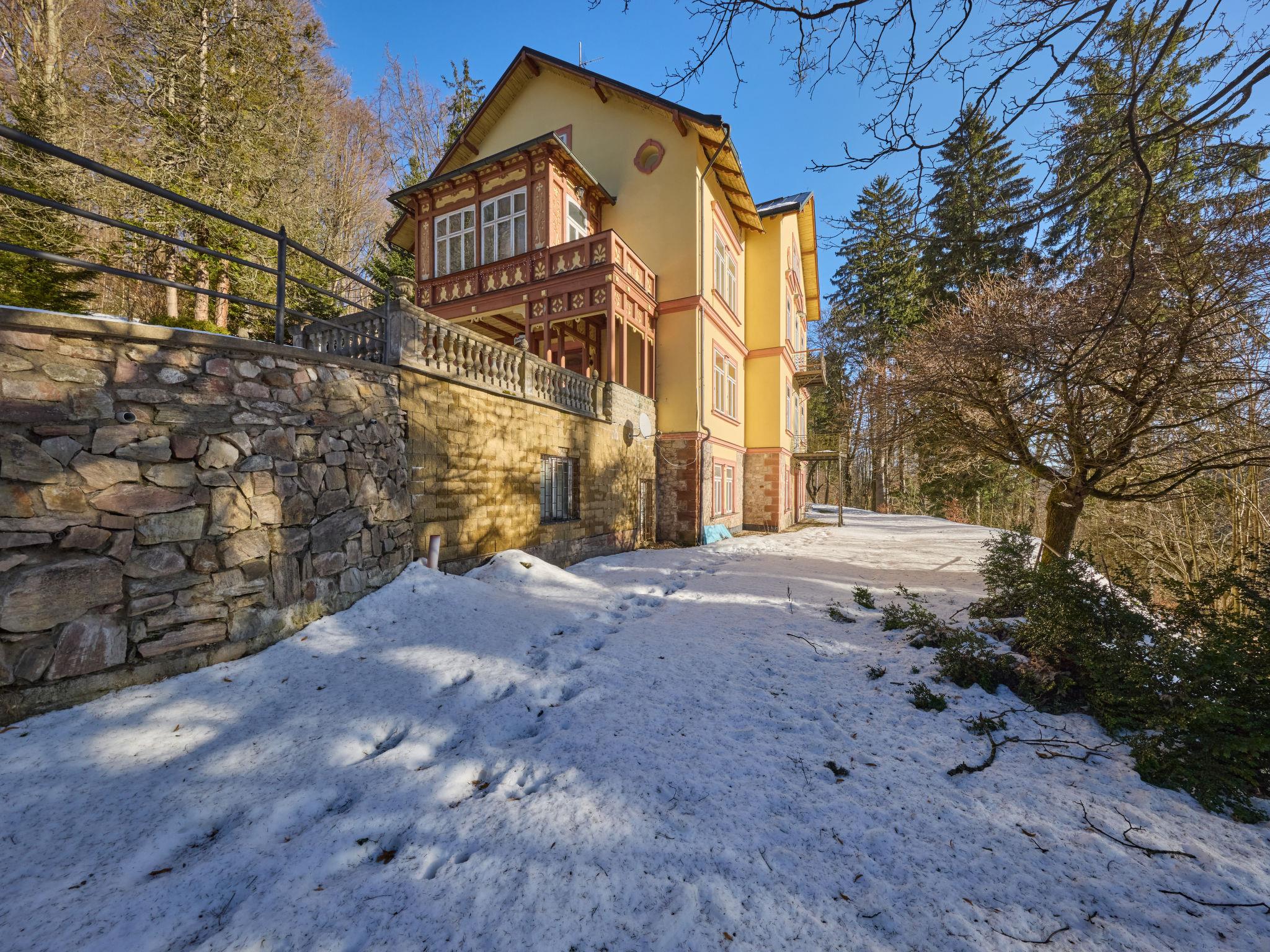 Cosy, rustic residence "Villa Belvedere", detached. 10 apartments in the residence. In the resort, 200 m from the centre, in a sunny position, 500 m from the skiing area. In the house: central heating system. Linen change (suppl. charge extra). Towel change (suppl. charge extra). Room cleaning on request (extra). Parking at the house, public parking extra. Grocery 300 m, restaurant 50 m, bus stop "Janské Lázne - Lesní dum" 300 m, railway station "Svoboda nad Úpou" 3.3 km, park "Farmapark Muchomurka" 1 km, outdoor swimming pool 7 km, indoor swimming pool 400 m. Tennis 1 km, minigolf 400 m, cycle lane 100 m, cable car 600 m, ski lift 300 m, chair lift 500 m, gondola lift 600 m, slopes 300 m, ski rental 300 m, ski school 400 m, children's ski school 300 m, sled run 700 m, cross country ski track. Nearby attractions: Lanovka na Cernou horu 600 m, Janské Lázne Spa, Stezka korunami stromu 1 km, bobová dráha 5 km, Pec pod Snežkou, Relaxpark, bobová dráha 11 km, Vrchlabí 10 km, Trutnov 12 km, Malá Úpa 15 km, Zoo Dvur Králové, Adršpach 35, Karpacz 40 km. Well-known ski regions can easily be reached: SkiResort CERNÁ HORA - PEC, Mladé Buky 5 km, Horní Malá Úpa 16 km, Špindleruv Mlýn 30 km. Hiking paths: krkonošské naucné stezky. Please note: no lift.