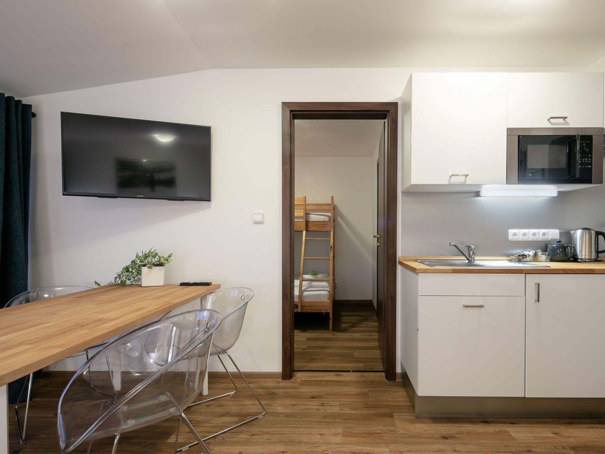 "U Kabinky 5+0", 2-room apartment on 3rd floor. Living room with 1 double bed and TV. 1 room with 1 sofabed and 1 double bed. Kitchenette (2 hot plates, kettle, microwave) with dining table. Shower/WC. Beautiful view of the countryside. Facilities: Internet (WiFi, free). Please note: suitable for families. Non-smokers only.