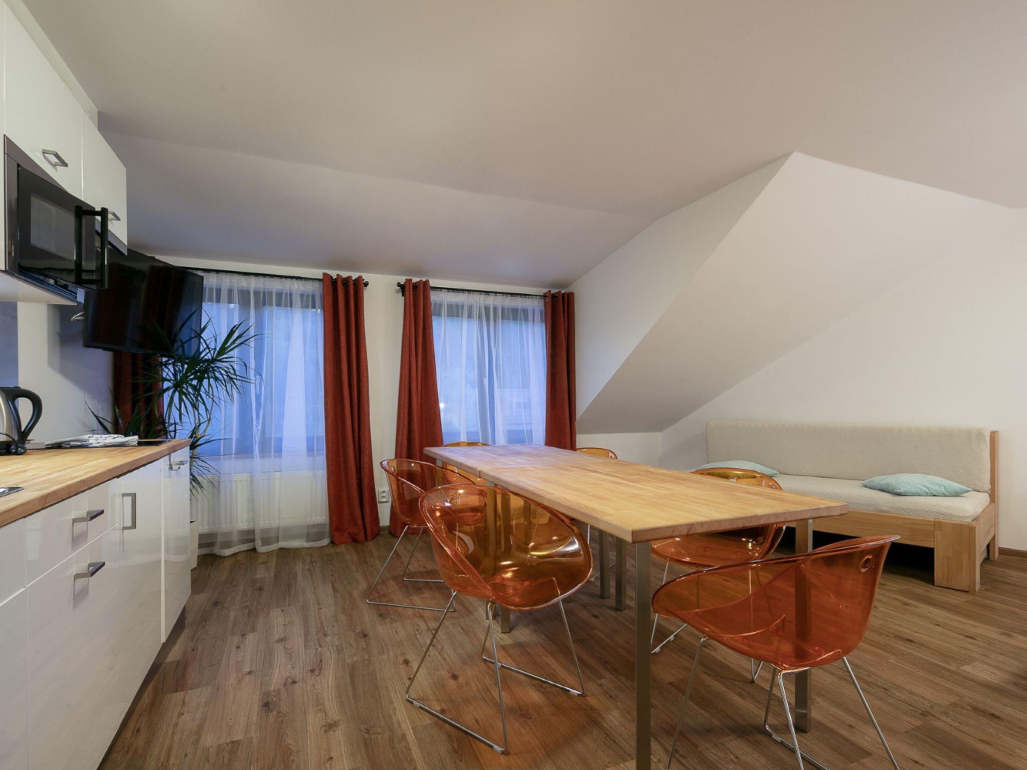 "U Kabinky 6+2", 2-room apartment 63 m2 on 3rd floor. Living room with 1 double sofabed, 1 double bed and TV. 1 room with 2 beds and 1 double bed. Kitchenette (2 hot plates, kettle, microwave) with dining table. Shower/WC. Beautiful view of the countryside. Facilities: Internet (WiFi, free). Please note: suitable for families. Non-smokers only.