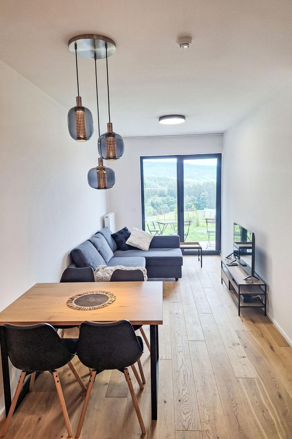Comfortable apartment block, 5 storeys, detached, built in 2023. In the resort, 500 m from the centre, in a sunny position, 150 m from the skiing area. In the house: storage room for skis, central heating system. Single garage. Grocery 300 m, restaurant 50 m, bus stop "Janské Lázne - Lesní dum" 200 m, railway station "Svoboda nad Úpou" 3.8 km, park "Farmapark Muchomurka" 1 km, outdoor swimming pool 7 km, indoor swimming pool 300 m. Golf course (18 hole) 7.5 km, tennis 1 km, minigolf 4.5 km, walking paths from the house, cycle lane 100 m, chair lift, gondola lift, slopes, ski rental 150 m, ski bus stop 200 m, ski school, children's ski school, sled run 150 m, cross country ski track 300 m. Nearby attractions: Lanovka na Cernou horu 100 m, Janské Lázne Spa, Stezka korunami stromu 700 m, bobová dráha 5 km, Pec pod Snežkou, Relaxpark, bobová dráha 15 km, Vrchlabí 10 km, Trutnov 12 km, Malá Úpa 20 km, Zoo Dvur Králové, Adršpach 35, Karpacz 40 km. Well-known ski regions can easily be reached: SkiResort CERNÁ HORA - PEC, Mladé Buky 5 km, Horní Malá Úpa 16 km, Špindleruv Mlýn 30 km. Hiking paths: krkonošské naucné stezky. Please note: suitable for families.