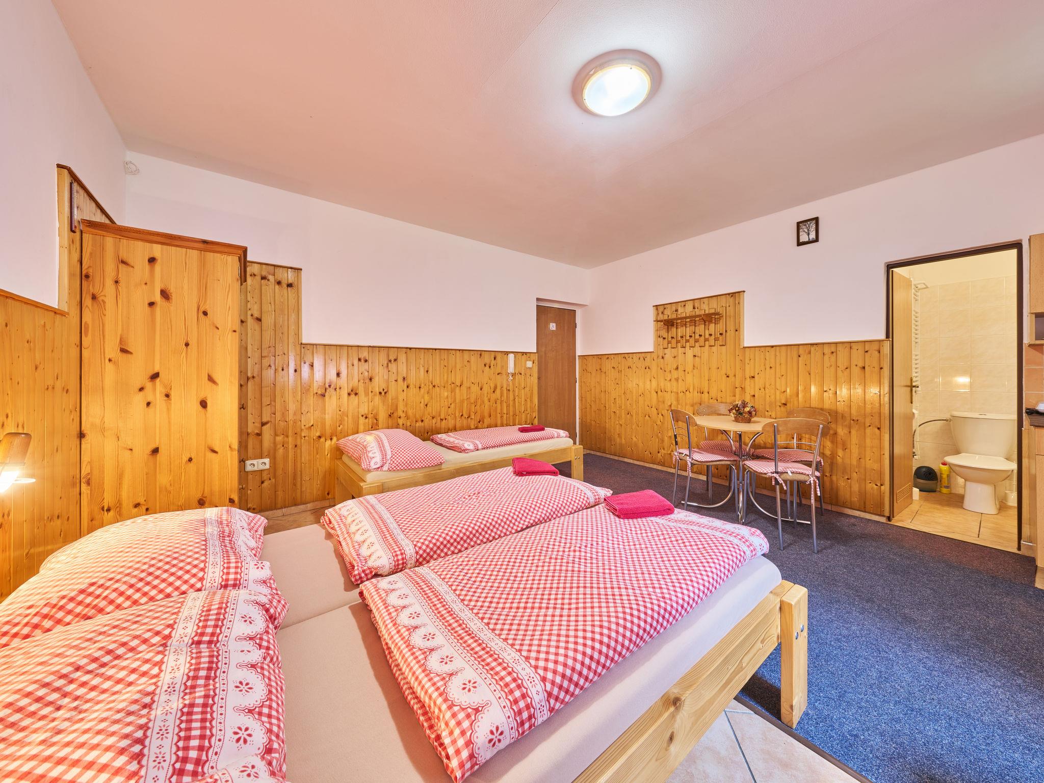 "U Švýcarského dvora III", 1-room apartment 27 m2, on the ground floor. Practical and cosy furnishings: 1 room with 2 beds, 1 double bed, dining table and satellite TV. Kitchenette (2 hot plates, kettle, microwave). Shower/WC. Heating. View of the garden. Facilities: Internet (WiFi, free). Please note: non-smokers only. Smoke alarm, fire extinguisher.