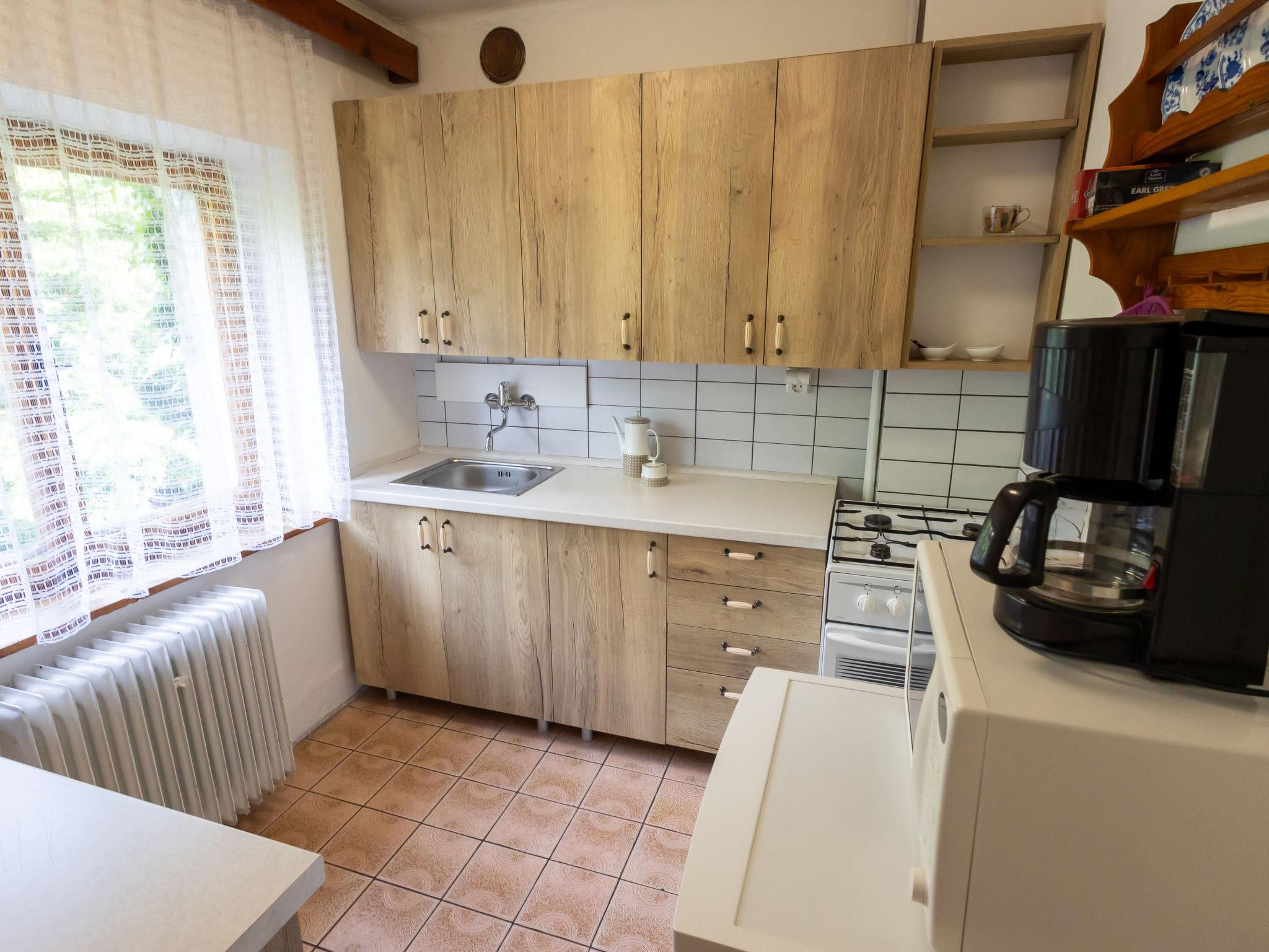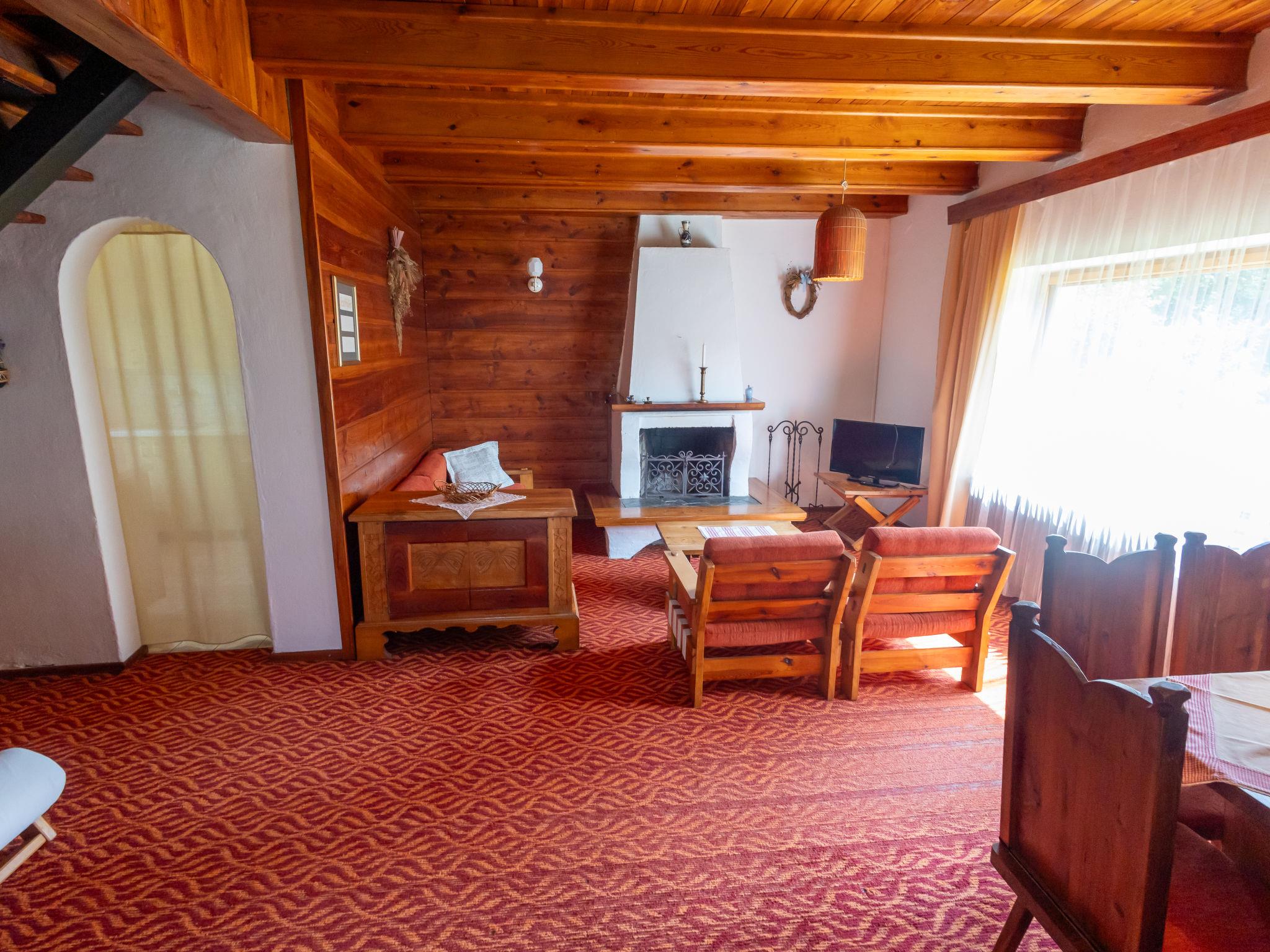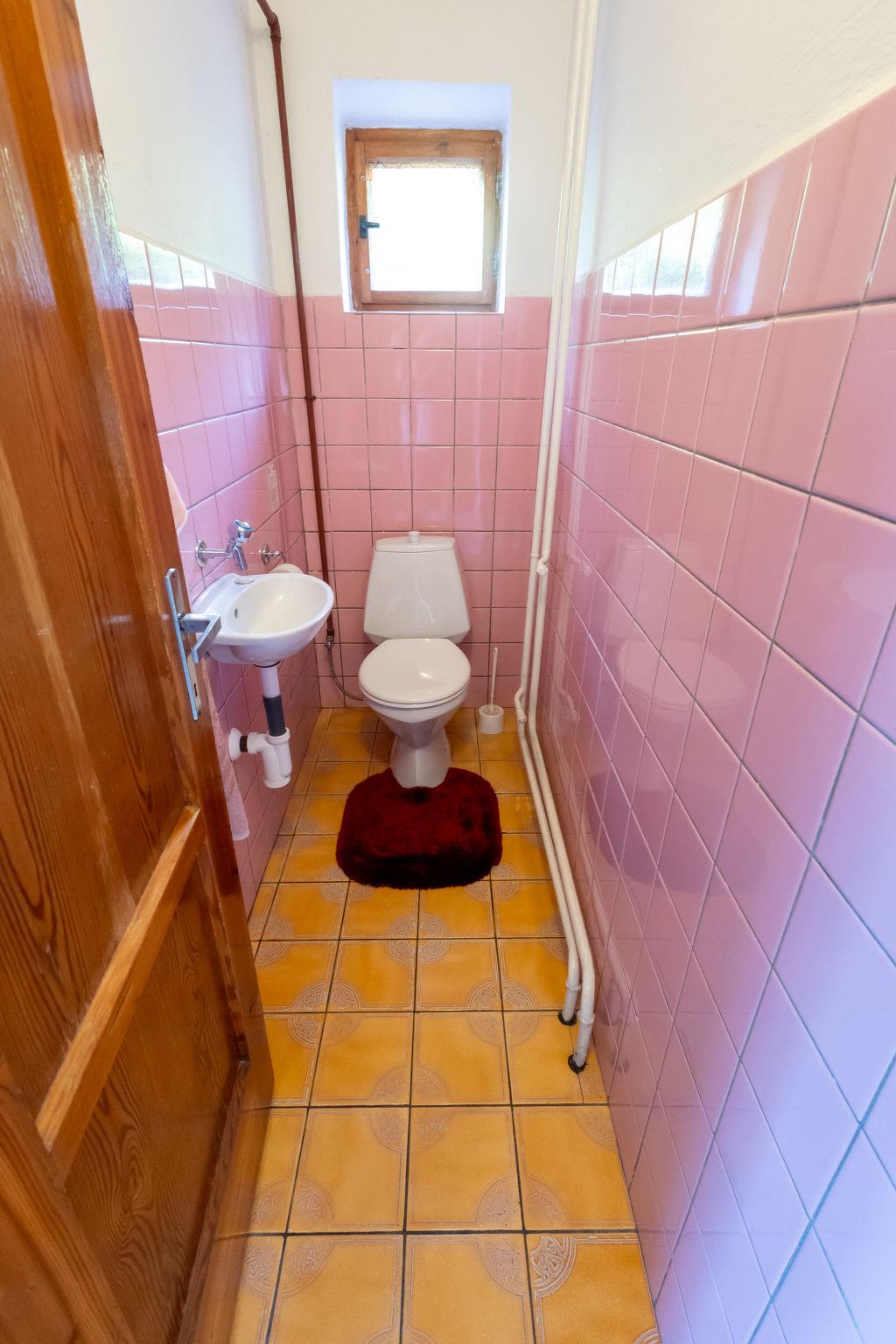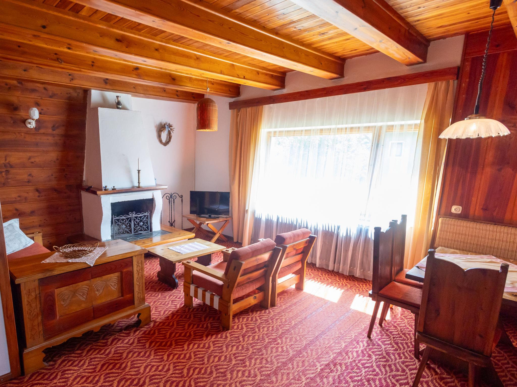 "Jestrebice 8", 4-room cottage 90 m2 on 2 levels. Cosy furnishings: living room with open-hearth fireplace, dining nook, satellite TV and radio. Small, open kitchen (oven, 4 gas rings, kettle, microwave, electric coffee machine). Bath/WC, sep. WC. Electric heating, wood heating. Upper floor: 3 double bedrooms. Balcony, terrace. Beautiful view of the forest. Facilities: children's high chair, baby cot. Please note: suitable for families. Maximum 2 pets/ dogs allowed. Smoke alarm, fire extinguisher.