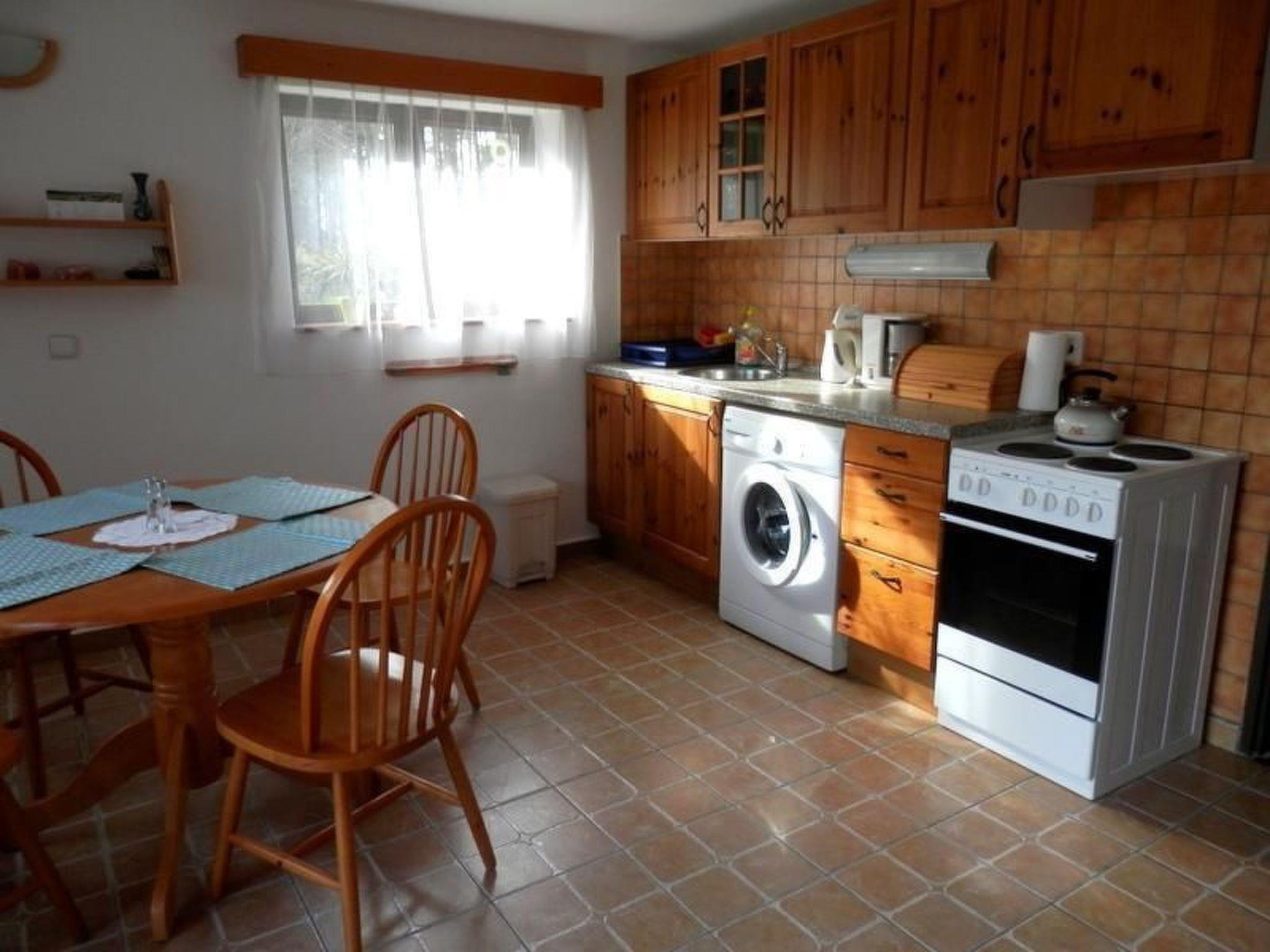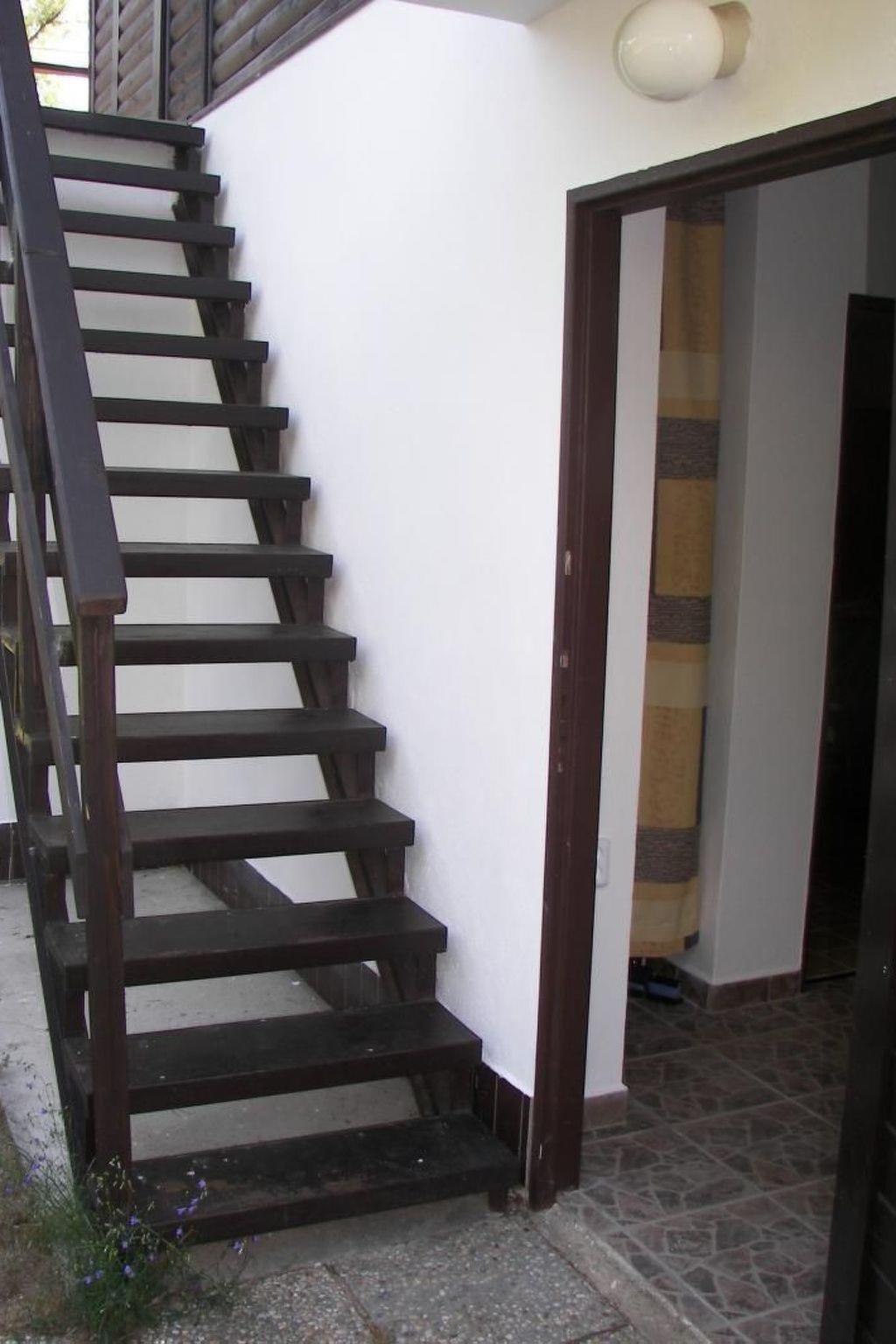 The house is suitable for six people and has two bedrooms on the first floor, accessed up outdoor stairs. One bedroom has a double bed and a fold-out double sofa bed, the second has a bunk bed. The lower floor has a living and dining room with a TV and a double sofa bed, a fully-equipped kitchen with a stove, oven, microwave, fridge, washing machine, coffee machine and dining corner. The shower with a washbasin and WC is in an adjoining room.