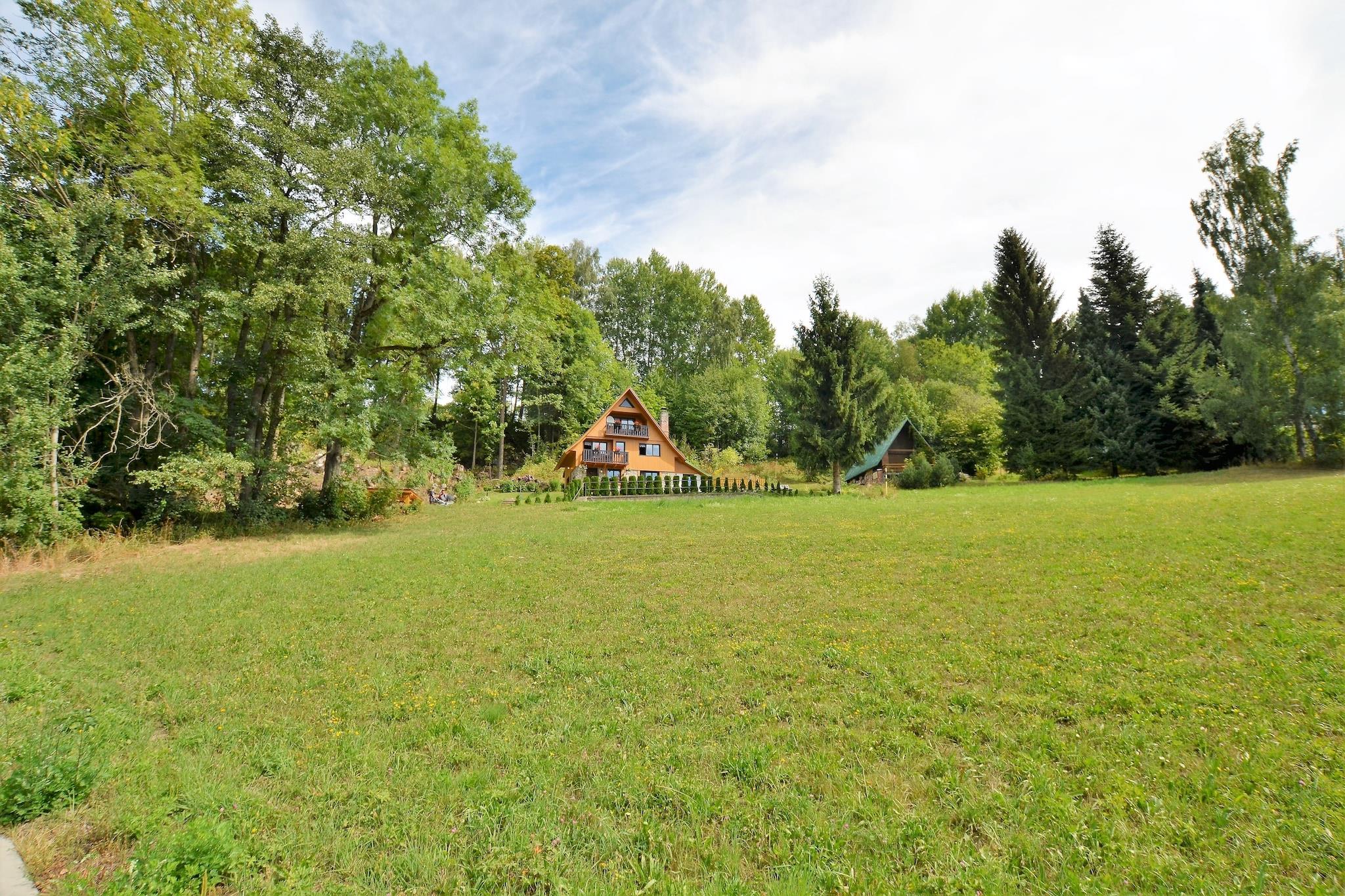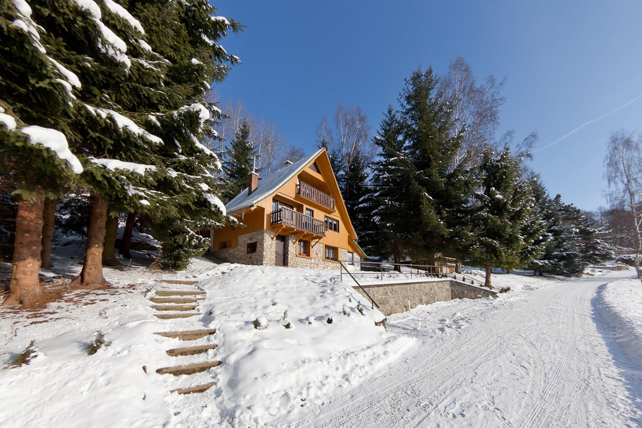 Chalet komfort og varme Beliggende i den fredelige landsby Mrklov nær Jilemnice, blander denne indbydende hytte hyggeligt interiør med udendørs plads til at slappe af i. Med tre komfortable soveværelser, en privat terrasse og en have komplet med siddepladser og grill, er den designet til familier eller grupper på op til syv. Stuens pejs inviterer til varme sammenkomster efter en dag på ski eller vandretur, mens det fuldt udstyrede køkken gør det nemt at tilberede fælles måltider. Gratis WiFi og parkering på stedet bidrager til dit opholds bekvemmelighed. Eventyr på dit dørtrin Kun 200 meter væk tilbyder Macher-skiliften nem adgang til pisterne, mens skoven kun 100 meter fra hytten er ideel til forfriskende gåture med dine kæledyr. Om sommeren kan du udforske nærliggende vandre- og cykelstier, der snor sig gennem Giant Mountains, eller køle af med en svømmetur i den offentlige pool i Jilemnice. Kæledyrsejere vil også nyde at slentre gennem enge, skovstier og naturskønne landskabsruter, hvilket gør det nemt at inkludere lodne ledsagere i dine eventyr. Spisning og lokale opdagelser Inden for 700 meter finder du restauranter, der serverer solide tjekkiske specialiteter og internationale retter. En kort tur til Jilemnice (5-6 km) byder på flere spisemuligheder, charmerende caféer og lokale butikker. Her kan du også besøge kulturelle vartegn eller slappe af i byens indendørs swimmingpool.