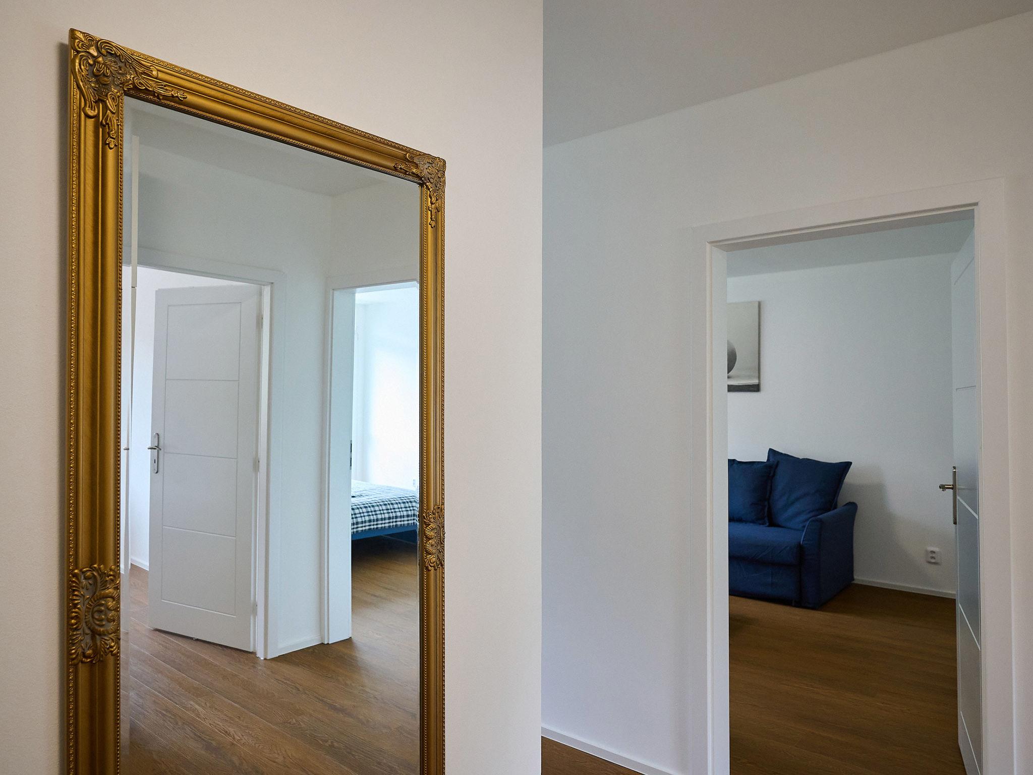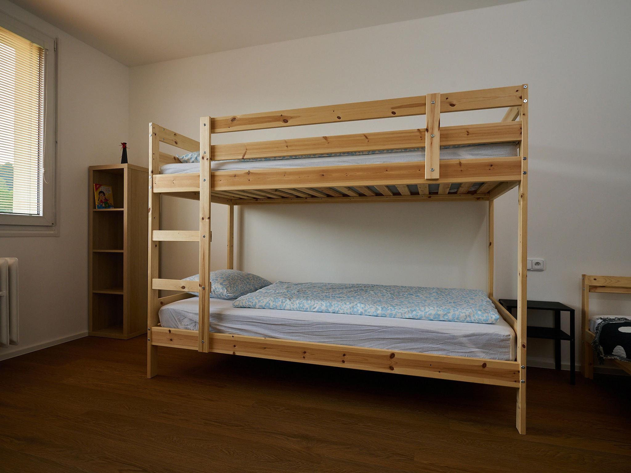"Forest line", 4-room apartment 90 m2 on 3rd floor. Renovated in 2025, practical and cosy furnishings: living room with 1 sofabed and TV. 1 room with 1 double bed. Exit to the balcony. 1 room with 1 bed and 1 x 1 bunk beds. Kitchen (oven, dishwasher, 4 ceramic glass hob hotplates, toaster, kettle, microwave) with dining table. Shower, sep. WC. Heating. Small balcony 6 m2. Terrace furniture, box-room. View of the garden and the town. Facilities: Internet (WiFi, free). At the house. Please note: suitable for families. Non-smoking house.
