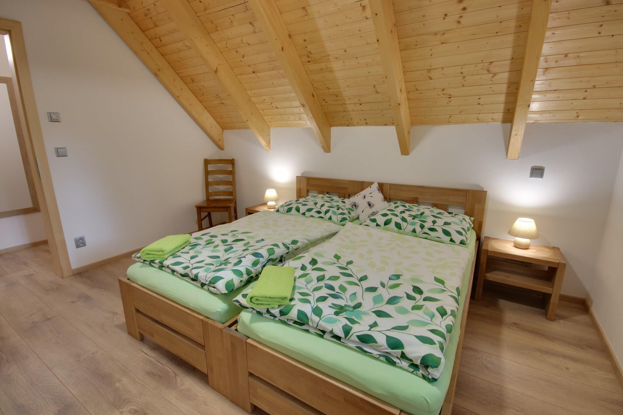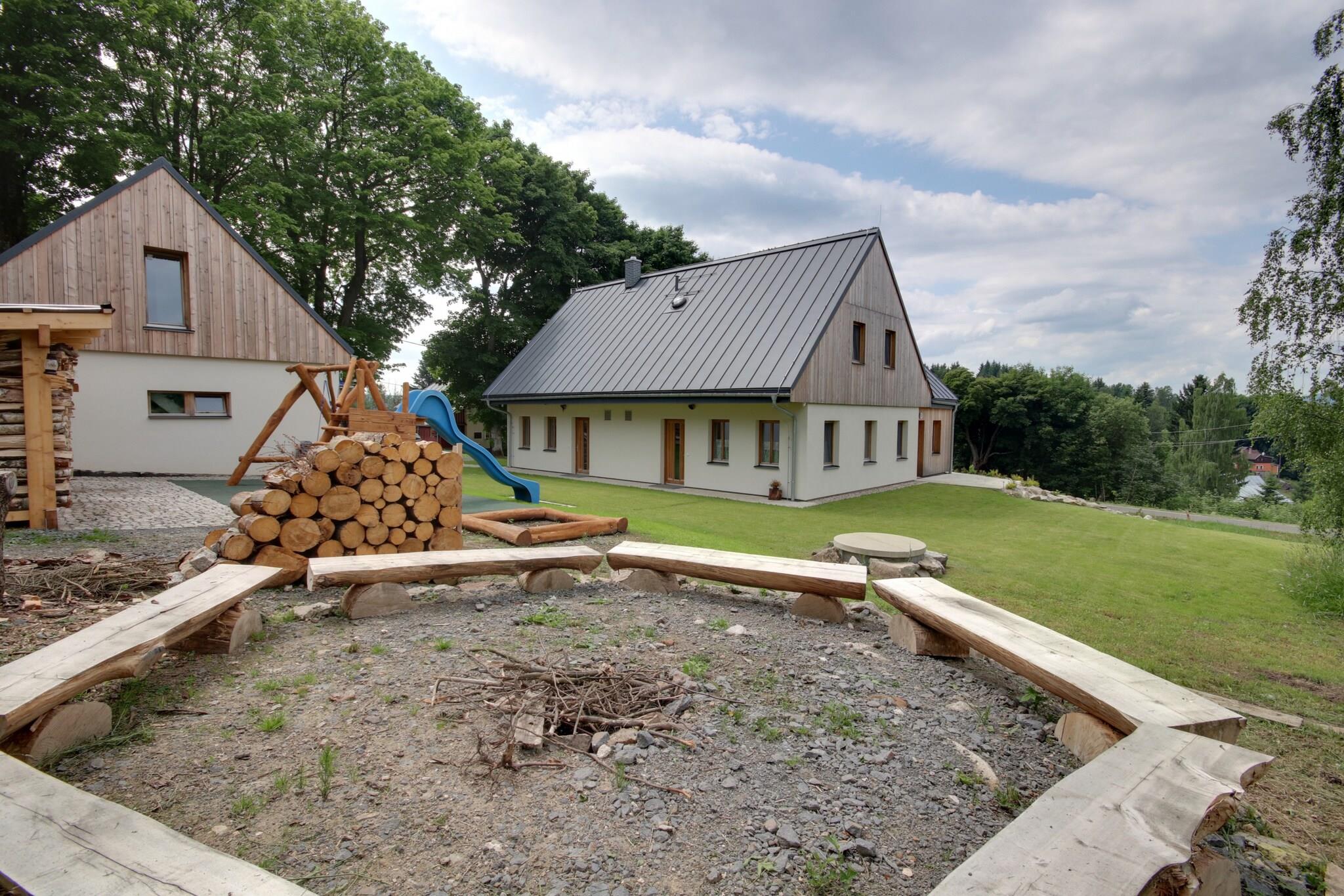 Denne rummelige villa, beliggende i Korenov, tilbyder et ideelt tilflugtssted for op til 12 gæster. Perfekt til familier eller grupper, det har to luksuriøst udstyrede lejligheder, der giver mulighed for privatliv, hvis det er nødvendigt. Ejendommen er kæledyrsvenlig, hvilket sikrer, at alle i din gruppe, inklusive kæledyr, er komfortable. Med 5 soveværelser og 3 moderne badeværelser er der masser af plads til alle gæster. Badeværelserne er slanke, med finish af høj kvalitet og kraftfulde brusere, mens det veludstyrede køkken har alt, hvad der skal til for at tilberede lækre måltider, lige fra køleskab og mikroovn til ovn og opvaskemaskine. Villaen ligger kun 2 km fra det populære U Capa skisportssted, hvilket gør det til et førsteklasses sted for vintersportsentusiaster. Om sommeren byder området på en række udendørs aktiviteter, herunder vandreture i Jezerske Hory-naturreservatet eller cykling langs lokale cykelstier. Det nærliggende skiområde Tanvaldsky Spicak ligger kun en kort køretur derfra, og byen byder også på kulturelle oplevelser og charmerende markeder. En swimmingpool i Tanvald, kun 5 km fra villaen, er et perfekt sted at slappe af efter en aktiv dag. Villaen er udstyret med alle de faciliteter, der er nødvendige for et behageligt ophold. Det har et fuldt udstyret køkken til at tilberede måltider, en hyggelig opholdsstue til underholdning og en rummelig have med legeredskaber til børn. Forældre kan slappe af på terrassen eller tænde grillen om aftenen for at nyde et dejligt måltid udendørs. Villaen tilbyder også et vaskerum med vaskemaskine og tørretumbler for din bekvemmelighed.