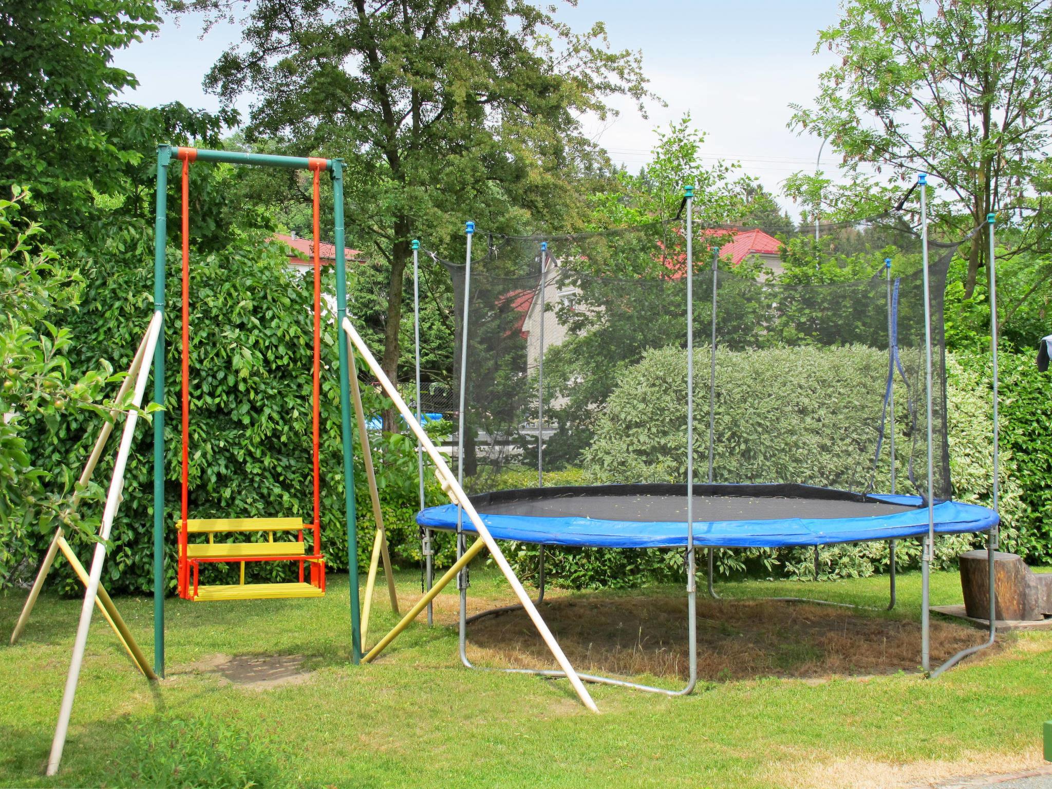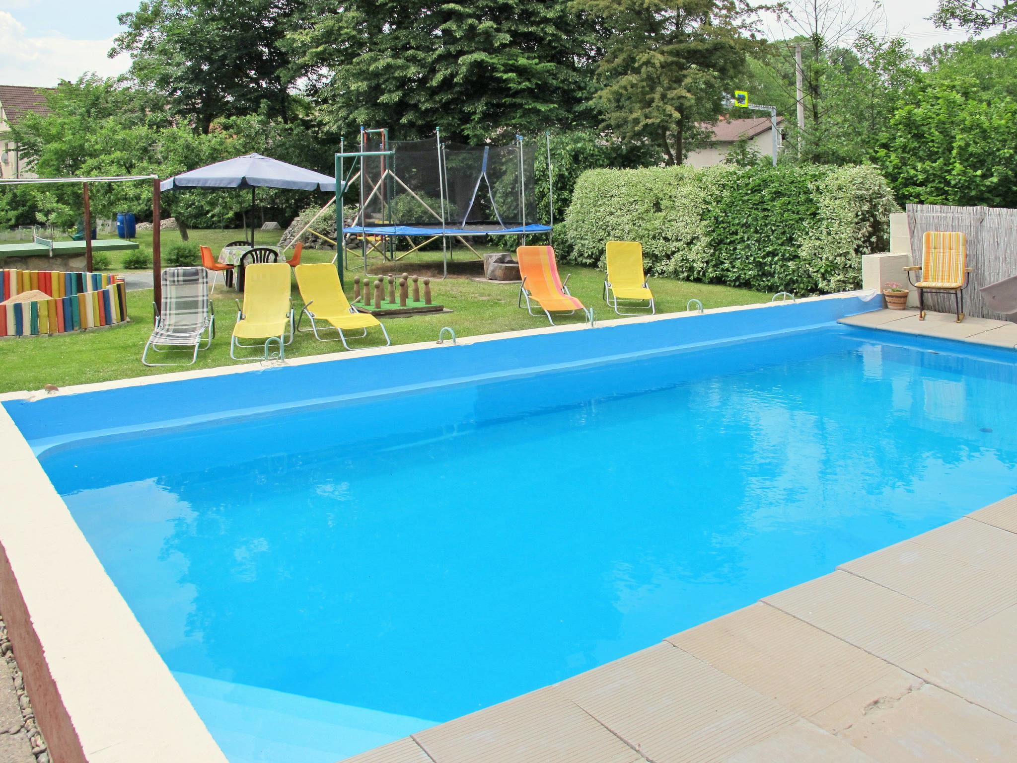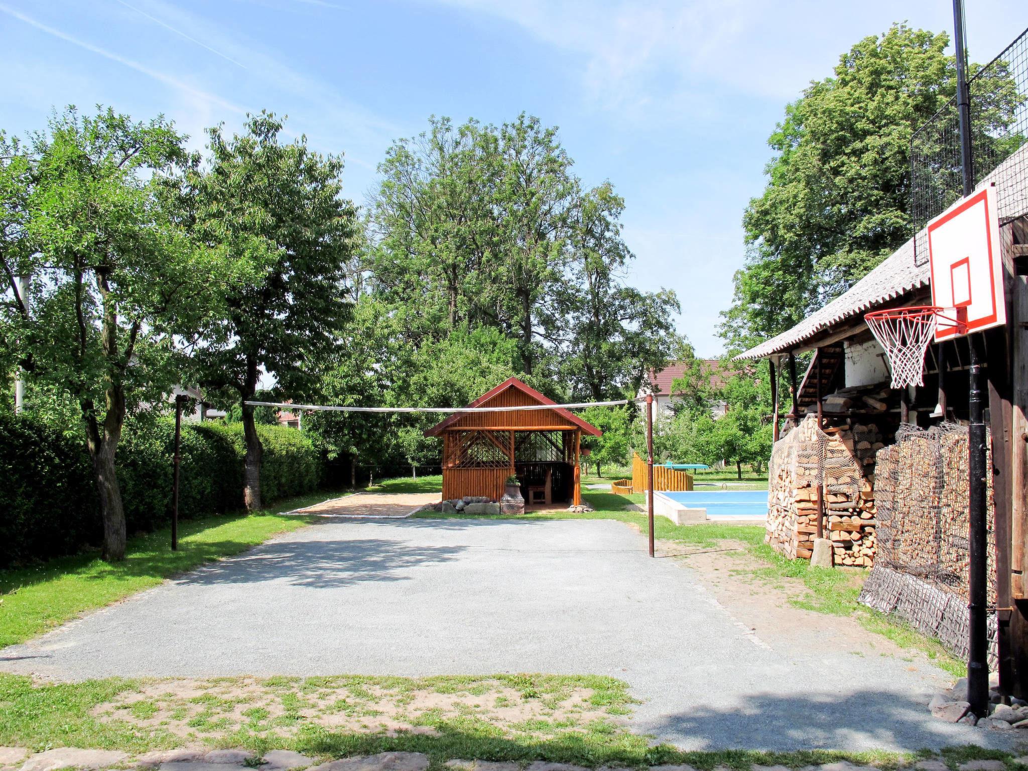 Cosy, rustic country house "Kern", 400 m a.s.l., detached. 300 m from the centre of Kvasiny, on the outskirts, 2 km from the centre of Solnice, 12 km from the centre of Dobruska, 12 km from the lake, 15 km from the skiing area. Private: property 1'200 m2 (fenced), garden lawn and trees, meadow, swimming pool (8 x 4 m, depth 120 - 180 cm, seasonal availability: 16.May. - 26.Sep.). Hot tub, table tennis, basketball, volleyball, badminton, volleyball court arbour, pergola, garden furniture, barbecue, fireplace, children's playground (slide, swing). In the complex: bar, billiard table, trampoline. Roofed, parking (for 2 cars). E-charging station. Shop 300 m, supermarket 9 km, bus stop "Kvasiny" 30 m, railway station "Solnice" 2 km, outdoor swimming pool 9 km, indoor swimming pool 12 km, bathing lake "Broumar Opocno" 12 km, lake Rozkoš 25 km. Tennis 2 km, riding stable 10 km, walking paths from the house 100 m, cycle lane 100 m, ski lift 15 km, slopes 15 km, ski rental 15 km, ski school 15 km, children's ski school 15 km, cross country ski track 10 km, ice rink 9 km, children's playground 500 m. Common room with bar, pool table, darts, wood burner, small dish washer: 1000 CZK/week. Electricity consumption of 30 KWh is included in the price of the stay.