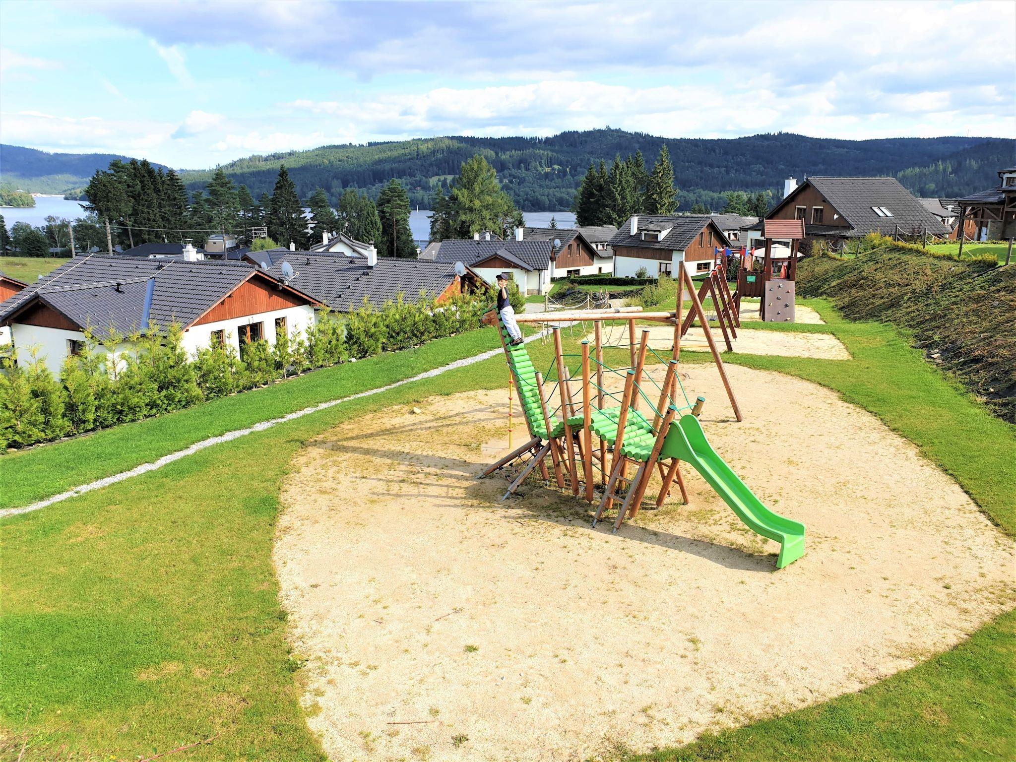 Child friendly, modern holiday village "Residence Lipno". 40 houses in the resort. On the outskirts, 1.5 km from the centre of Lipno nad Vltavou, in a sunny, elevated position, 250 m from the lake, 2 km from the skiing area. For shared use: property. Children's playground (slide, swing). Private: garden. Terrace, garden furniture. In the complex: reception, storage room for bicycles, washing machine, tumble dryer (for shared use, extra). Parking at the house. Grocery 1.2 km, restaurant 200 m, bus stop "Lipno nad Vltavou, Kobylnice" 200 m, grass beach 250 m, indoor swimming pool 2 km. Sports harbour 1.5 km, walking paths from the house 10 m, cycle lane, chair lift 2 km, skisport facilities 2 km, ski bus stop 200 m, ski school 2 km. Nearby attractions: Aquaworld Lipno 2 km, Hopsárium 2 km, Bobová dráha 2.5 km, Stezka korunami stromu 3.5 km, Království Lesa 3.5 km. Well-known ski regions can easily be reached: Skiareál Lipno 2 km. All houses/apartments are individually designed/furnished. Marina Lipno (1,5 km) with a yacht harbor and a indoor water park (not in operation from 1.11.- 30.11.). Golf course and ski lift to Kramolin 1 km (5 ski slopes, snowboard park, 50 km cross-country skiing). Yacht, ski and bicycle rental.