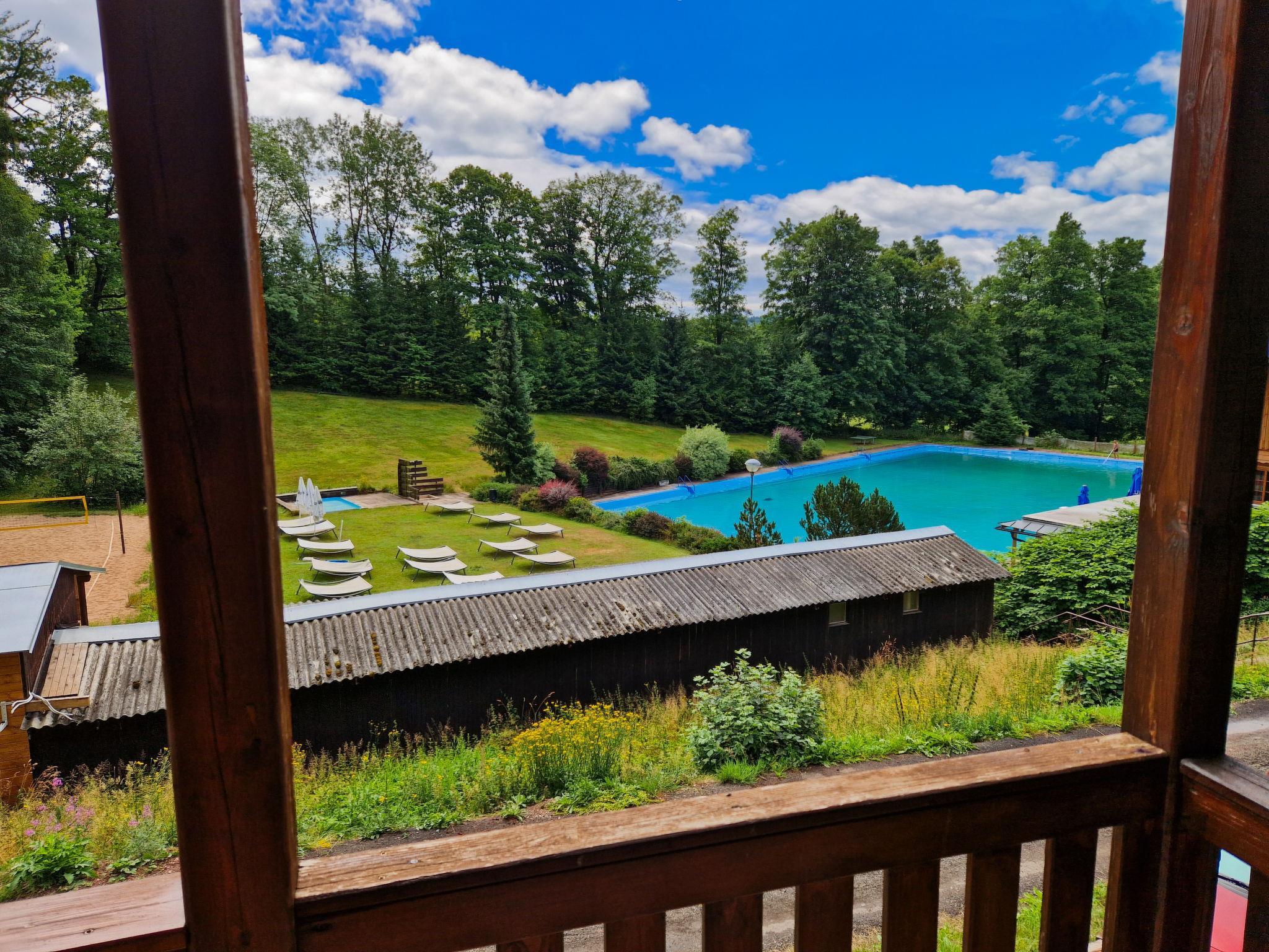 Comfortable bungalow detached. 7 houses in the resort. Outside the resort, in a quiet, sunny position, 50 m from the edge of the forest, 2 km from the skiing area. For shared use: natural state property, lawn for sunbathing, swimming pool (seasonal availability: 26.Jun. - 03.Sep.). Shower/WC in the pool area, table tennis, boccia, badminton, beach volleyball, barbecue, fireplace. Private: patio. In the complex: WiFi, billiard table, storage room for bicycles, sun terrace, storage room for skis. Parking at the house. E-charging station. Grocery 1.5 km, shopping centre 6 km, restaurant 5.5 km, bus stop "Mladé Buky" 1.5 km, railway station "Mladé Buky" 1.5 km, indoor swimming pool 10 km. Golf course (18 hole) 4 km, riding stable 3.5 km, walking paths from the house, cycle lane 50 m, ski rental 2.5 km, ski bus stop 50 m, ski school 2.5 km, children's ski school 2.5 km, sled run 2 km, cross country ski track 500 m, children's playground 50 m. Nearby attractions: zábavní park Balduv svet, 2.5 km, Rozhledna Eliška, tvrz Stachelberg 9 km, Stezka Korunami stromu Janské Lázne 10 km, Lanovka na Snežku, Pec pod Snežkou 18 km, Zoo Dvur Králové, Adršpach 28 km, Vyhlídkové lety Vrchlabí, Kuks 30 km. Well-known ski regions can easily be reached: Mladé Buky 2 km, Janské Lázne 9 km, Cerný Dul, Pec-Cerná hora 15 km. Hiking paths: Krkonošský národní park. Please note: the photograph shows a typical example.