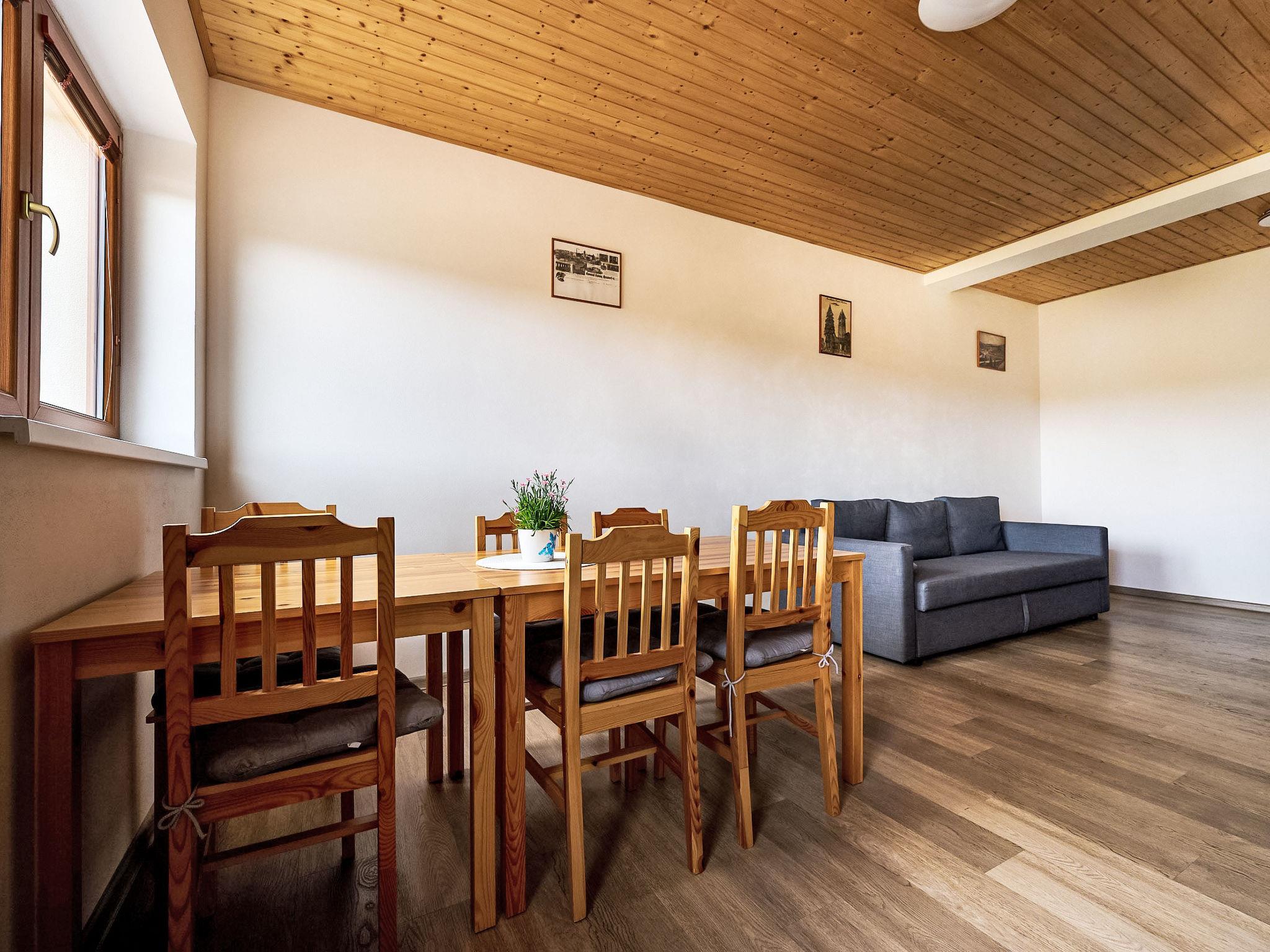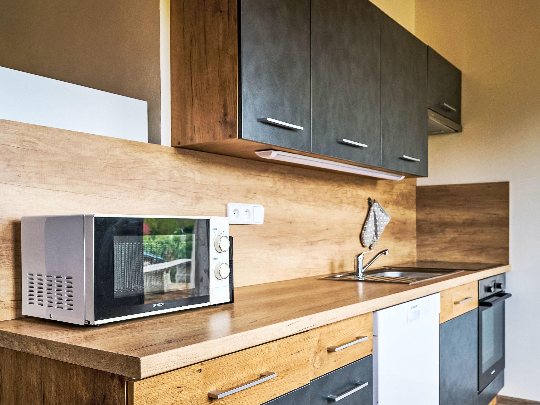 2-room apartment on the ground floor. Modern furnishings: open living room with panoramic window with 1 sofabed and TV. Exit to the terrace. 1 room with 2 beds and 1 x 1 bunk beds. Kitchenette (oven, dishwasher, 4 ceramic glass hob hotplates, kettle, microwave, freezer, electric coffee machine) with dining table. Shower/WC. Floor heating. Terrace furniture, barbecue. Facilities: washing machine. Internet (WiFi). Please note: suitable for families. Non-smokers only.
